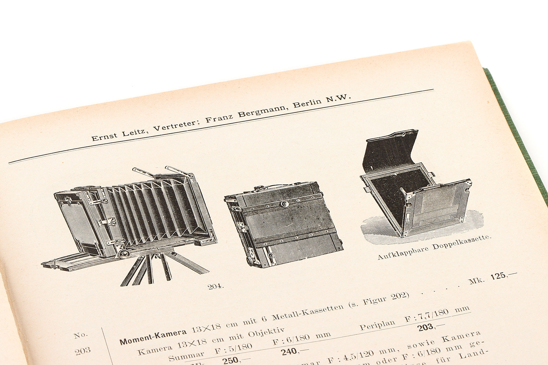 The camera's historical significance is underscored by a petite ivory plaque adorning the front, bearing the inscription 'E. Leitz, Opt. Mech. Werkstätte, Wetzlar.' The wooden body exhibits exceptional craftsmanship, evident in a selection of matching wood panels and aligned slots of the screws. Accompanying this rare find is an authentic Bergmann catalogue dating back to circa 1905, showcasing similar Reise Kamera and Moment Kamera models, along with an array of photographic lenses and accessories. Completing this ensemble is an exceedingly rare, period-correct Leitz Periplan 220mm lens, enhancing the allure of this remarkable piece of photographic history.