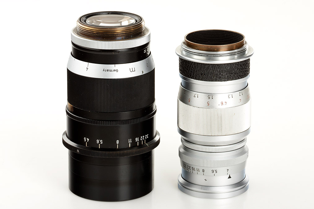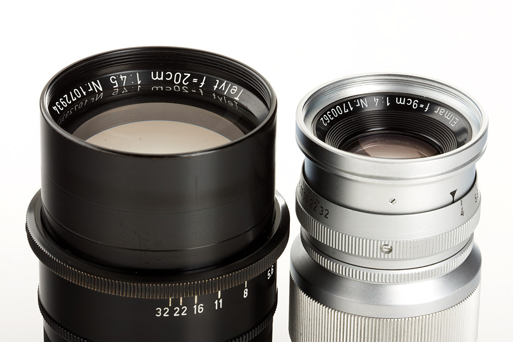 (1) Elmar E39 4/9cm no.1700362 in good condition (both caps), (2) Telyt 4.5/20cm no.1072934 in excellent condition (cap, hood, keeper) (2)