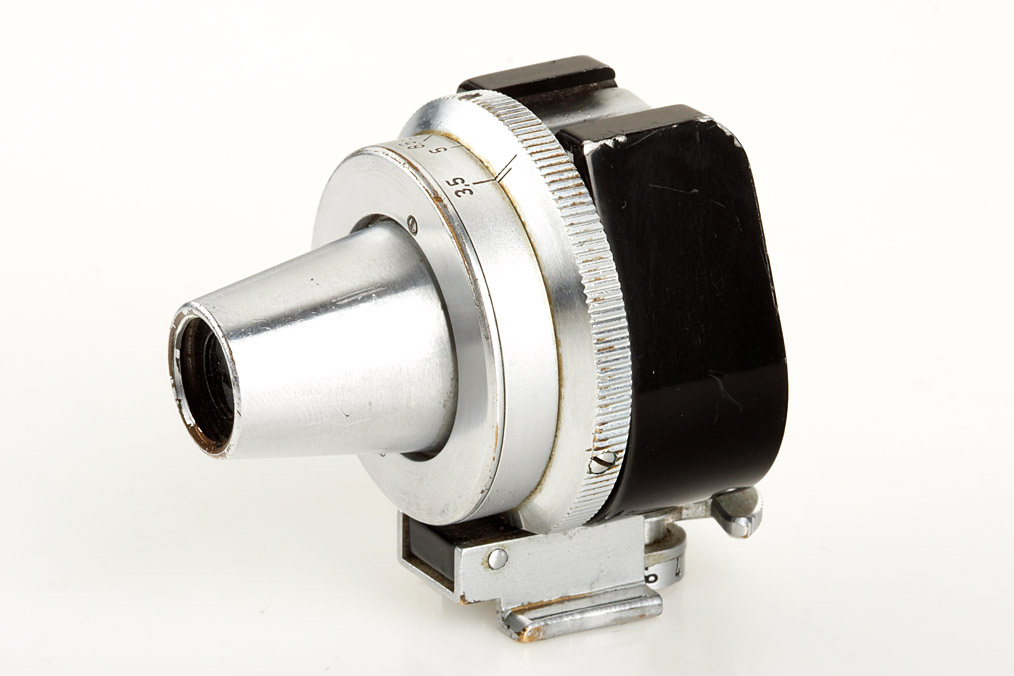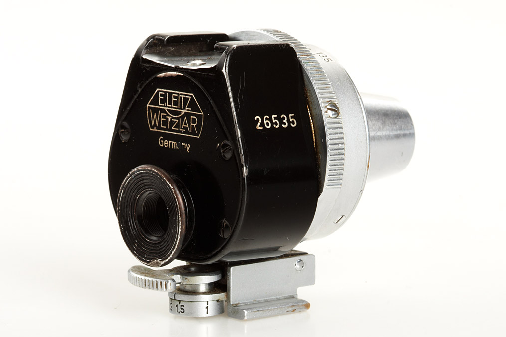 (1) chrome collapsible Summar 2/5cm no.350885, (2) black/chrome Elmar 4/9cm no.519231, VIOOH universal finder no.26535, 3 Leitz A36 filters in keepers (yellow 1, green, UVa) - all in good condition