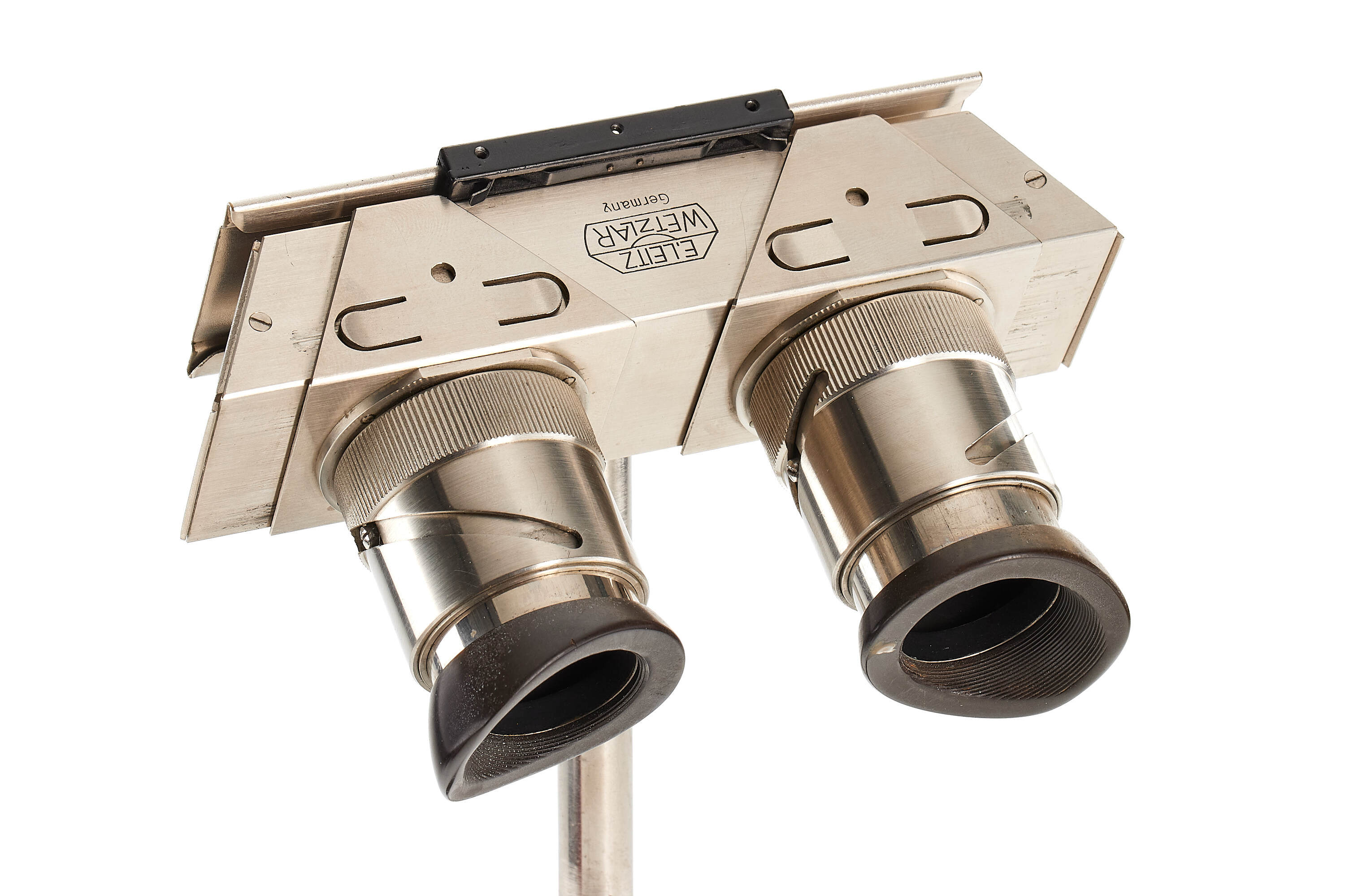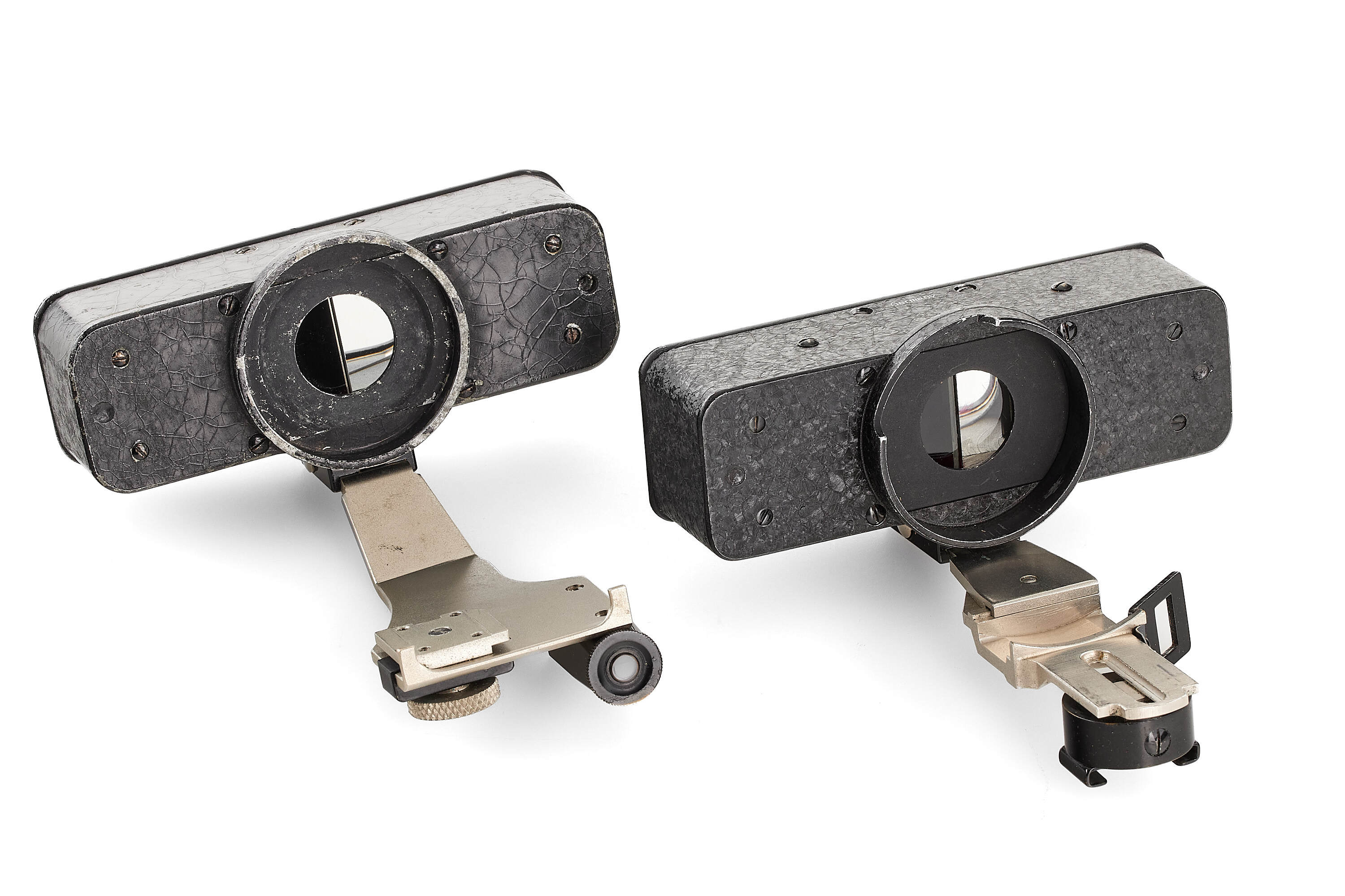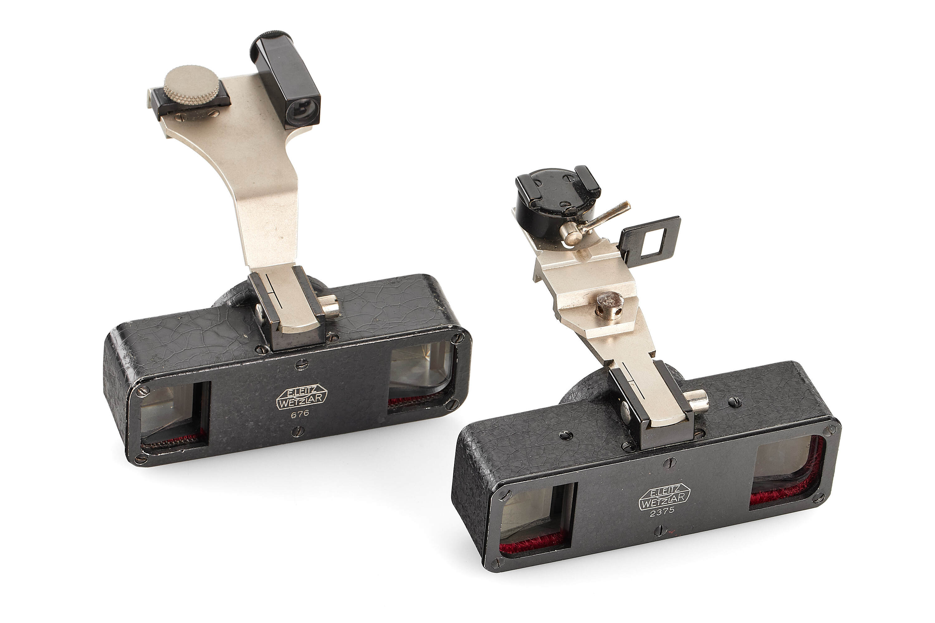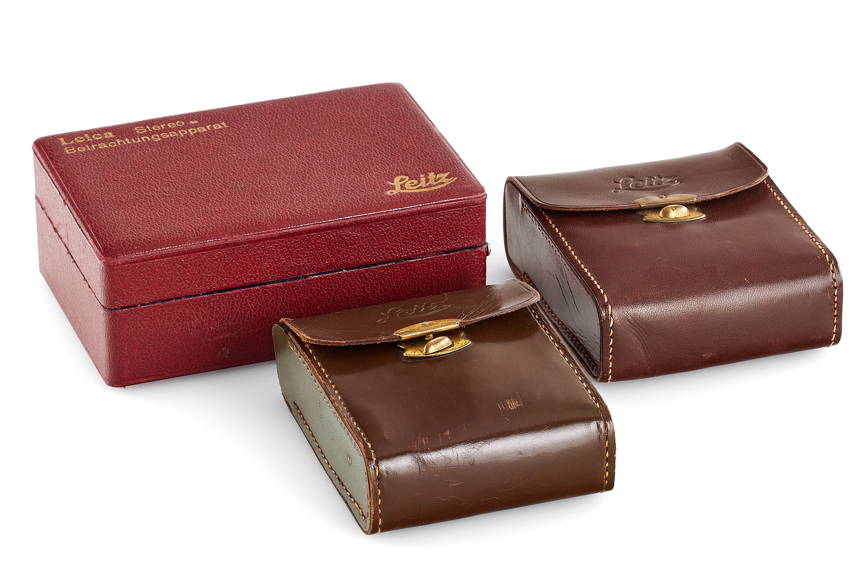 A set of Leitz stereo accessories from the Stereoly system, comprising a boxed VOTRA stereo viewer with VOTIV stand, a Stereoly attachment for Leica Standard no.676 with case and arm, and a Stereoly attachment for Leica II/III no.2375, also complete with arm and case. All in excellent condition.