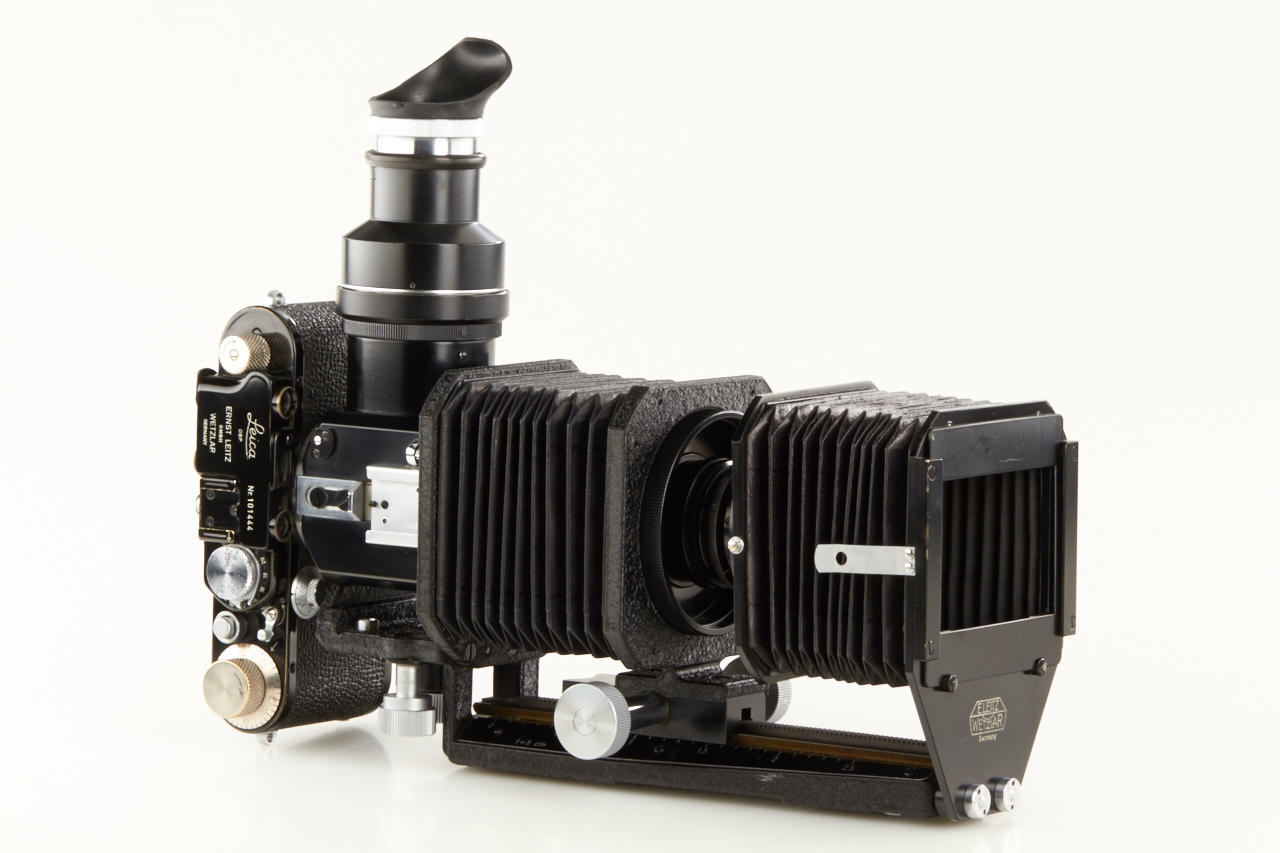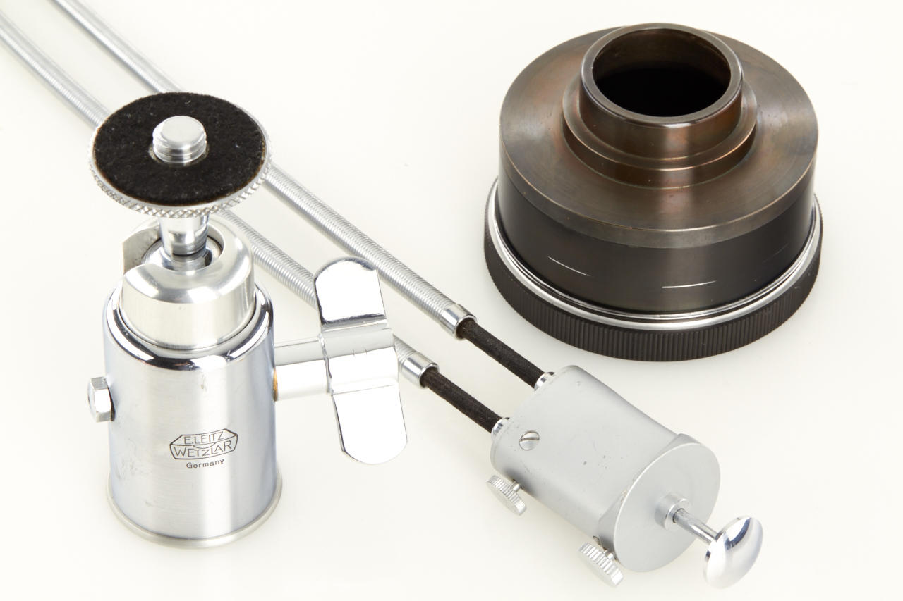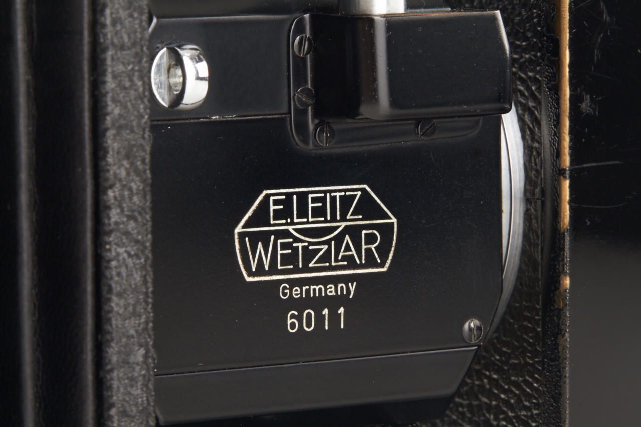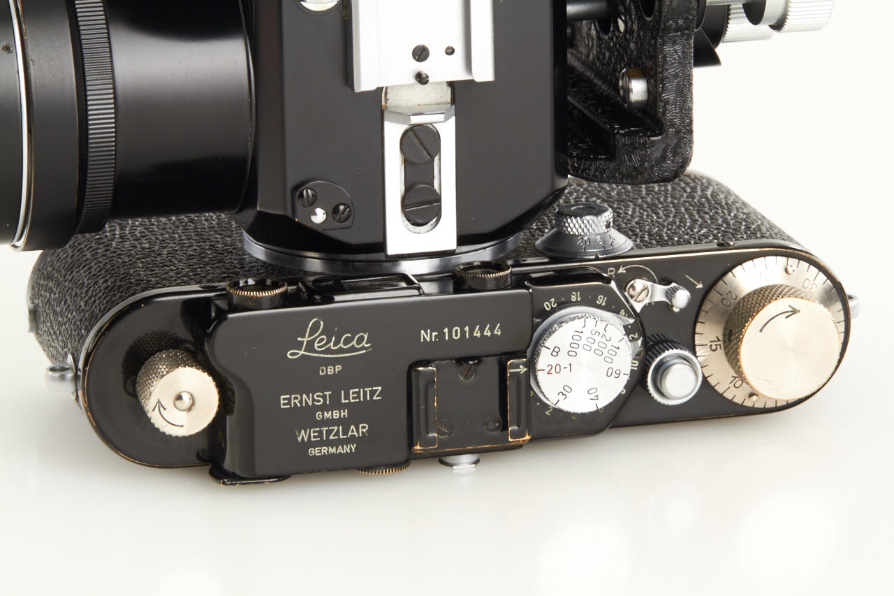 bellows focusing device UXOOR no.2039 with PLOOT mirror reflex housing and OOZAB focusing slide, incl. early Leica Standard no.101444 upgraded to III (f) in 1950's, black Elmar 4/9cm lens head no.454787, OZWTO double cable release and KGOON ball head - all in fitted wooden case