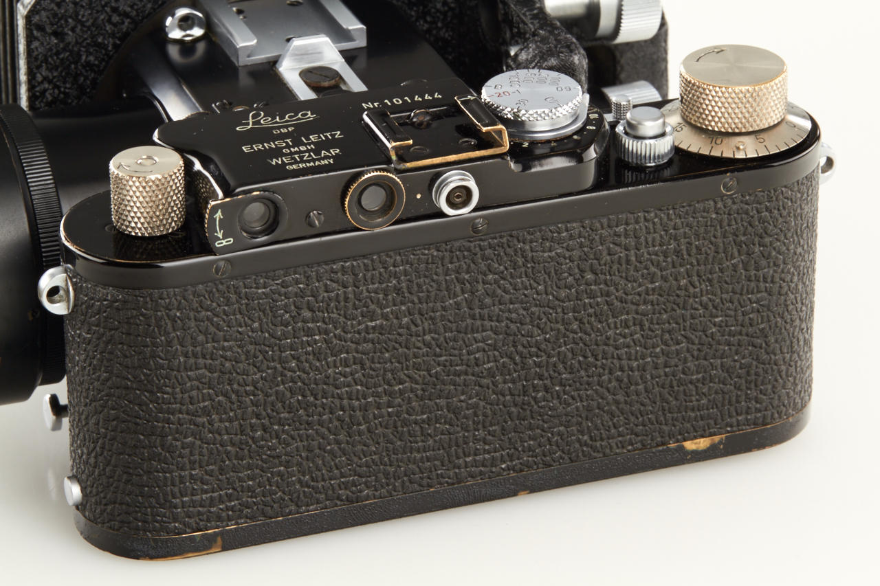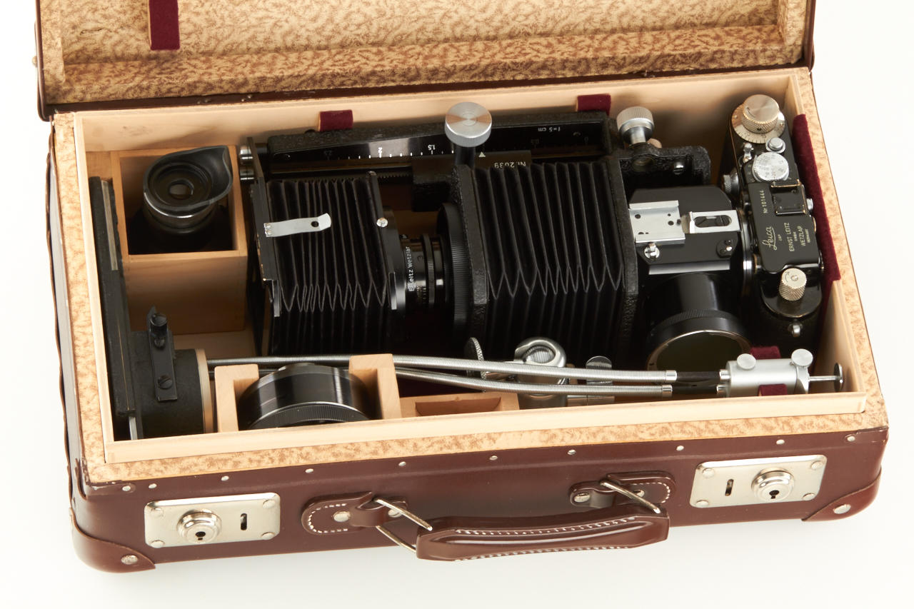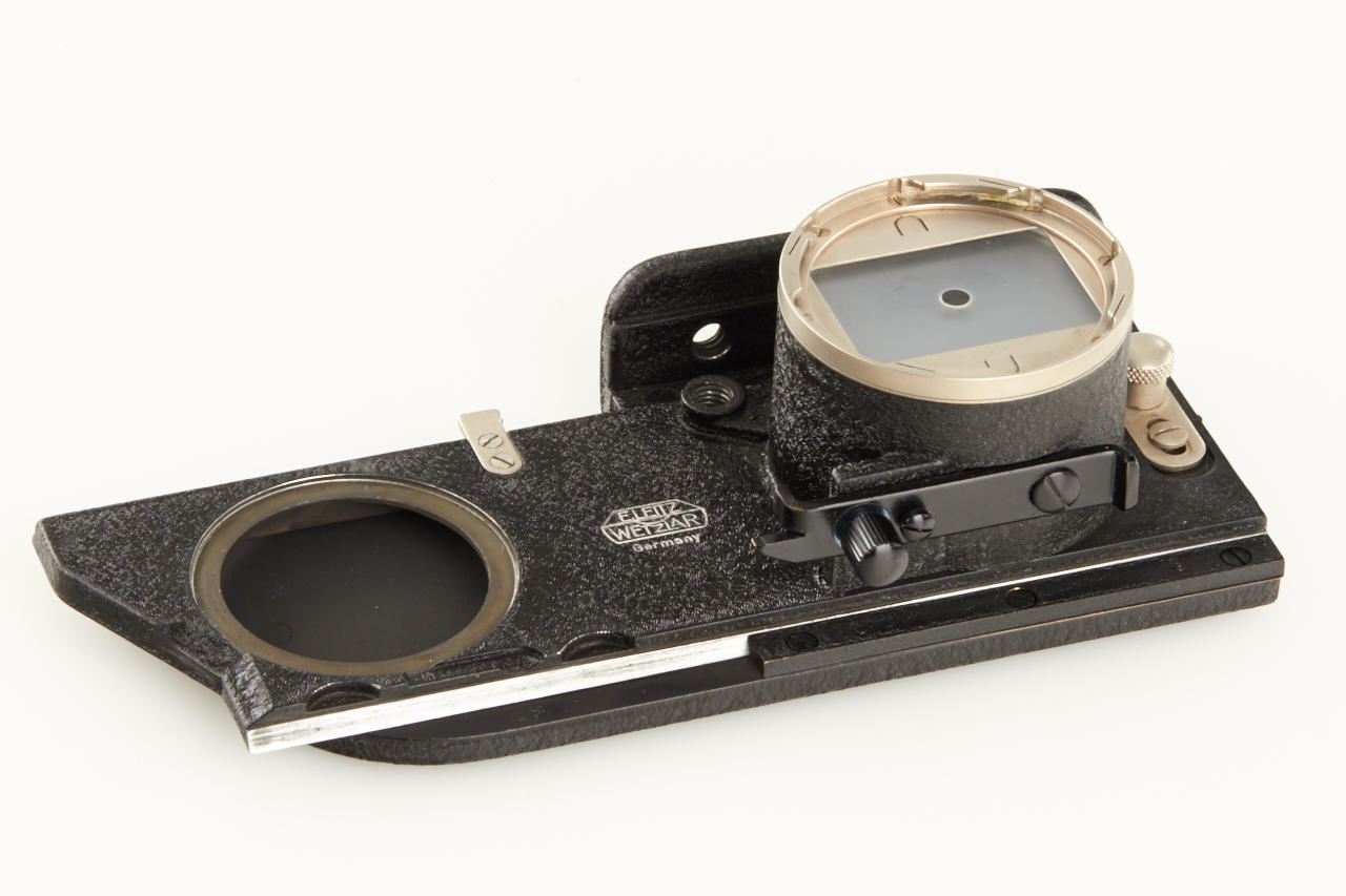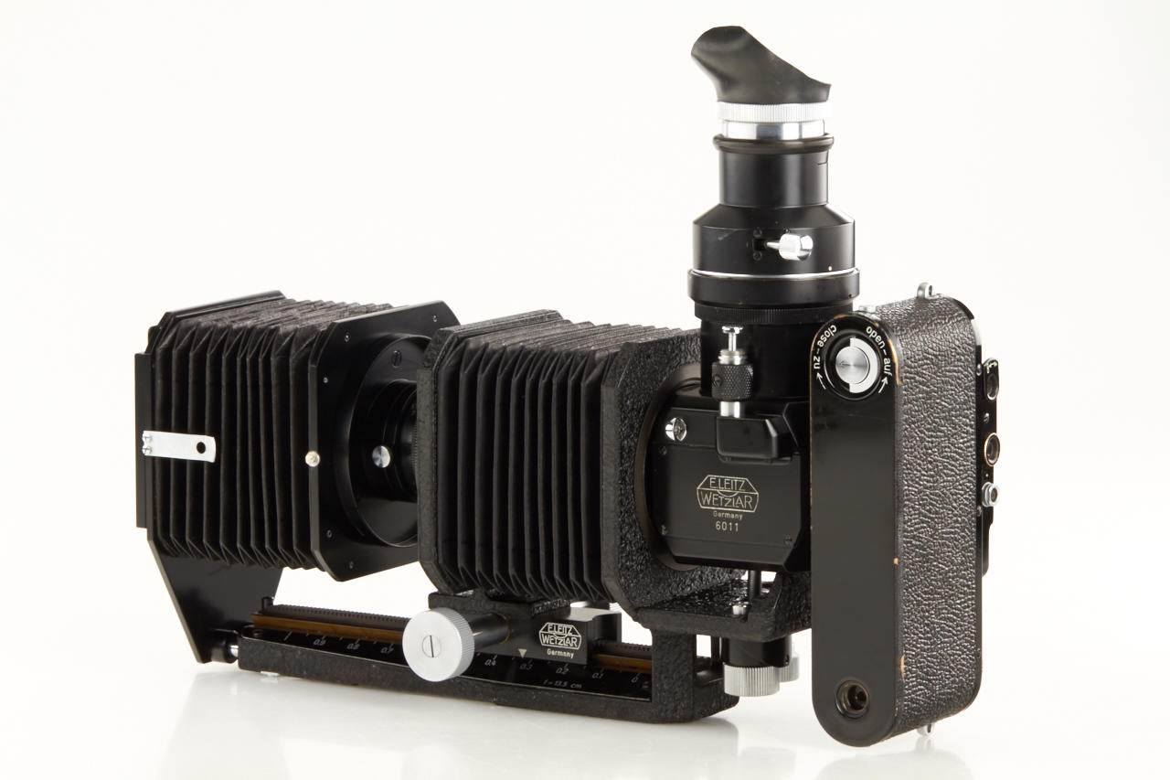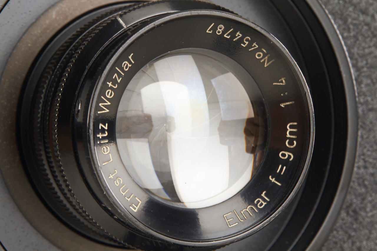 bellows focusing device UXOOR no.2039 with PLOOT mirror reflex housing and OOZAB focusing slide, incl. early Leica Standard no.101444 upgraded to III (f) in 1950's, black Elmar 4/9cm lens head no.454787, OZWTO double cable release and KGOON ball head - all in fitted wooden case