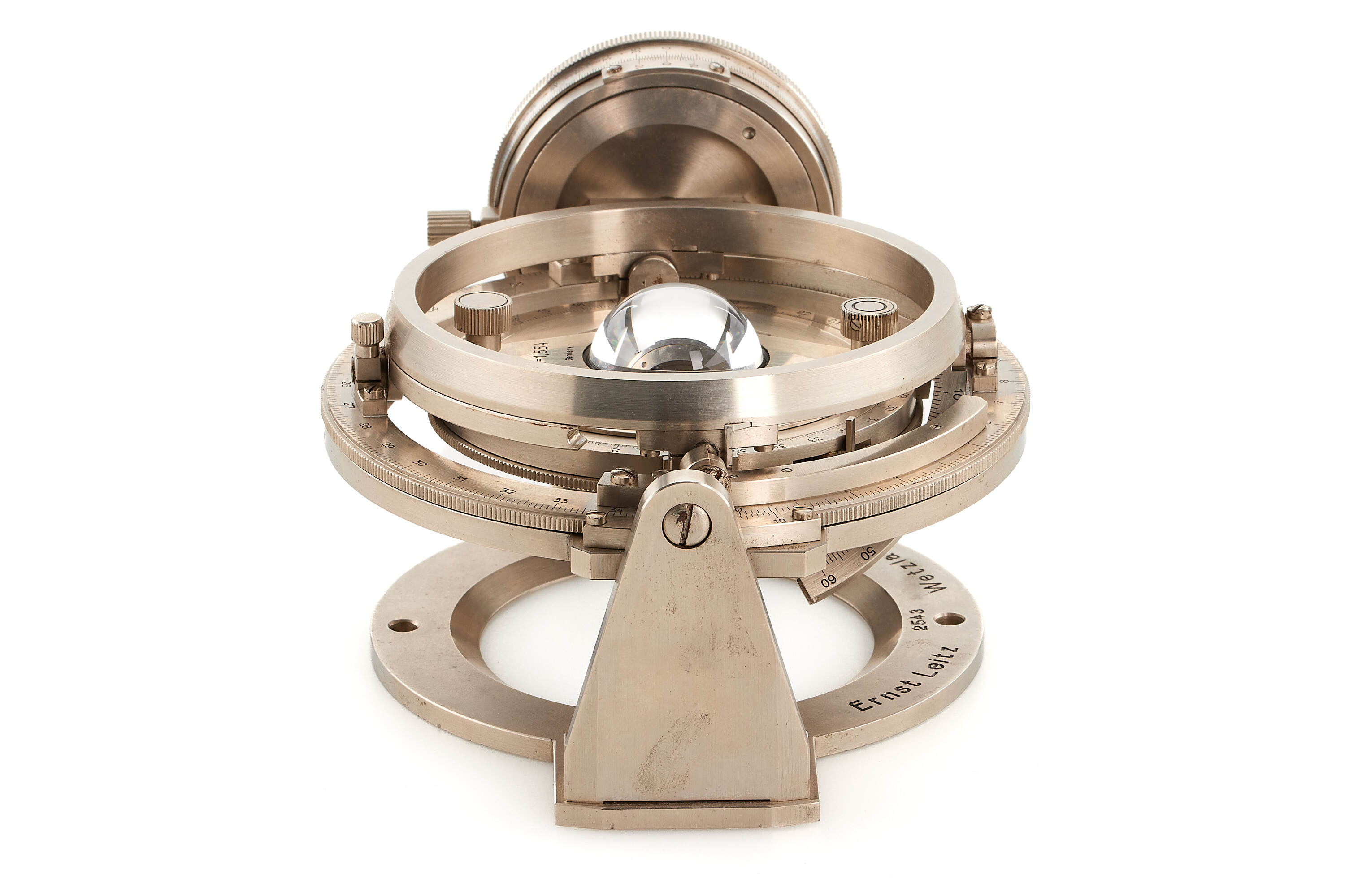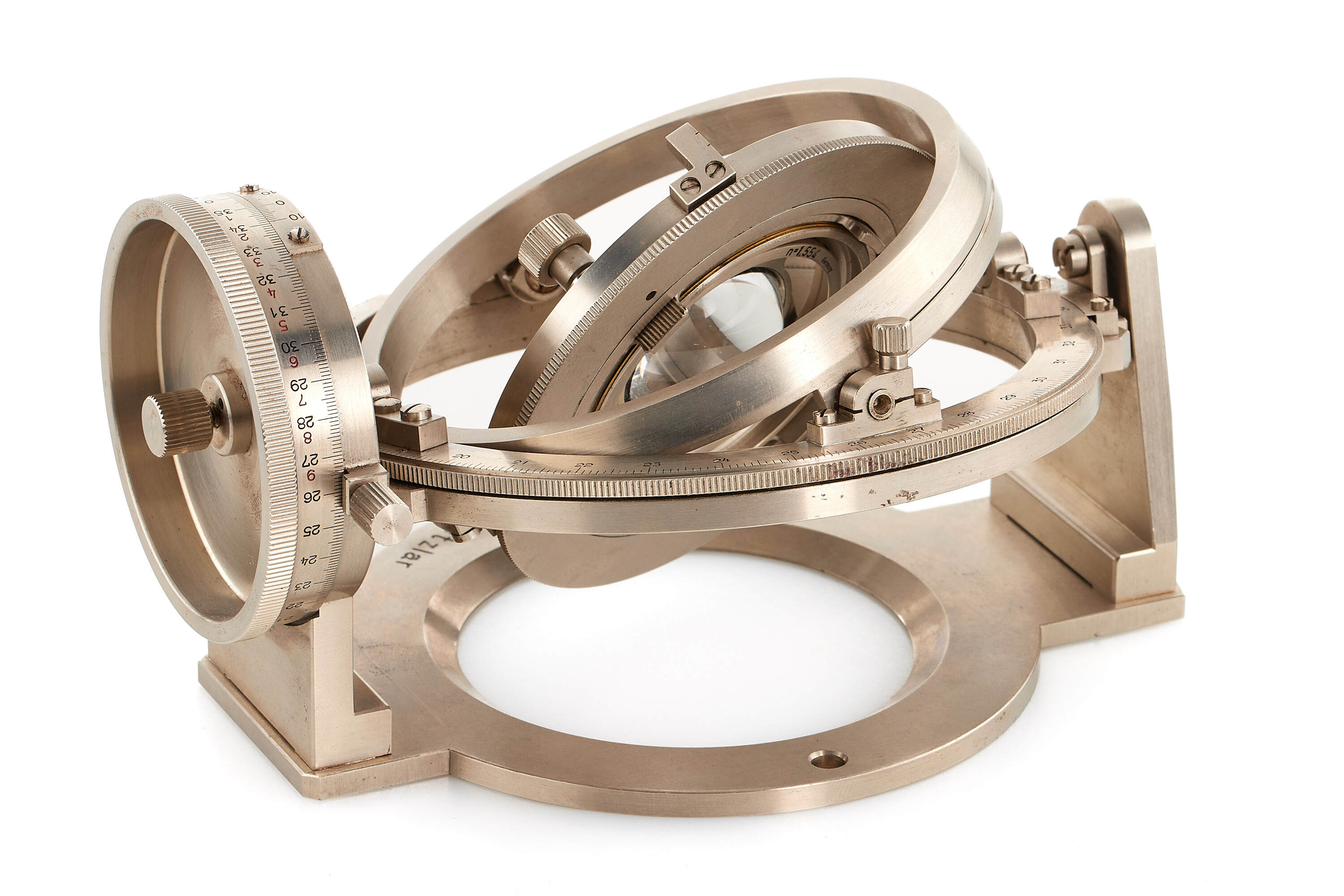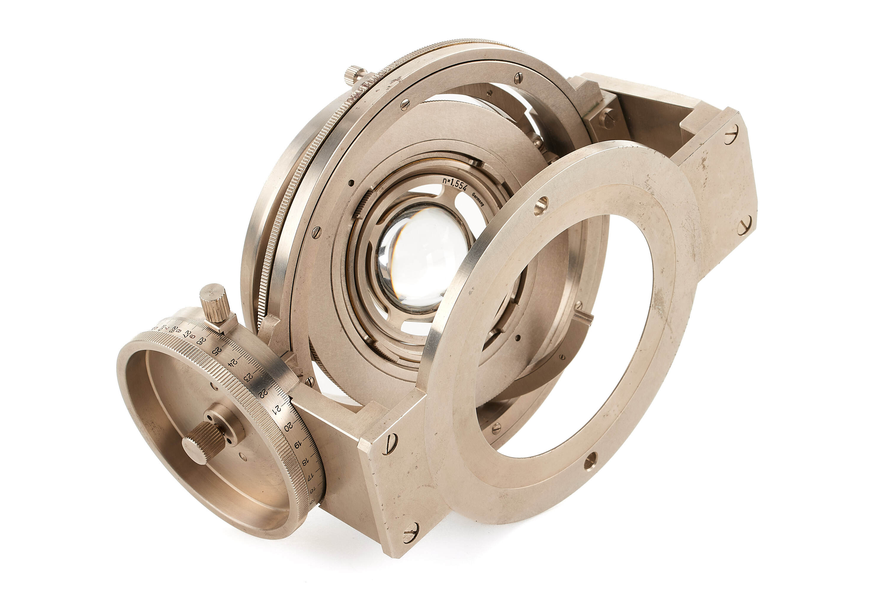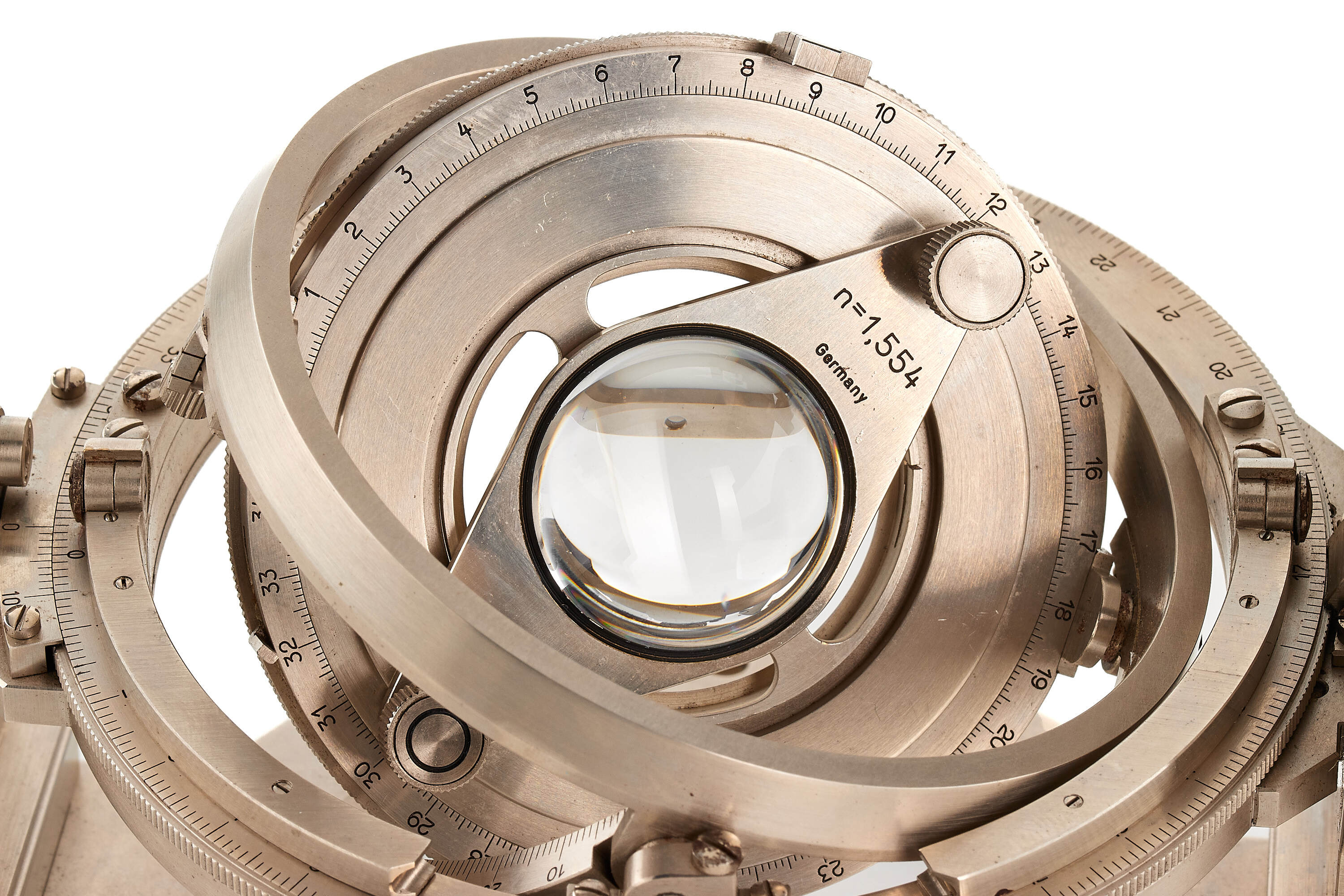 Rare interesting Universal Stage in nickel finish, with n=1.554 segment pair, used in mineralogy on a microscope, in almost mint condition.