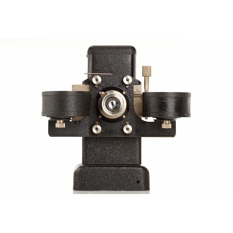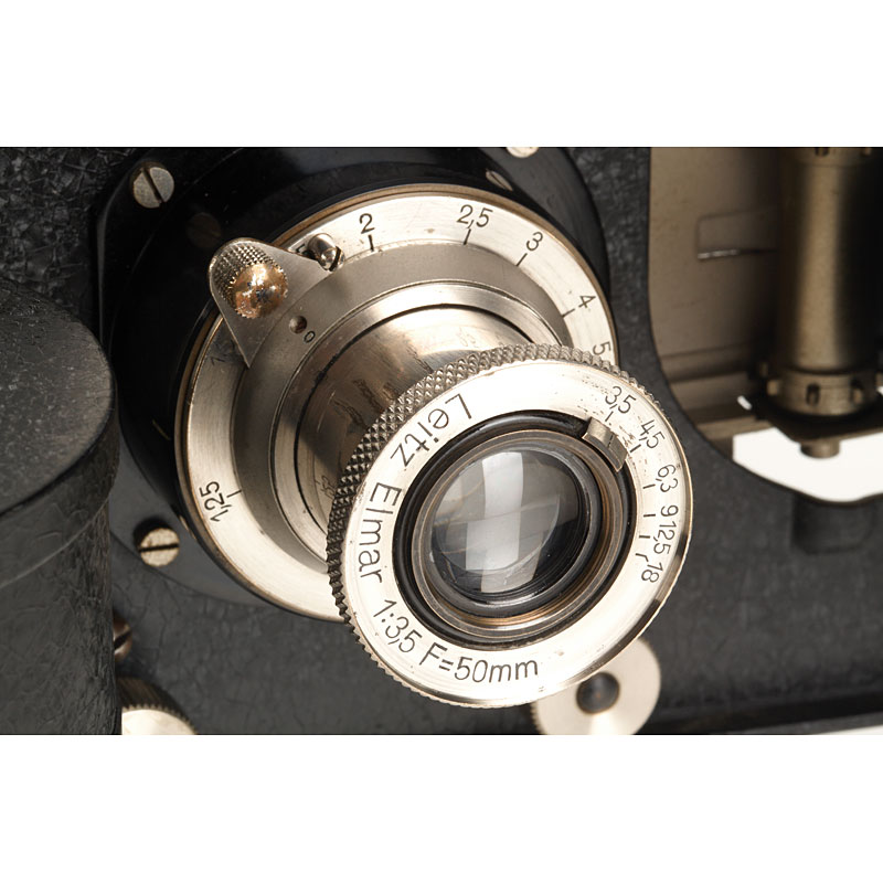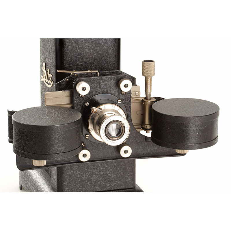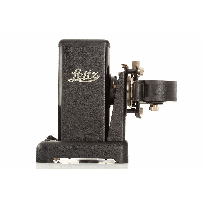 early Leitz projector with half-automatic film transport in very fine condition with two large film chambers, complete with condenser for 5cm lenses and matching nickel Elmar 3.5/5cm without serial number (code 'Ubeladoko')