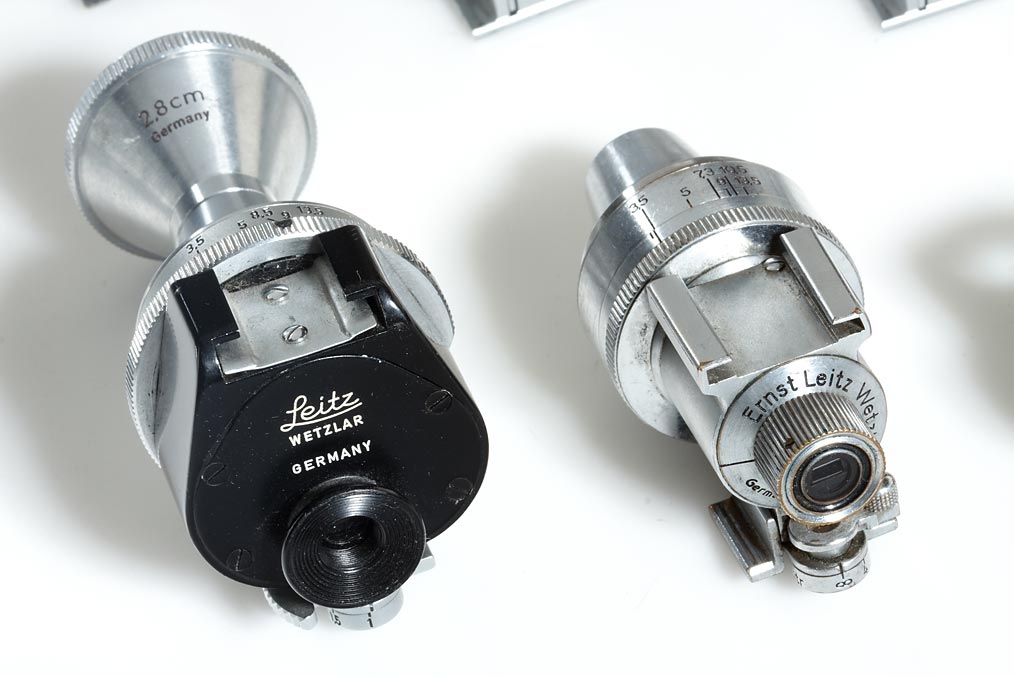 SBOOI 5cm finder, rare SGOOD 8.5cm finder, rare SOOUT 9cm cradle type finder, SHOOC 13.5cm finder, VIDOM chrome (3.5, 5, 7.3, 9, 10.5, 13.5, cond. B), VIOOH no.99945 (3.5, 5, 8.5, 9, 13.5), TUVOO 2.8cm attachment - all finders are engraved Germany and meter scale (7)