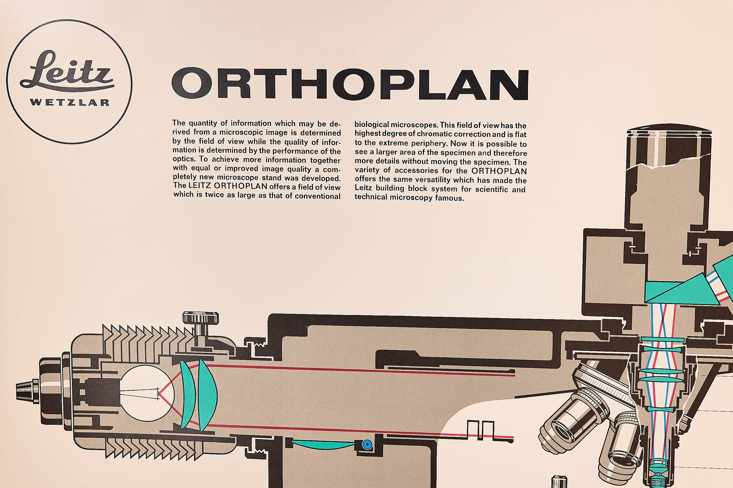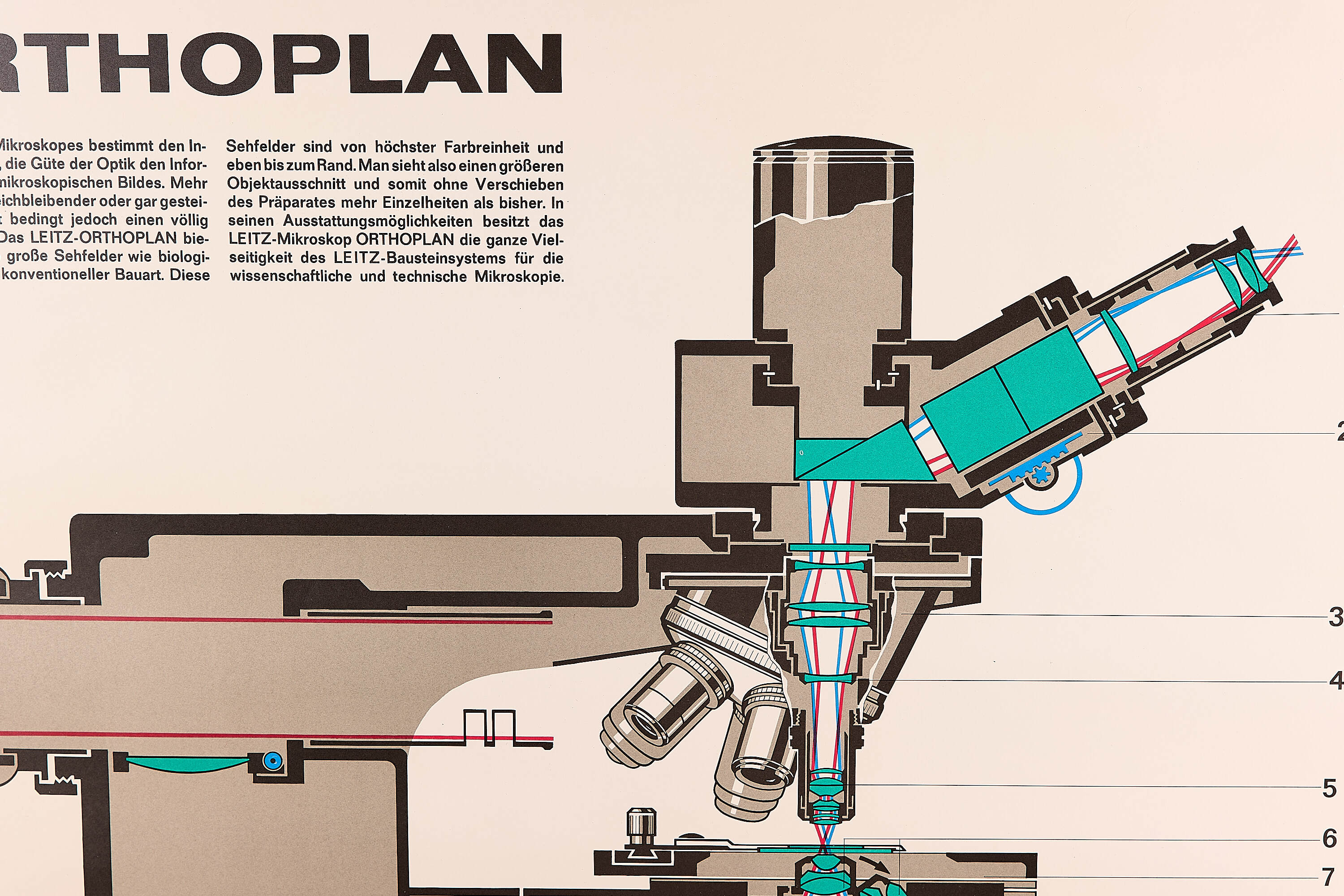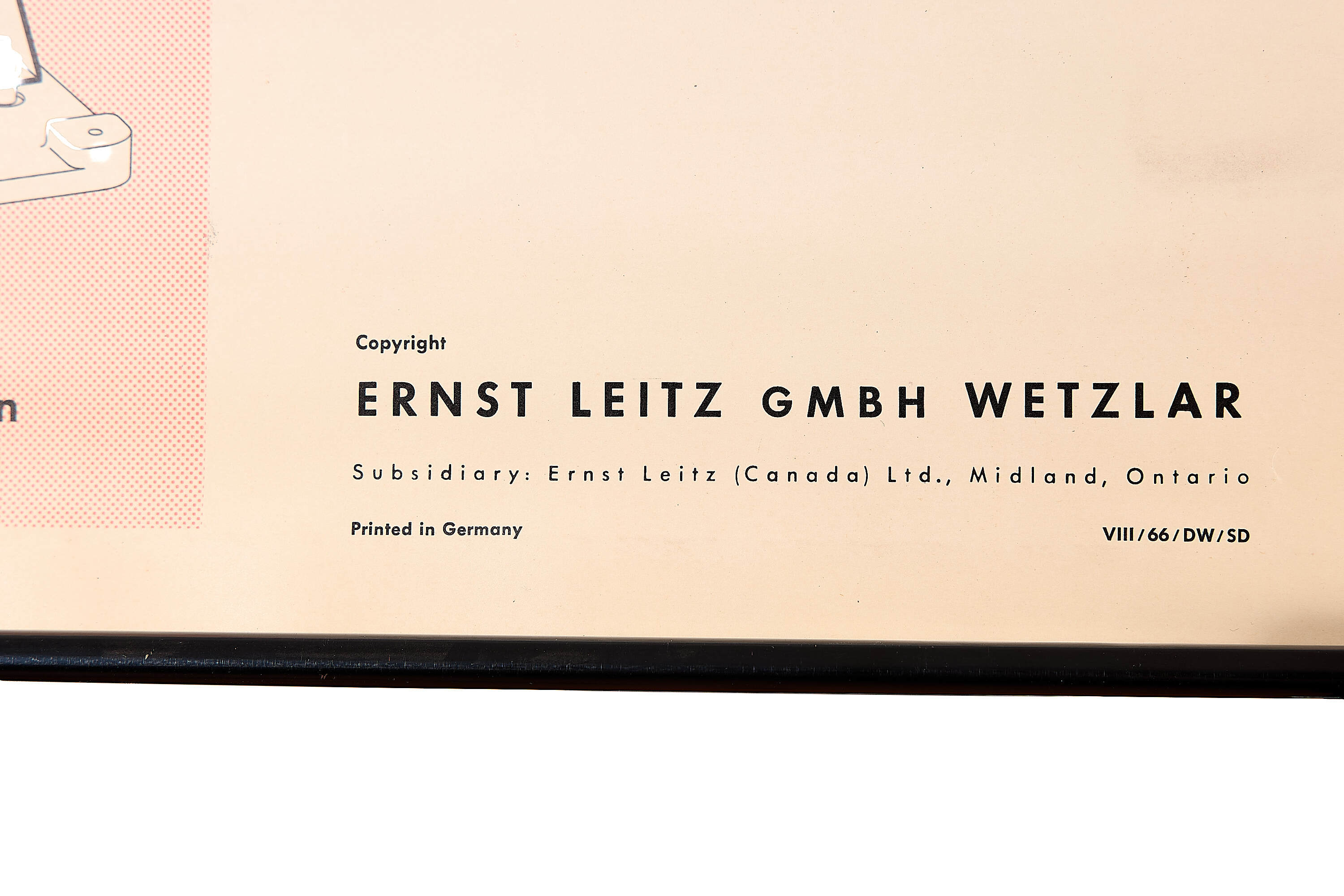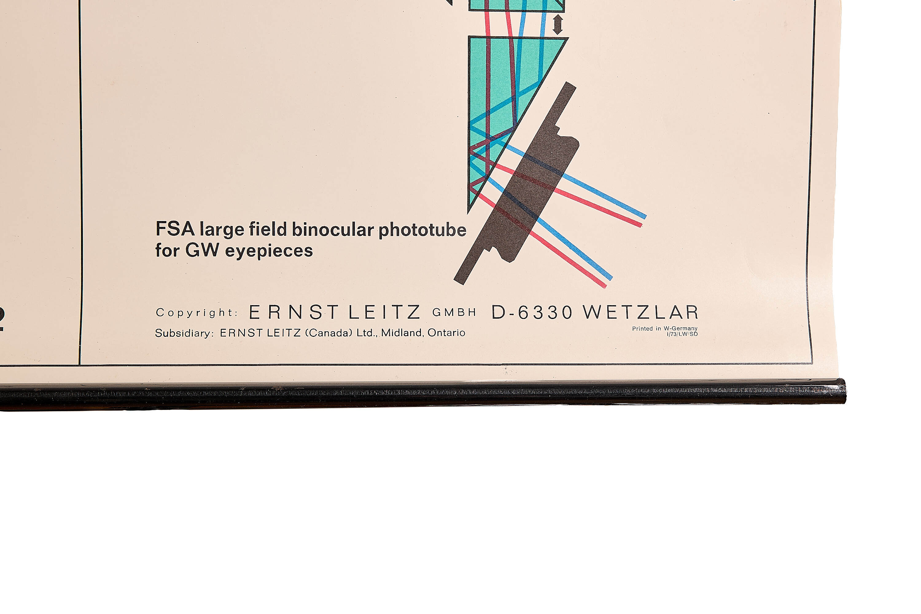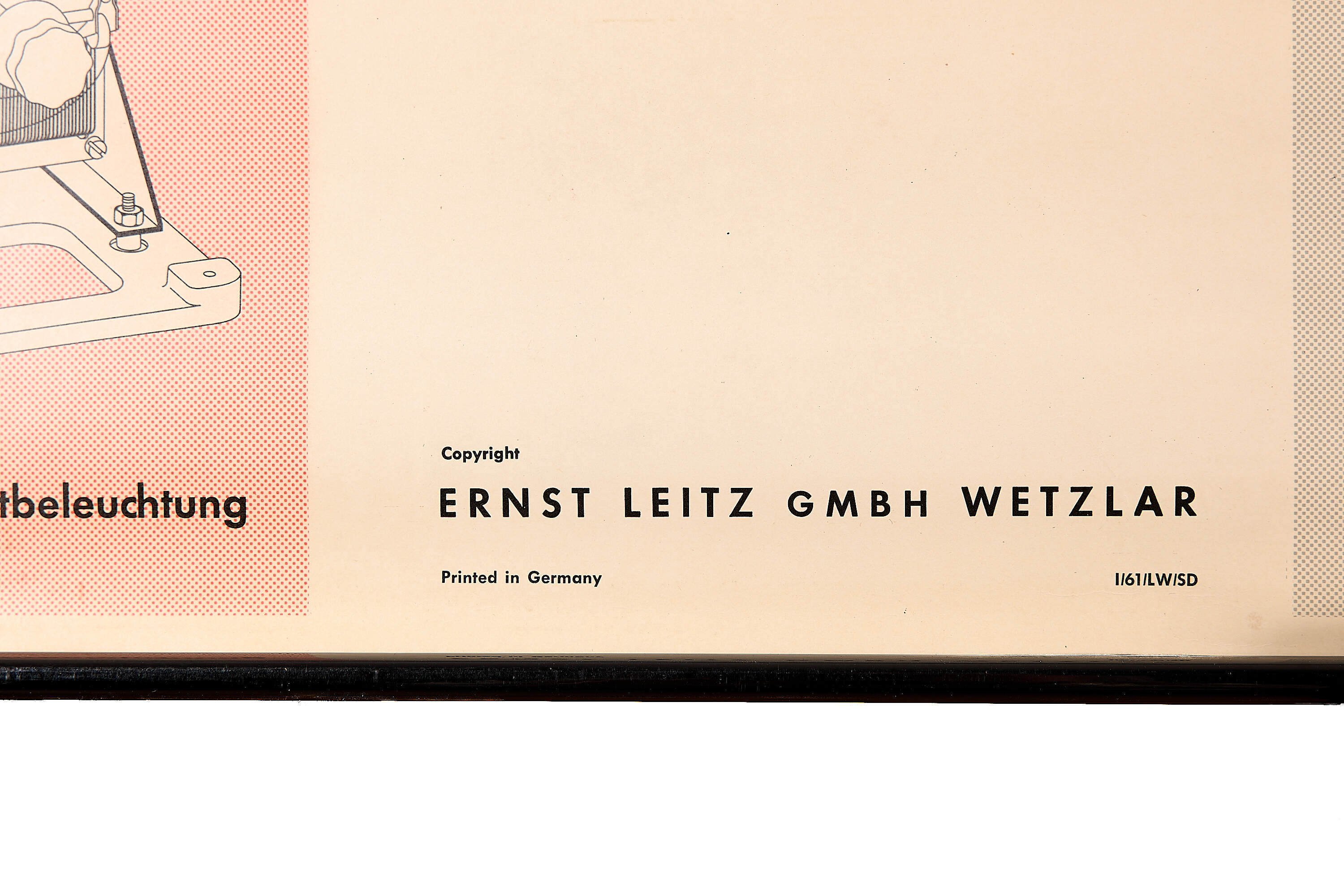 A set of 7 original Leitz wall charts, printed paper ca. 120x80cm in beautiful, near mint condition, showing an Optical Bench Comparator, Large Universal Toolmaker's Microscope and Orthoplan Microscope, 3x in German and 3x in English, and wall chart showing the second version Leica M2, rare version in Spanish.