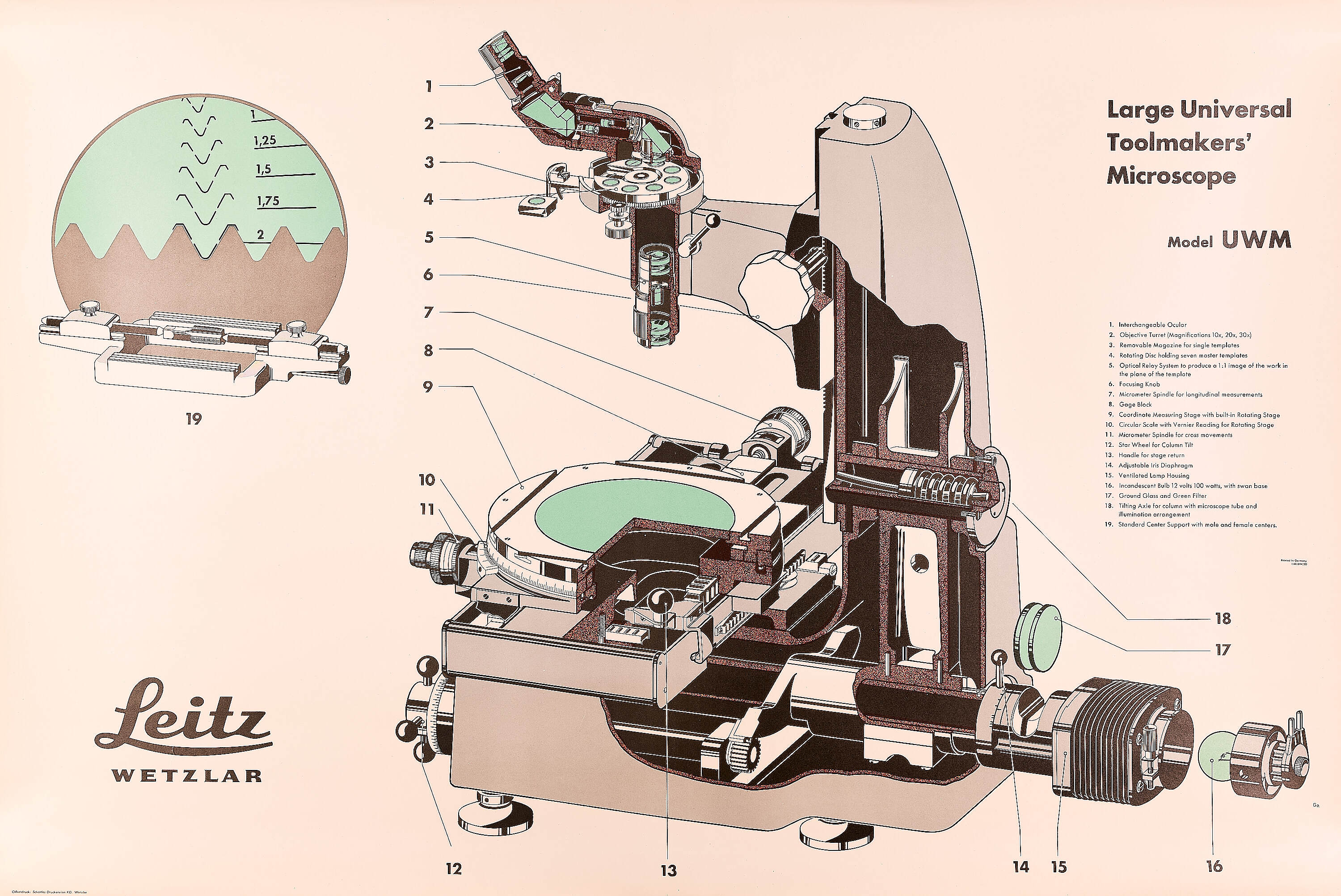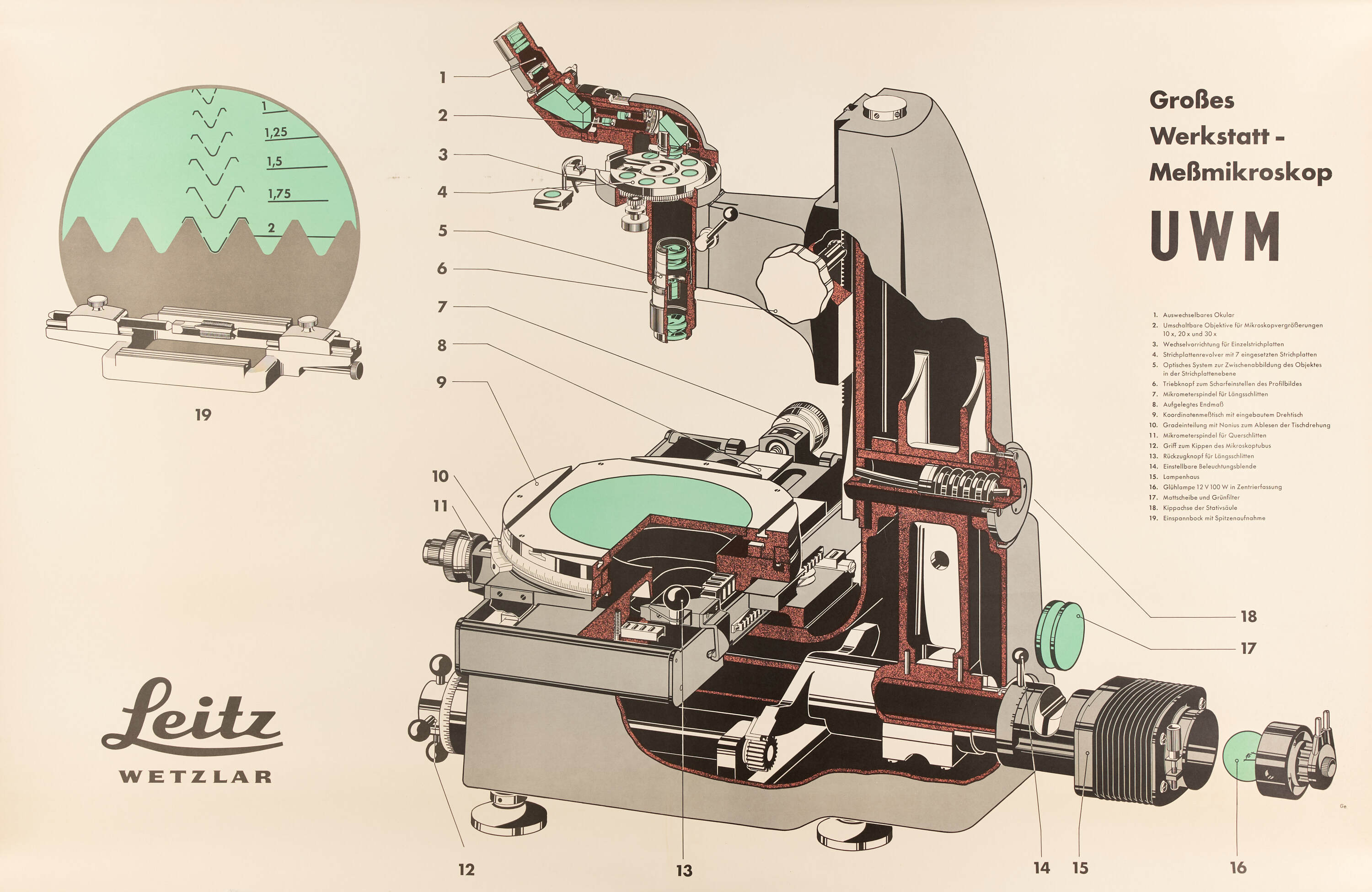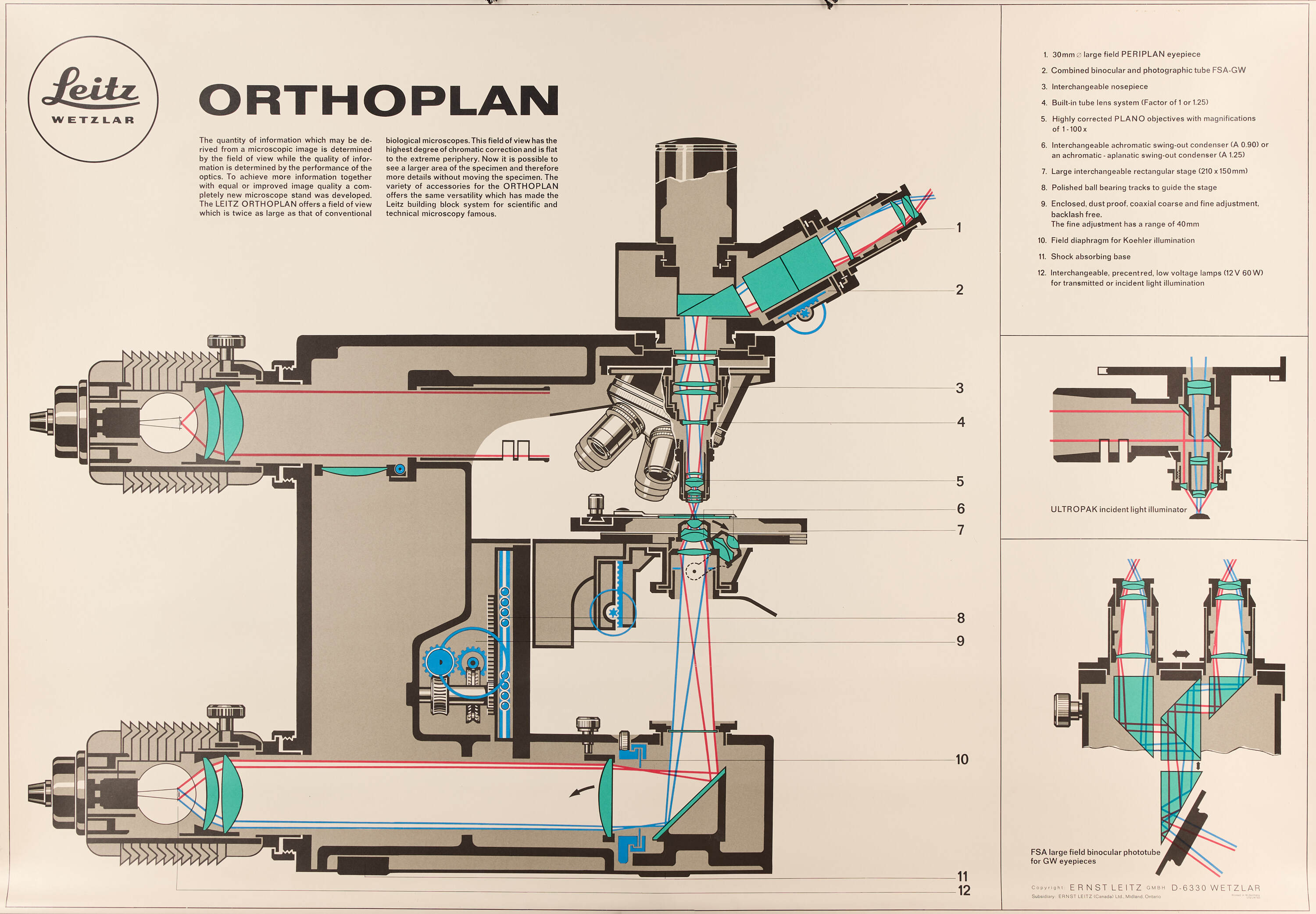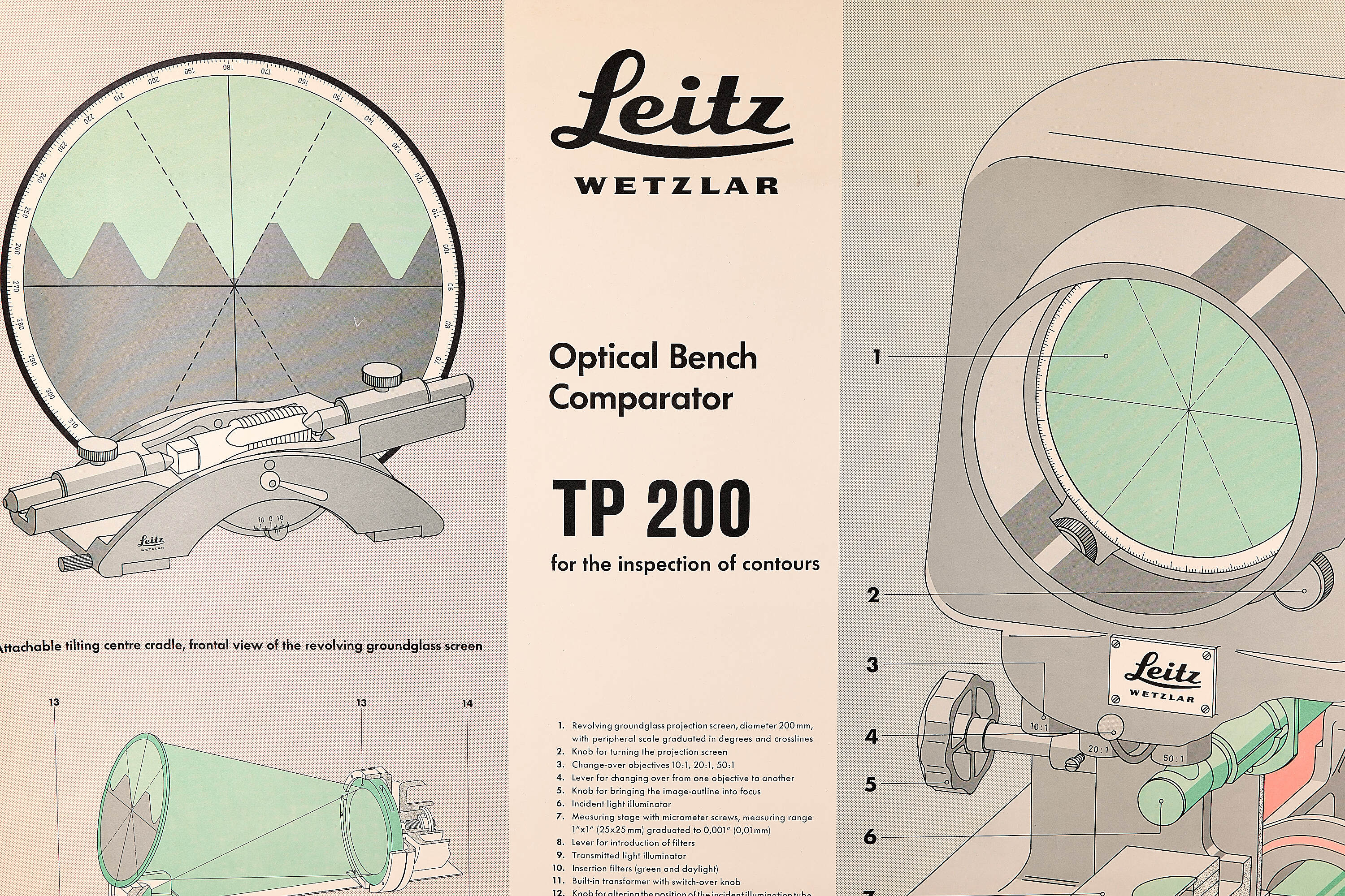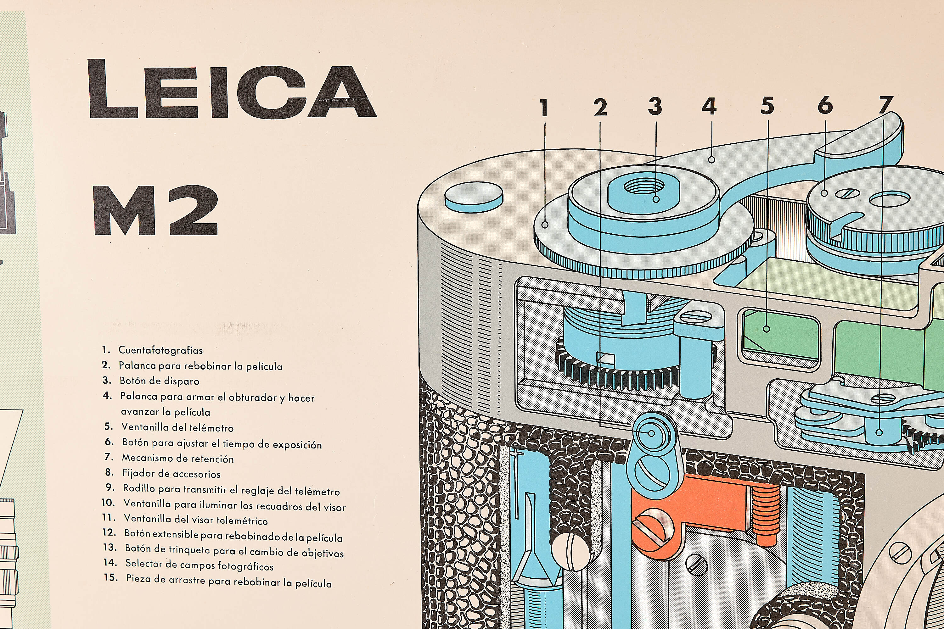 A set of 7 original Leitz wall charts, printed paper ca. 120x80cm in beautiful, near mint condition, showing an Optical Bench Comparator, Large Universal Toolmaker's Microscope and Orthoplan Microscope, 3x in German and 3x in English, and wall chart showing the second version Leica M2, rare version in Spanish.