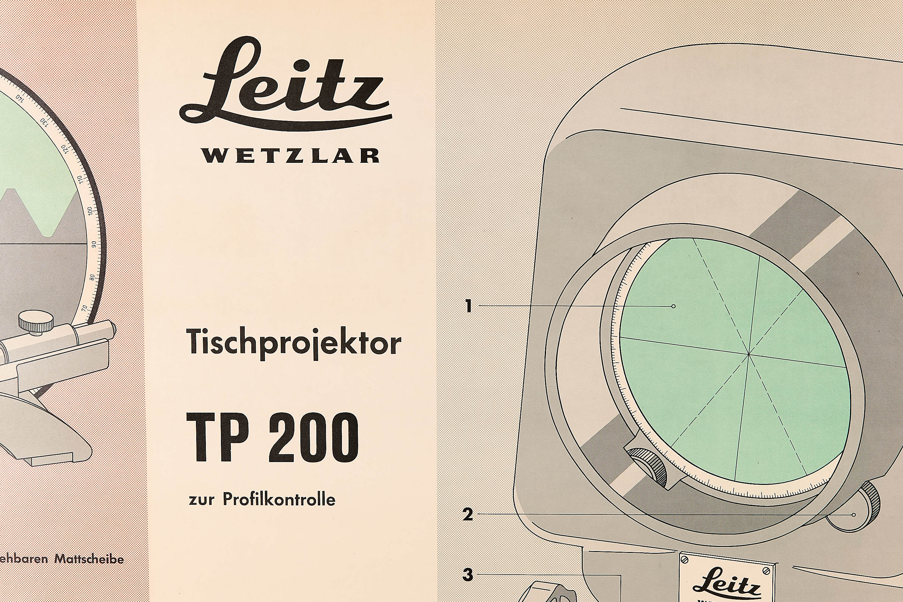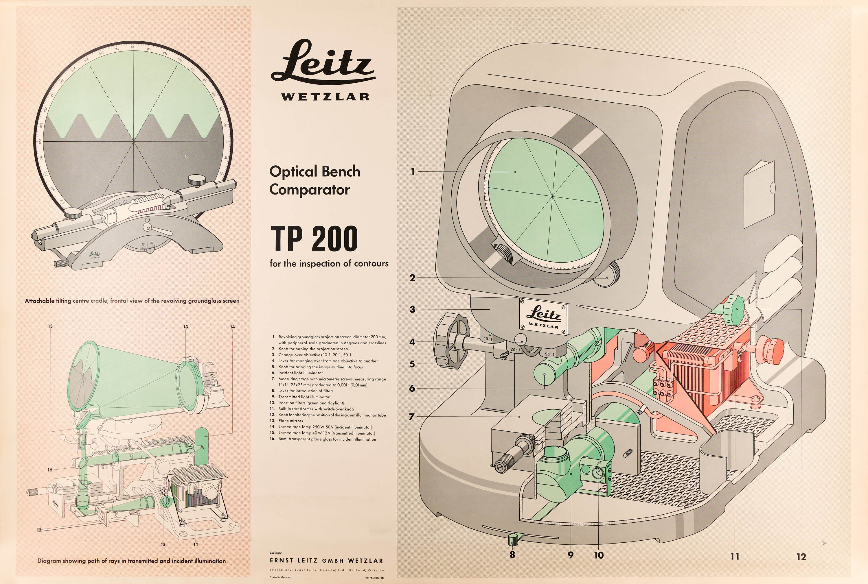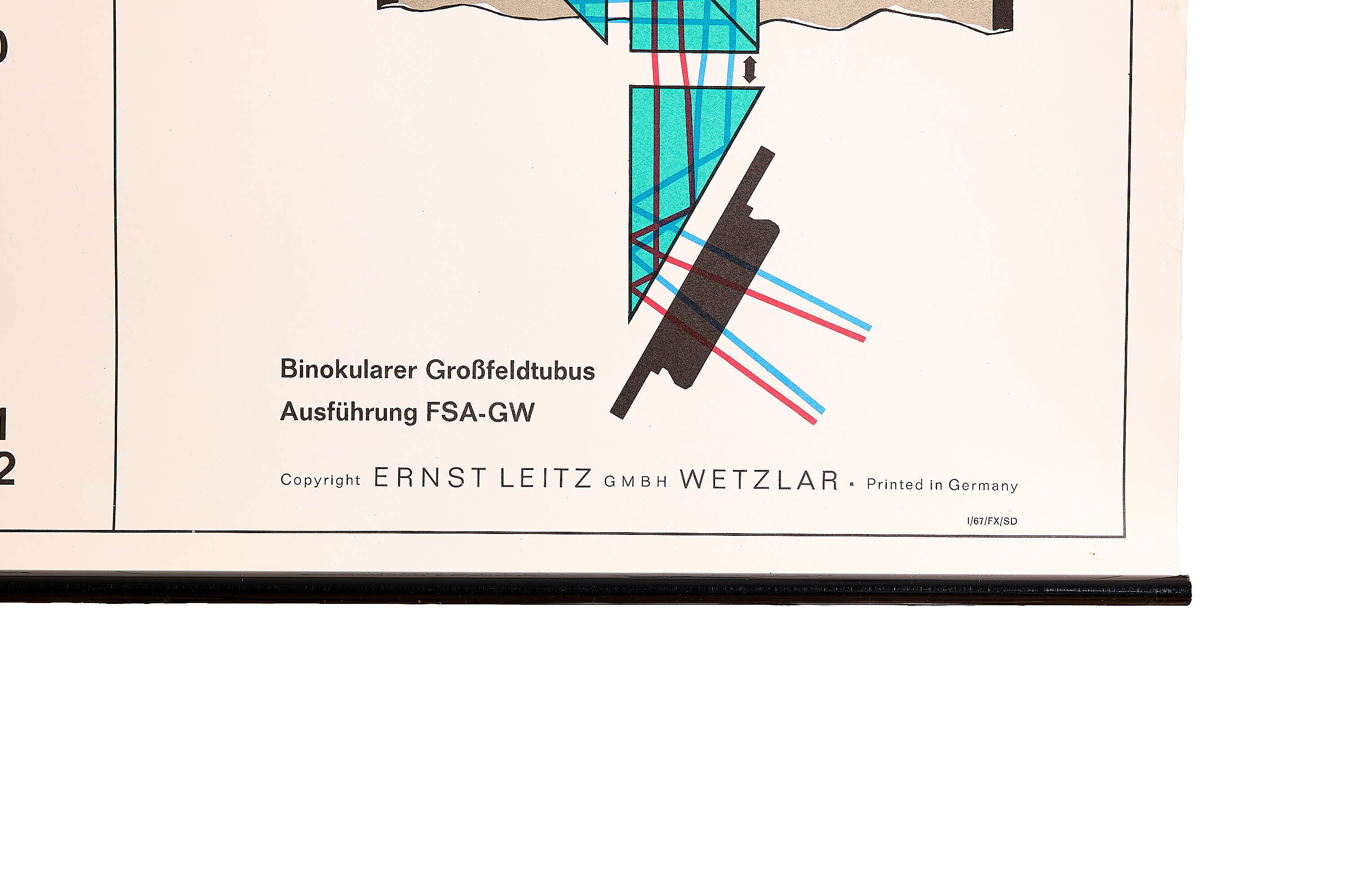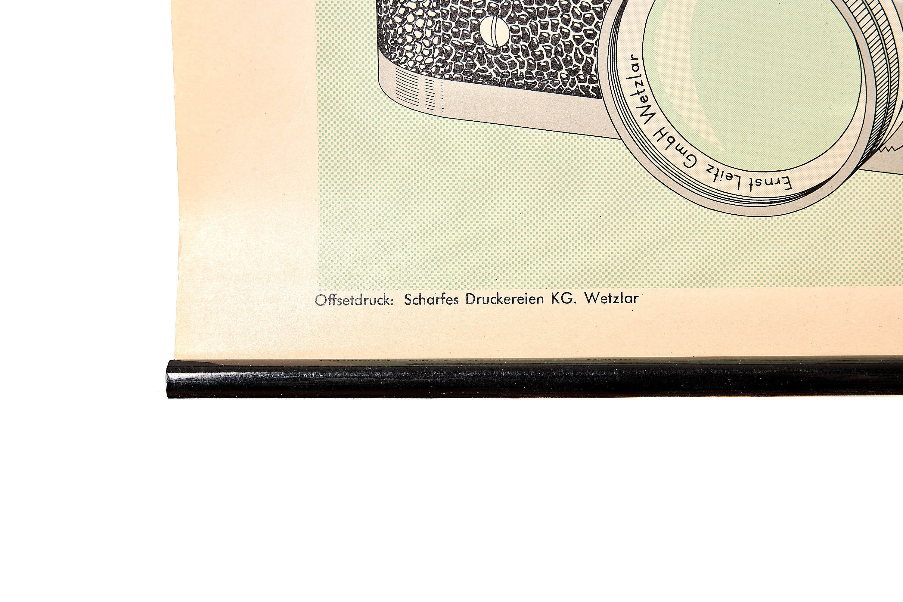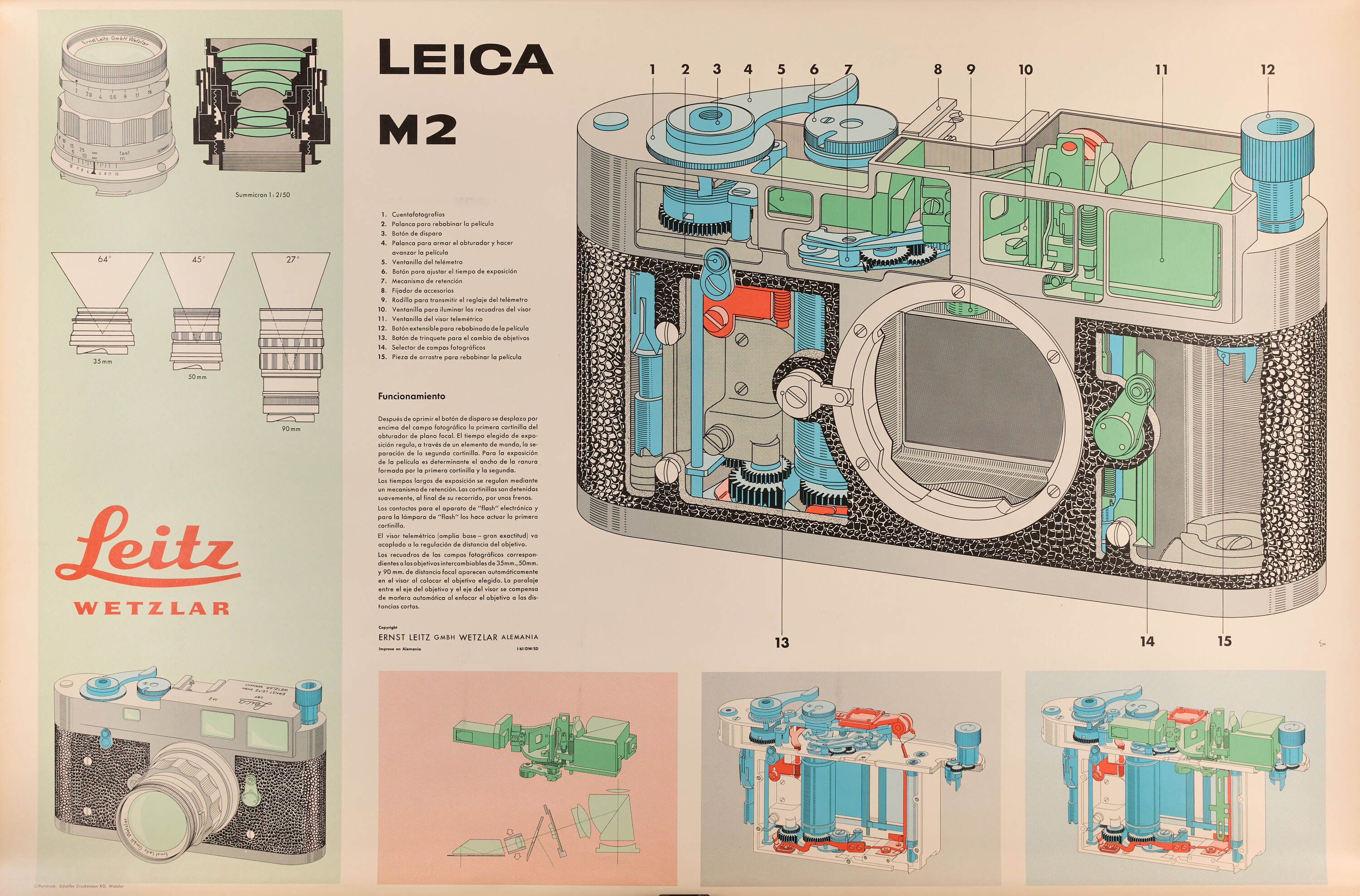 A set of 7 original Leitz wall charts, printed paper ca. 120x80cm in beautiful, near mint condition, showing an Optical Bench Comparator, Large Universal Toolmaker's Microscope and Orthoplan Microscope, 3x in German and 3x in English, and wall chart showing the second version Leica M2, rare version in Spanish.