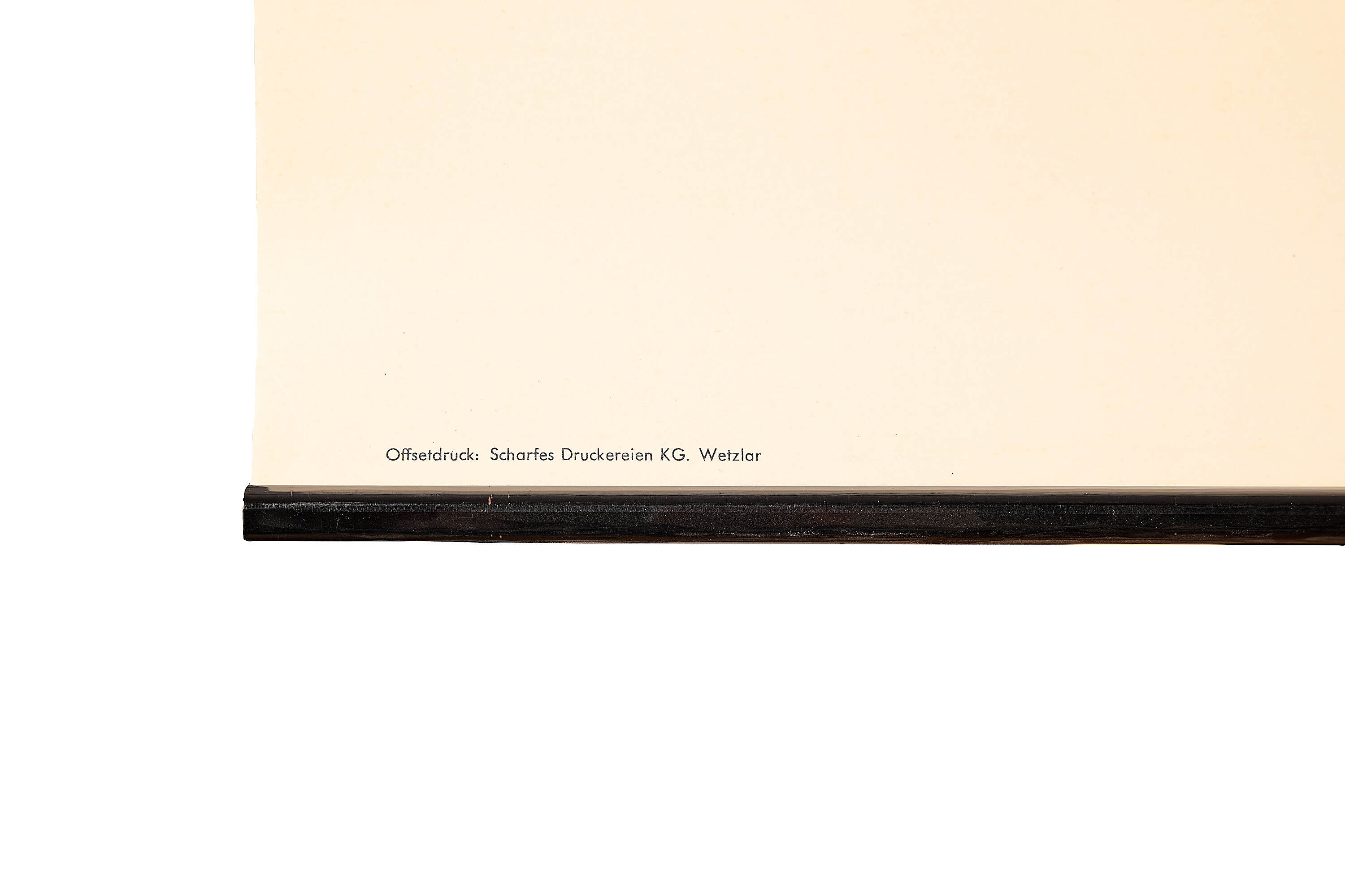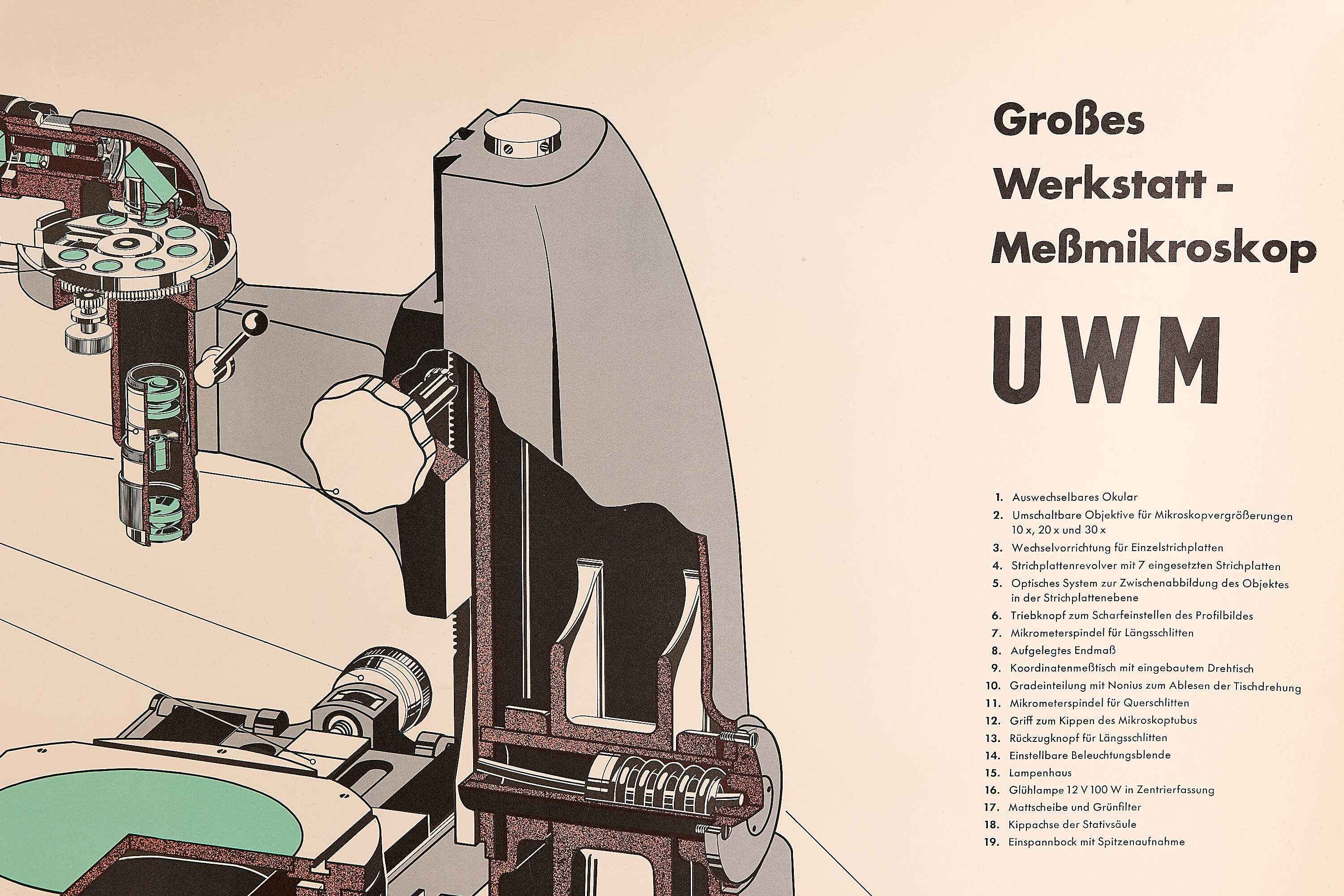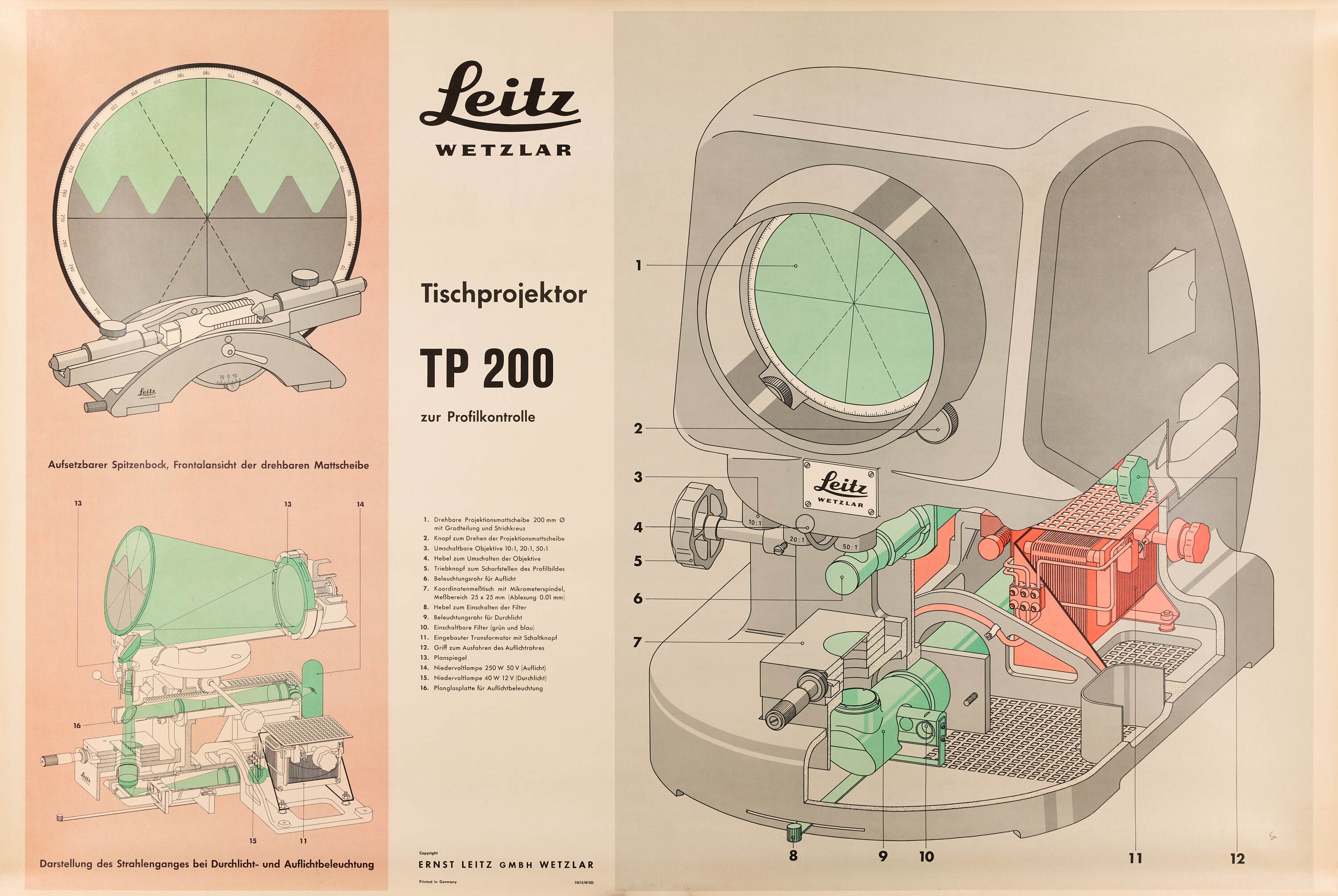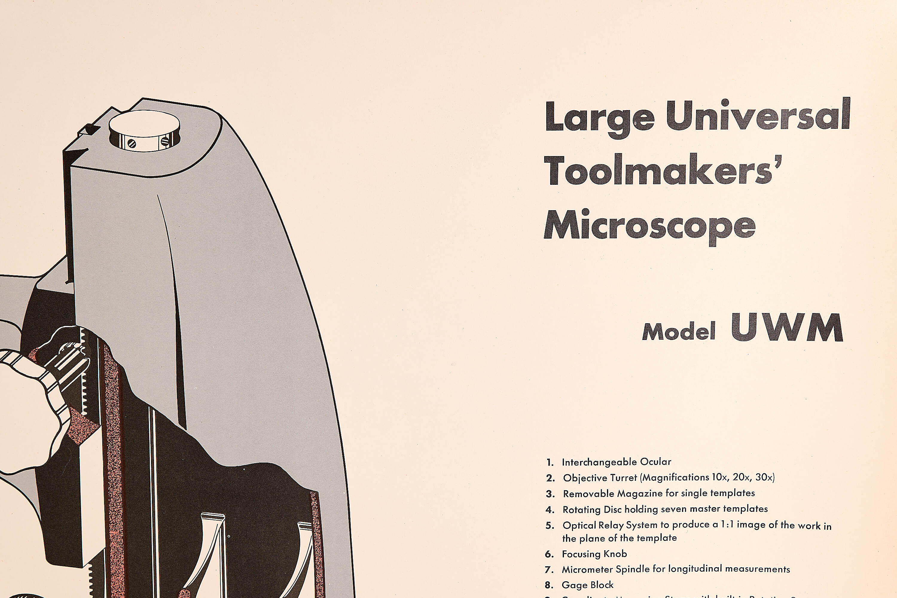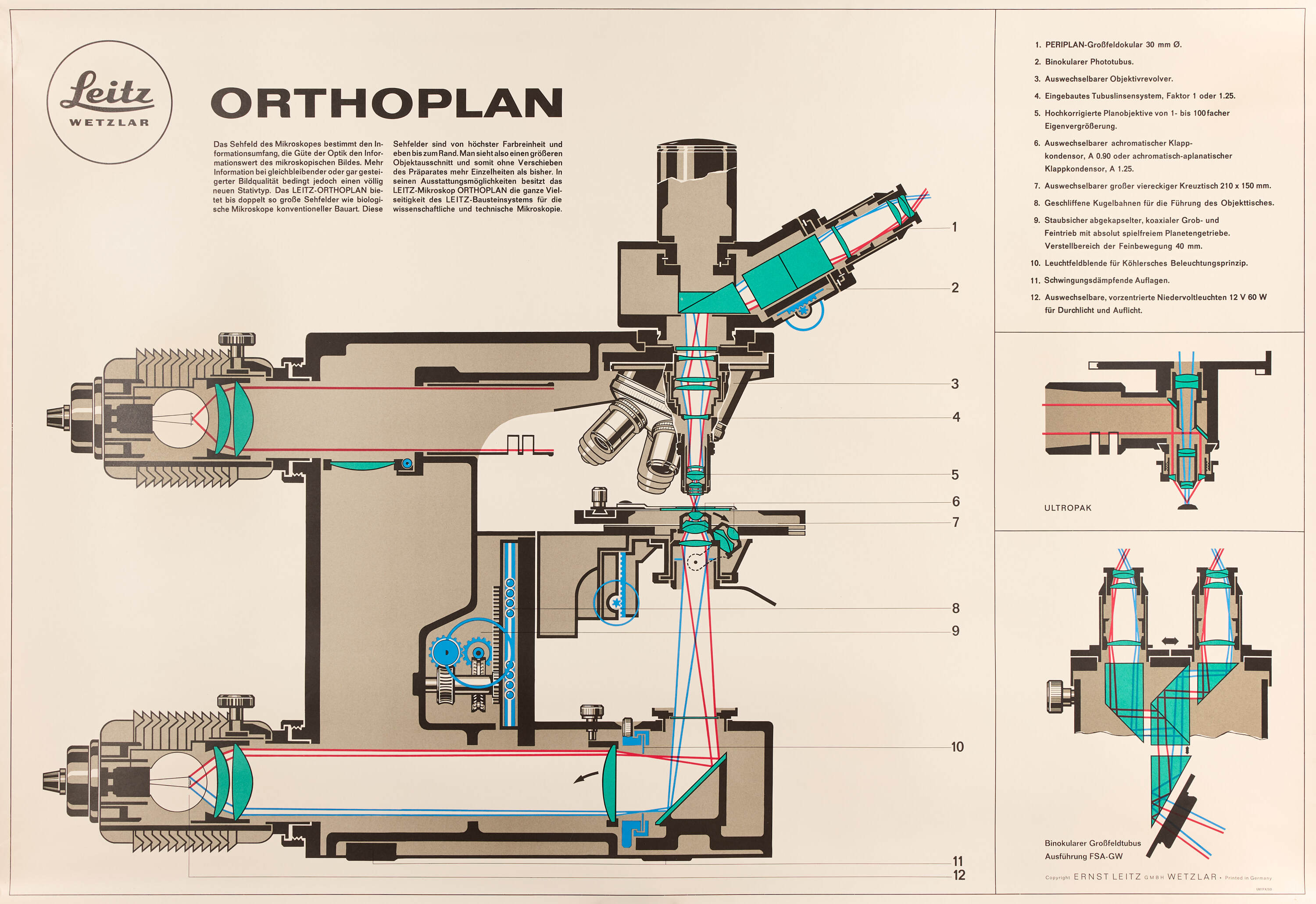 A set of 7 original Leitz wall charts, printed paper ca. 120x80cm in beautiful, near mint condition, showing an Optical Bench Comparator, Large Universal Toolmaker's Microscope and Orthoplan Microscope, 3x in German and 3x in English, and wall chart showing the second version Leica M2, rare version in Spanish.