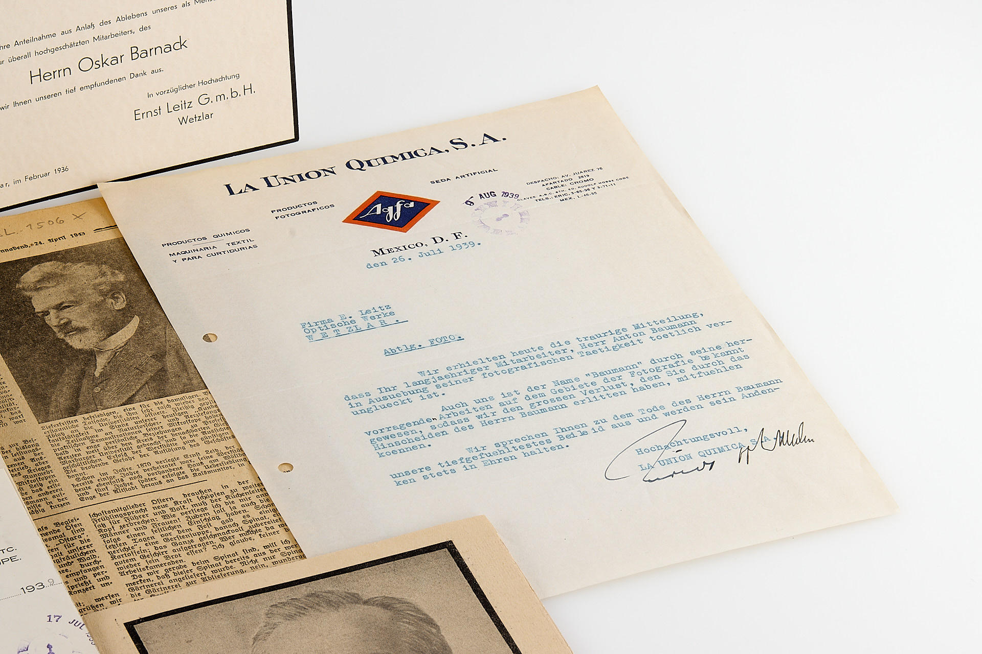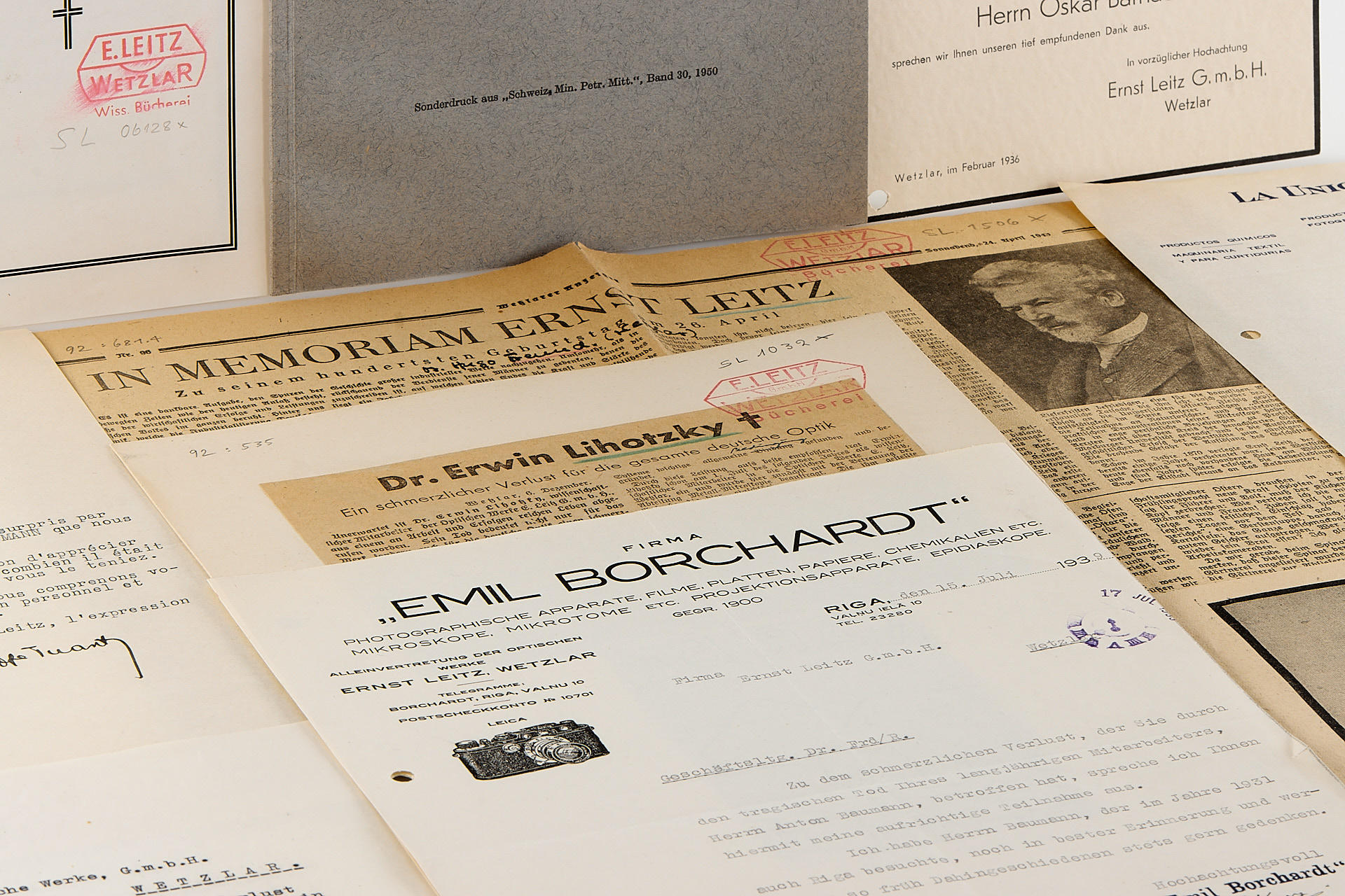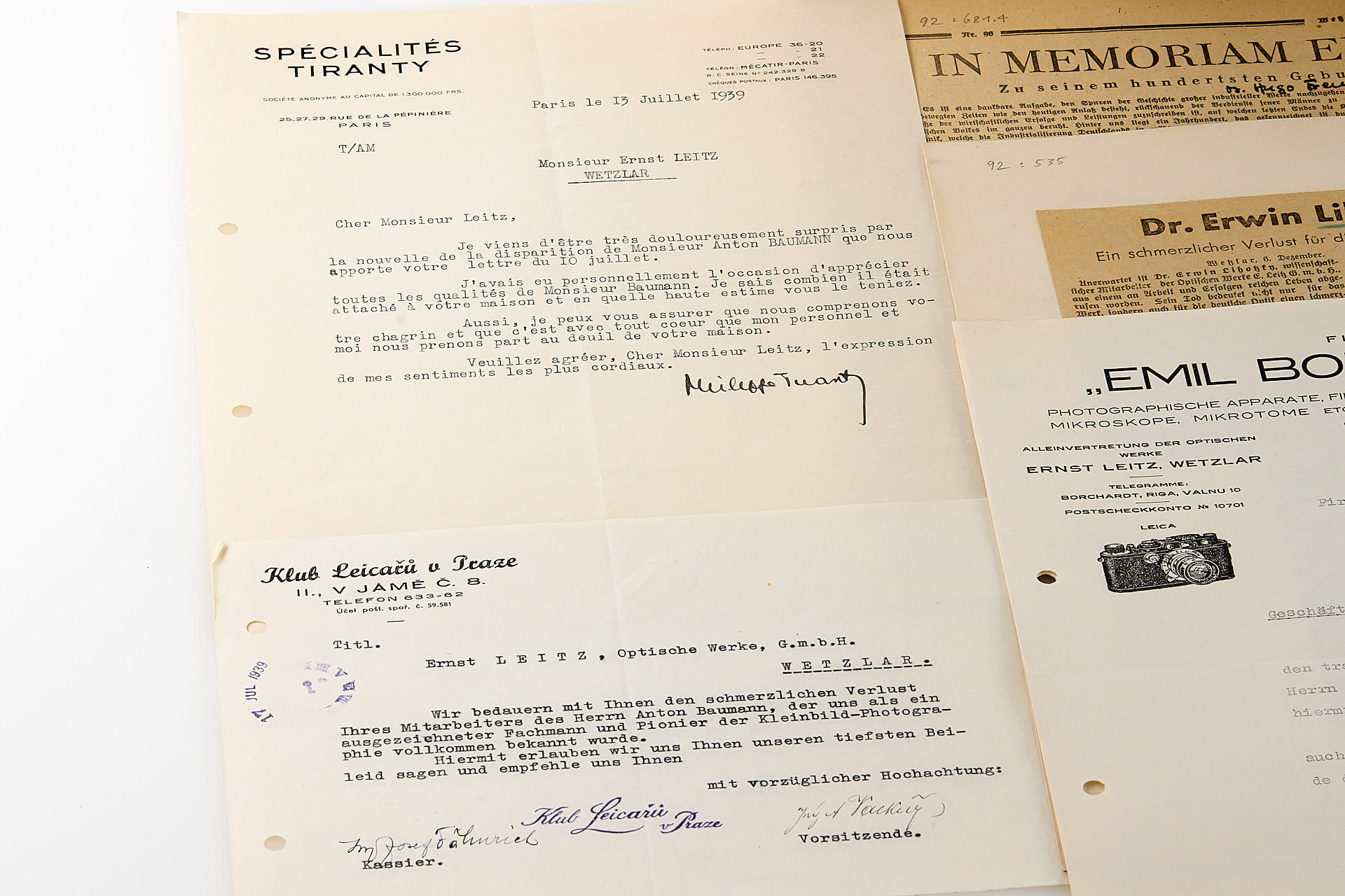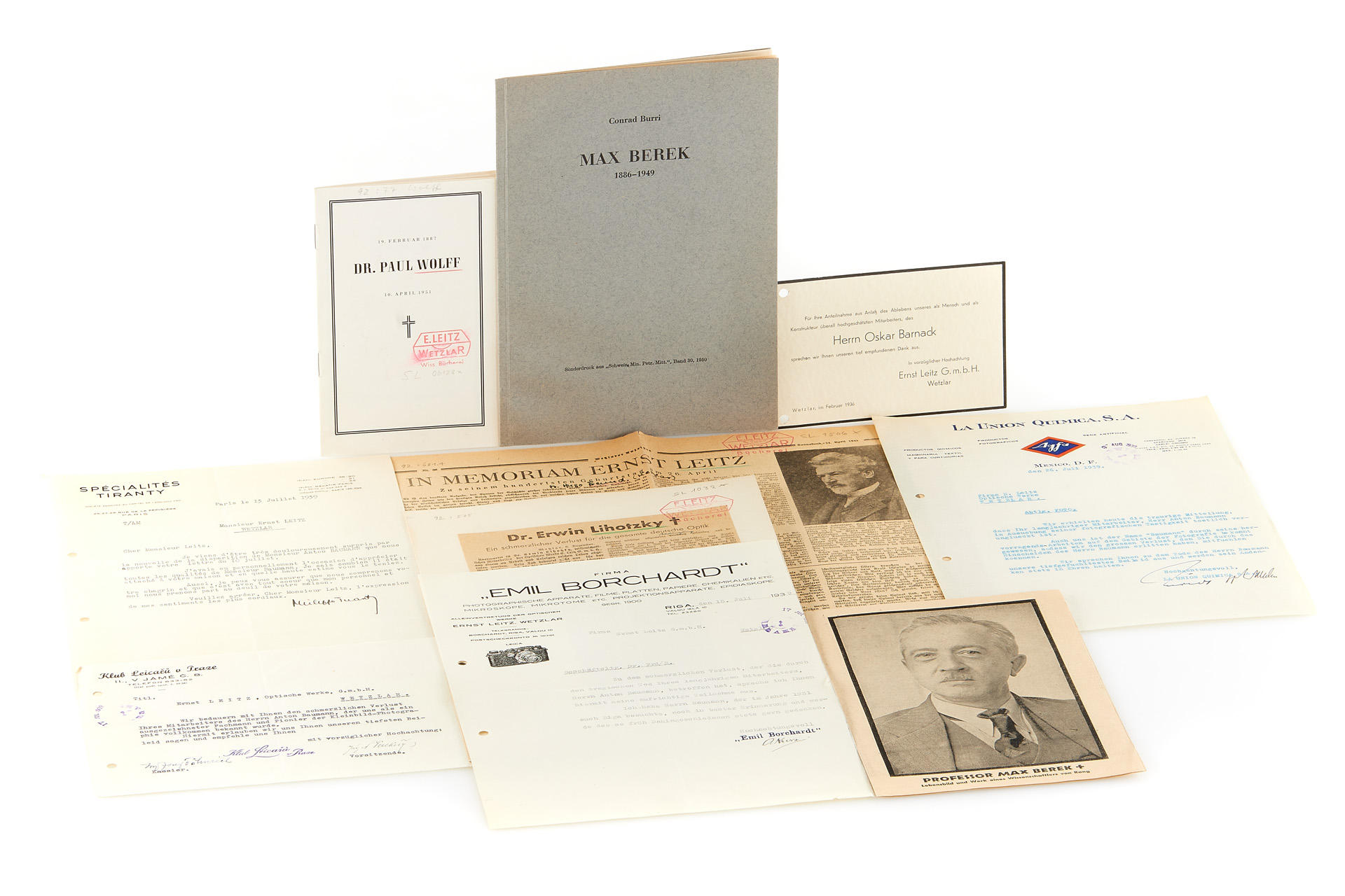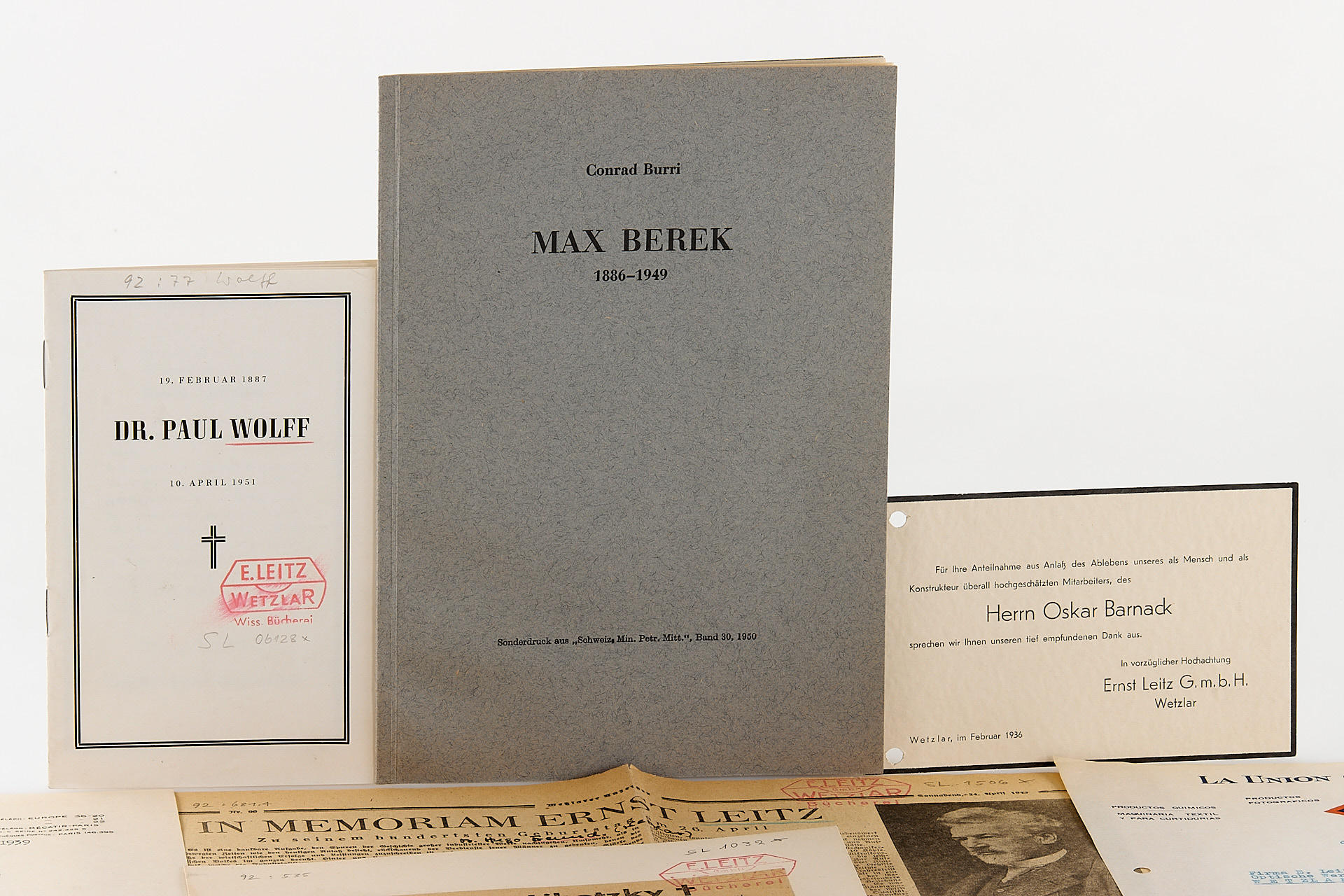 a collection of articles and special print publications and correspondence, including an original condolence letter from Phillippe Trianty, Paris, rare brochures and obituaries, all ex Leitz Wetzlar factory library