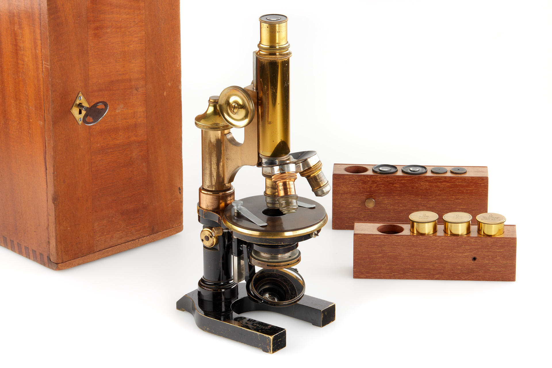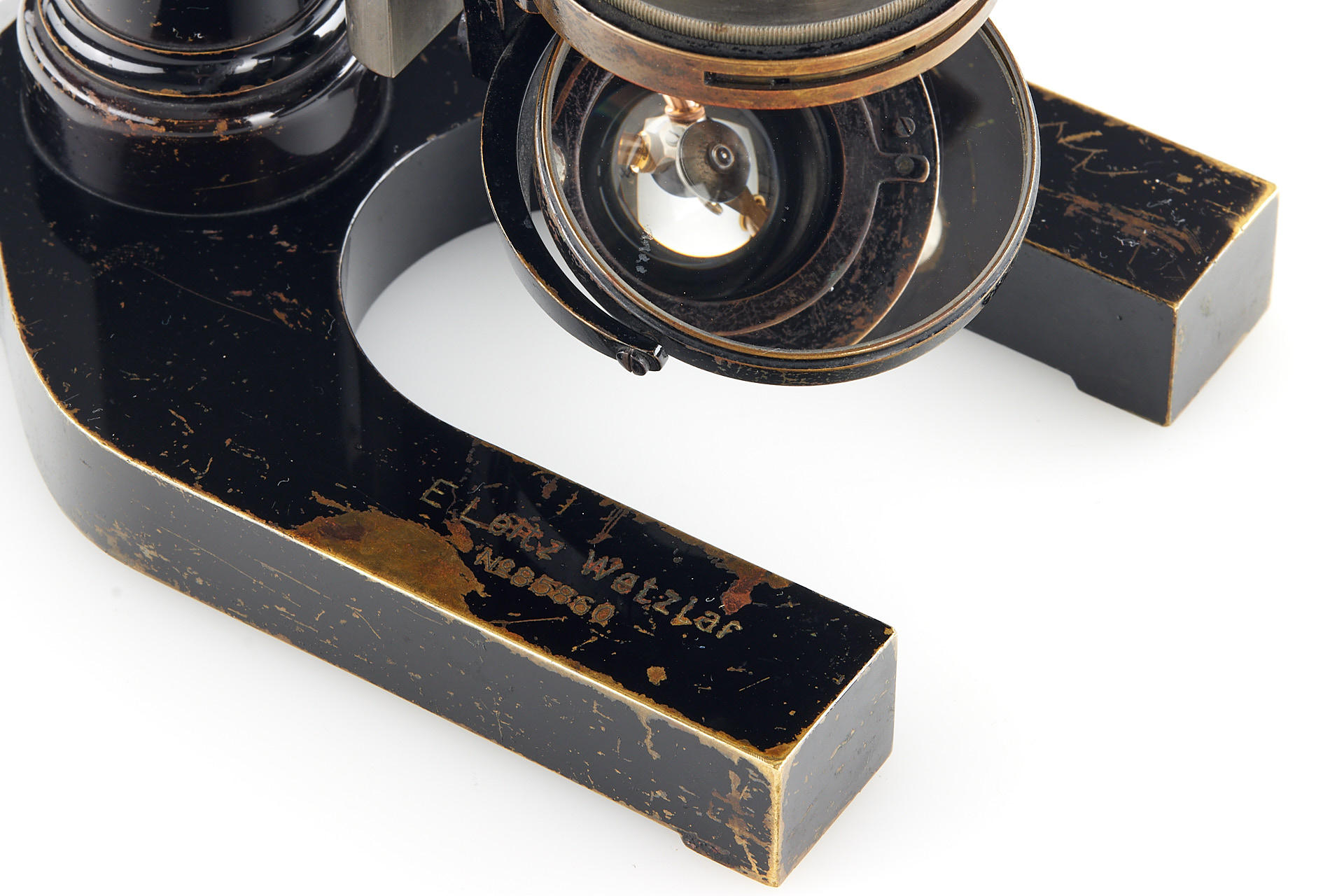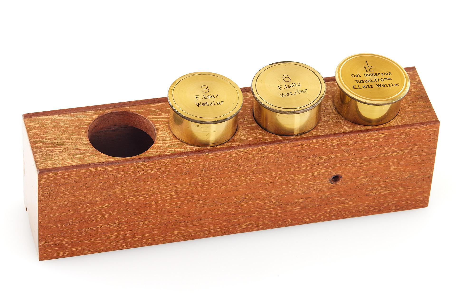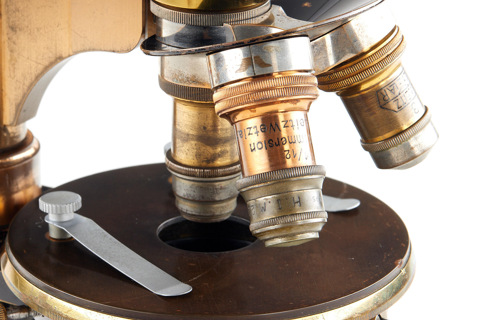 an attractive brass microscope, in good original condition, with rotating table, three oculars, three Leitz lenses, original wooden case (matching number, back repaired)