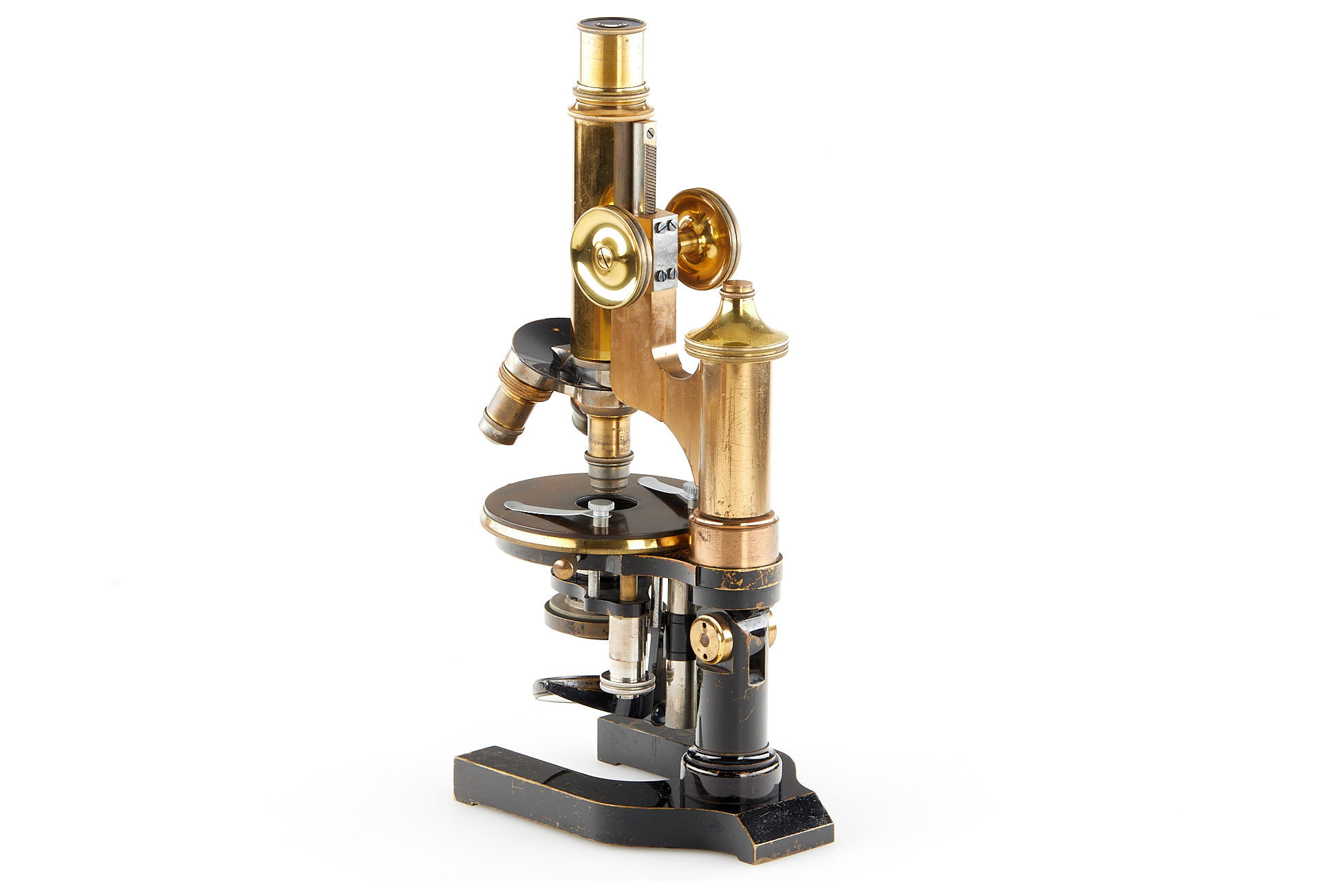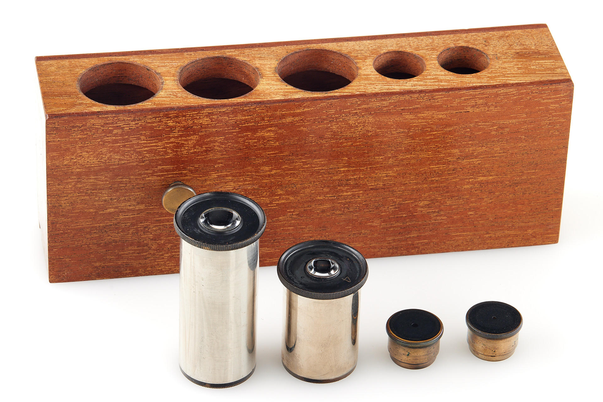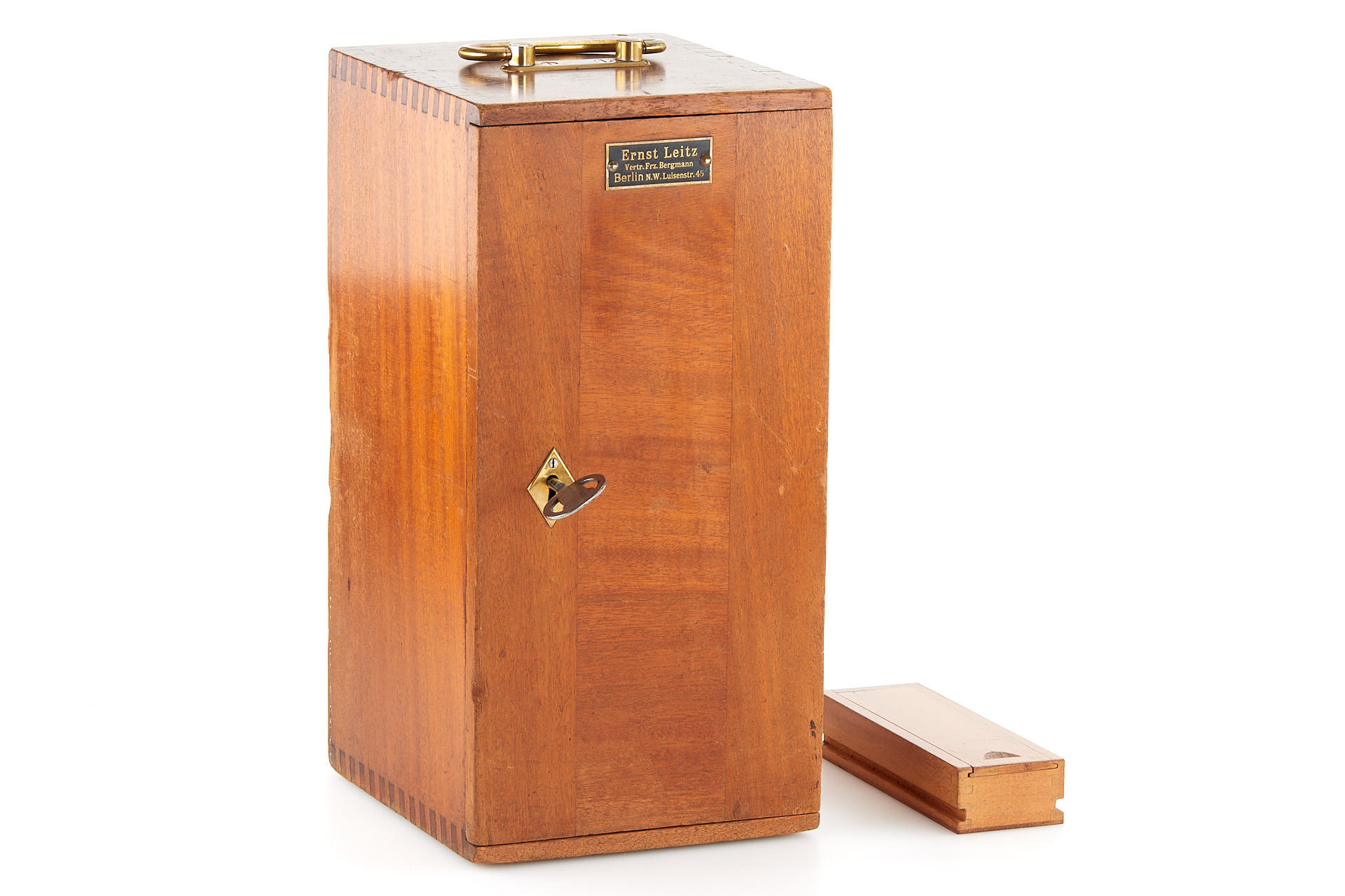 an attractive brass microscope, in good original condition, with rotating table, three oculars, three Leitz lenses, original wooden case (matching number, back repaired)