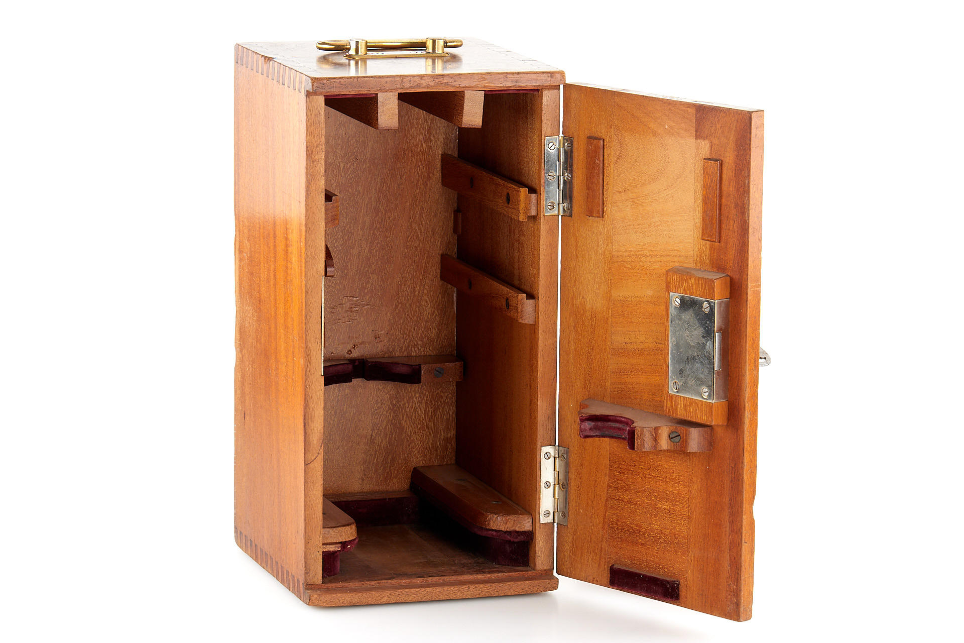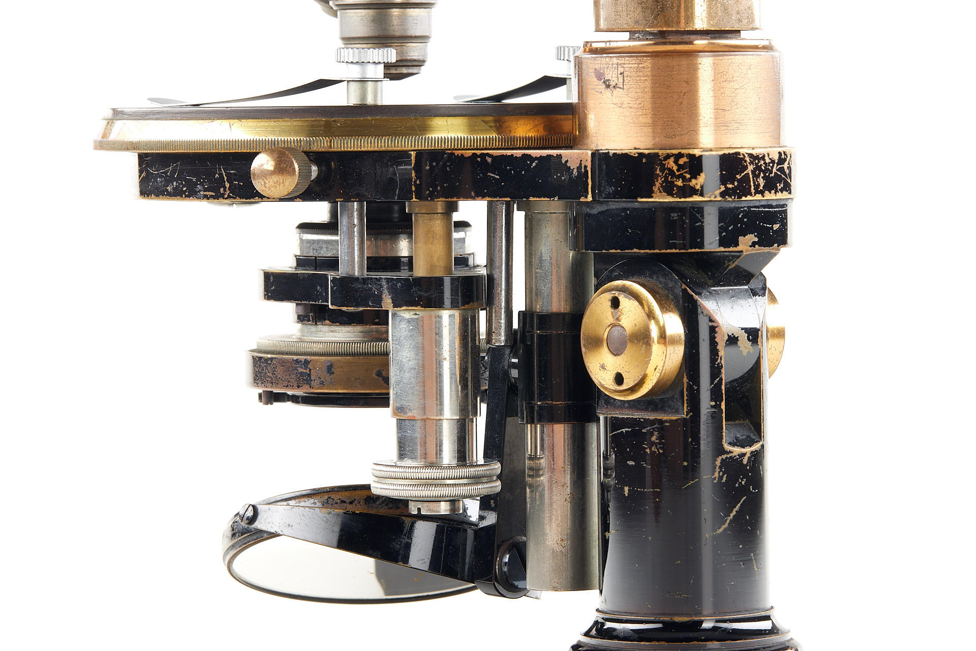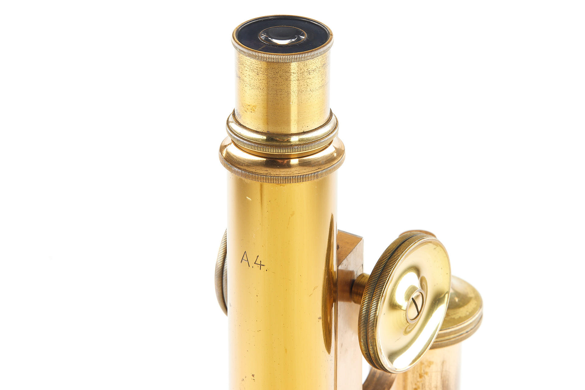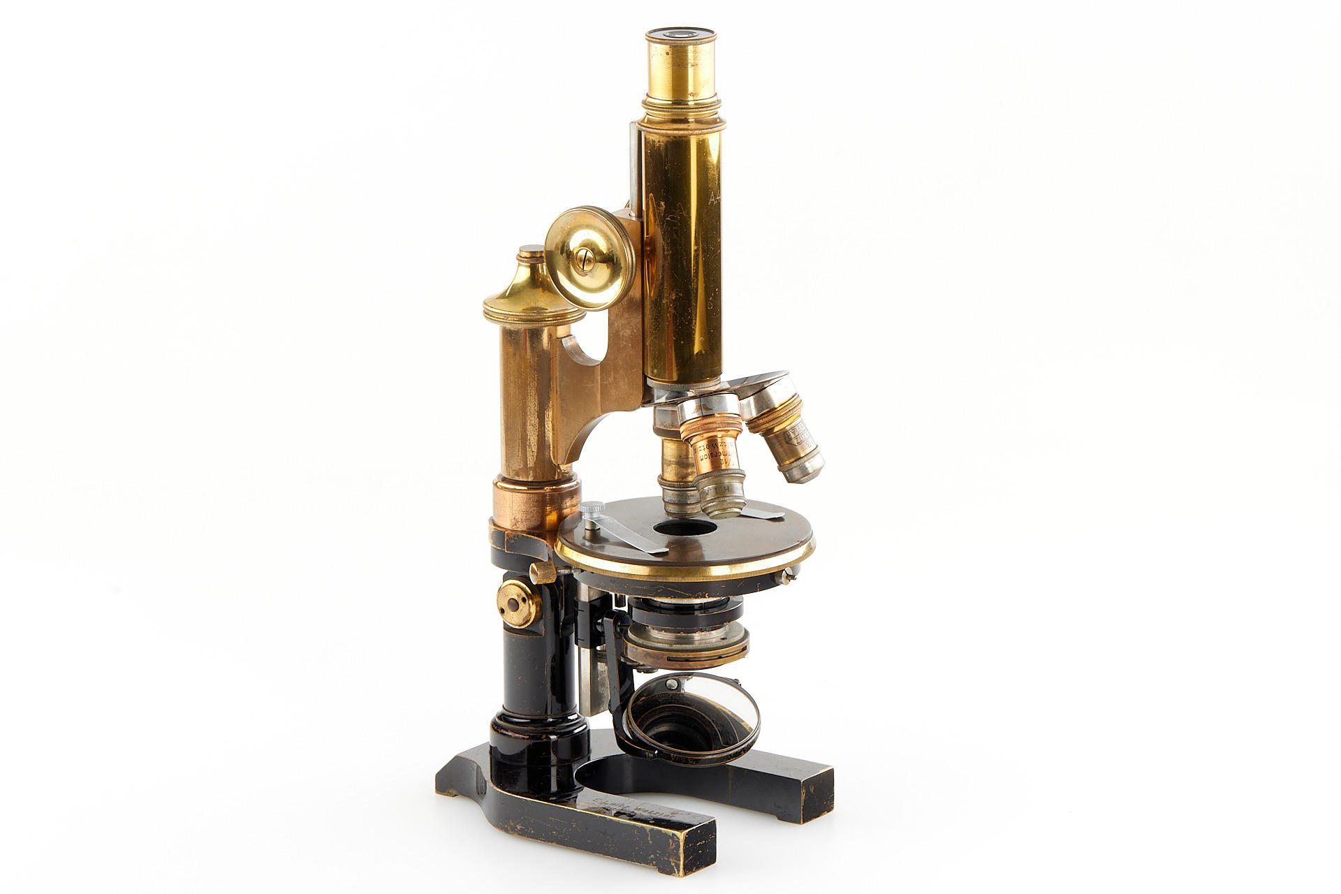 an attractive brass microscope, in good original condition, with rotating table, three oculars, three Leitz lenses, original wooden case (matching number, back repaired)