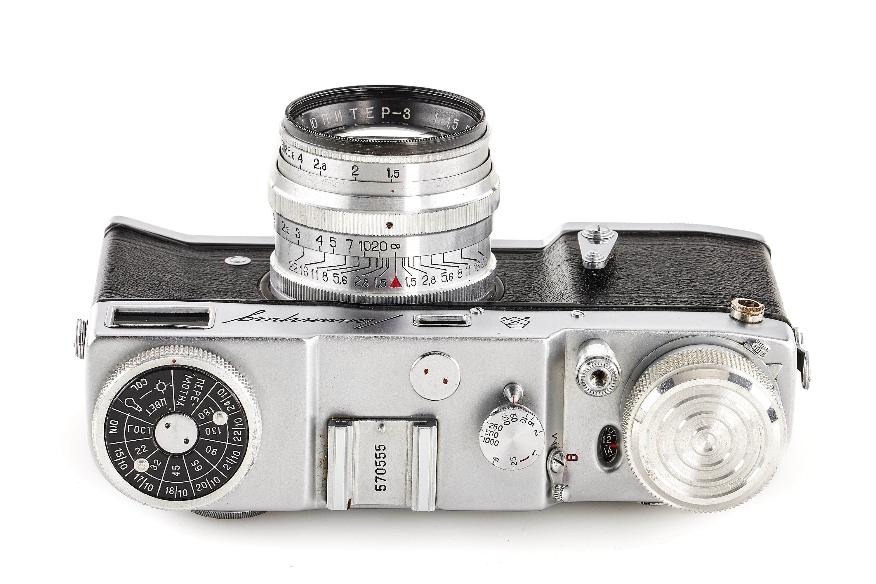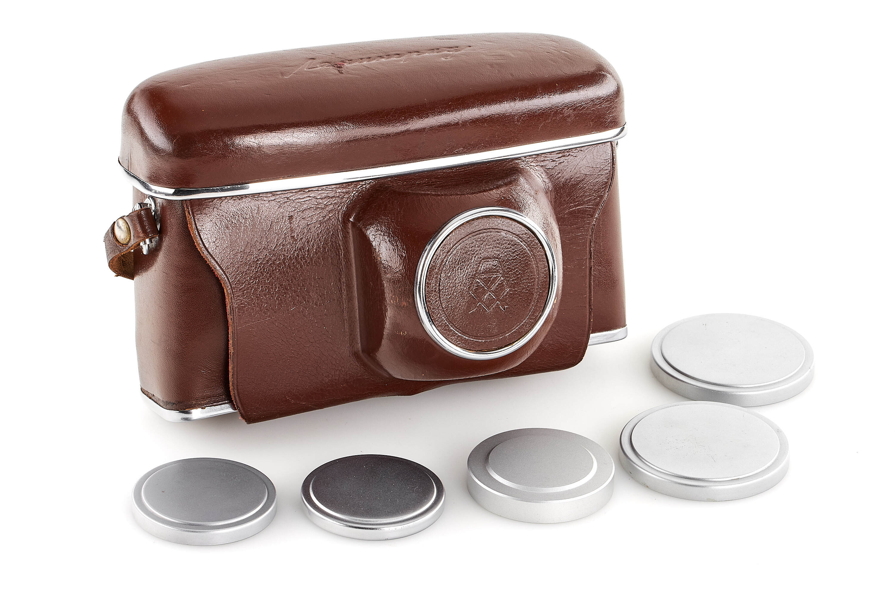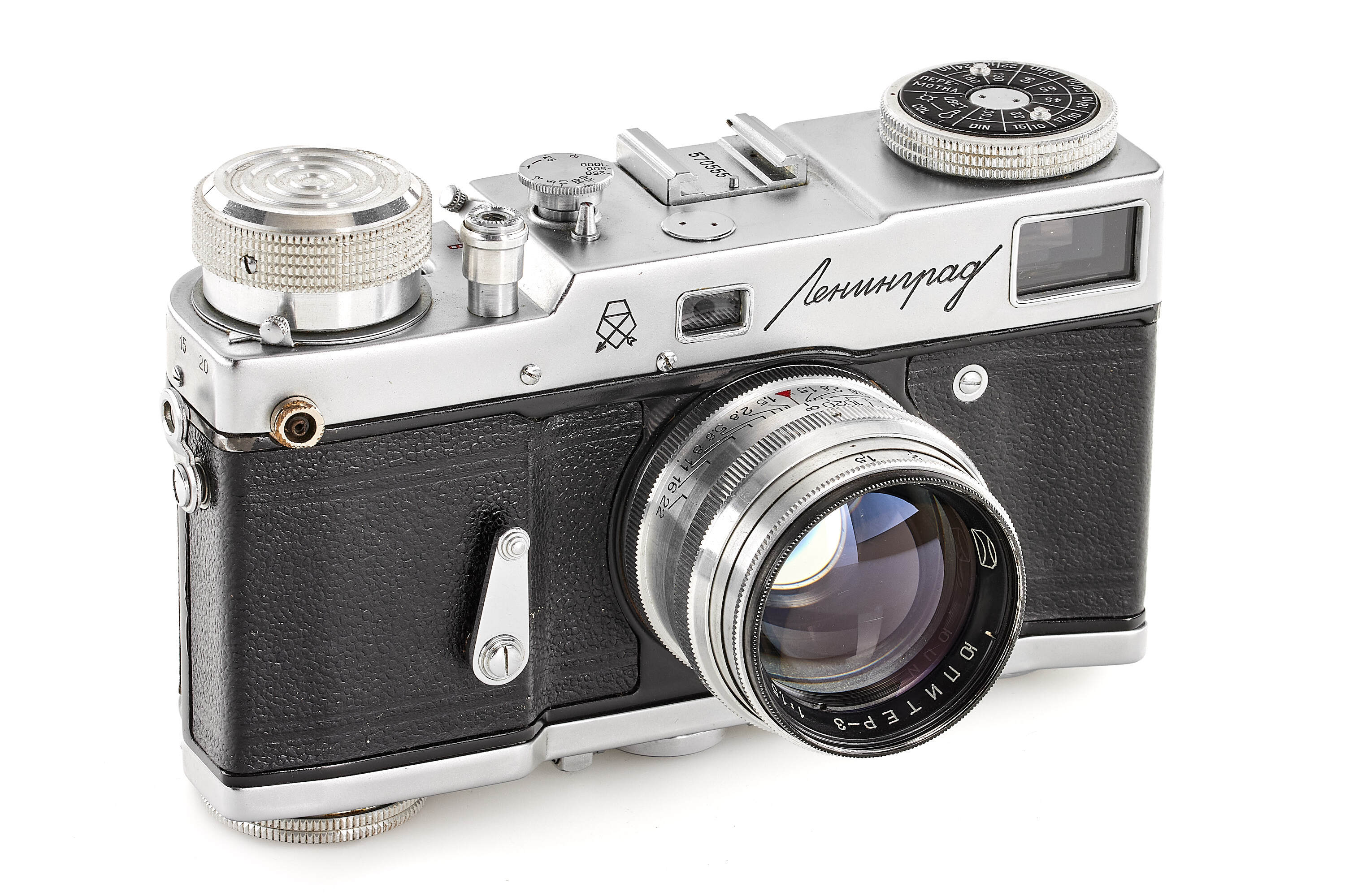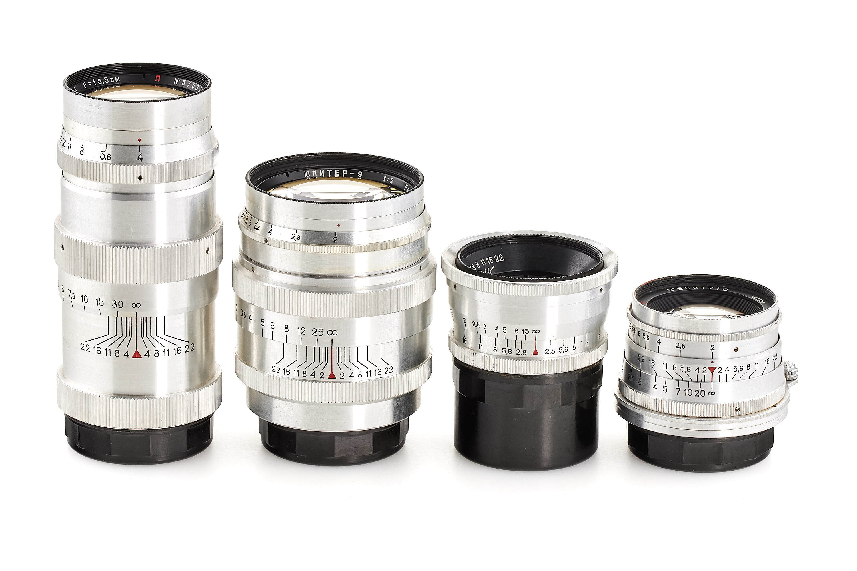 An exceptional and complete presentation set featuring a first-series Leningrad camera from 1957. Specially ordered by the government as a prestigious gift, the set is supplied in a high-quality leather case. It includes five M39 lenses: Jupiter-12 2.8/35 mm no. 5701723, Jupiter-8 2/50 mm no. 5621710, Jupiter-3 1.5/50 mm no. 5705213, Jupiter-9 2/85 mm no. 5604745, and Jupiter-11 4/135 mm no. 5703733. The ensemble is further complemented by six filters, three film cassettes, and a Leningrad exposure meter.