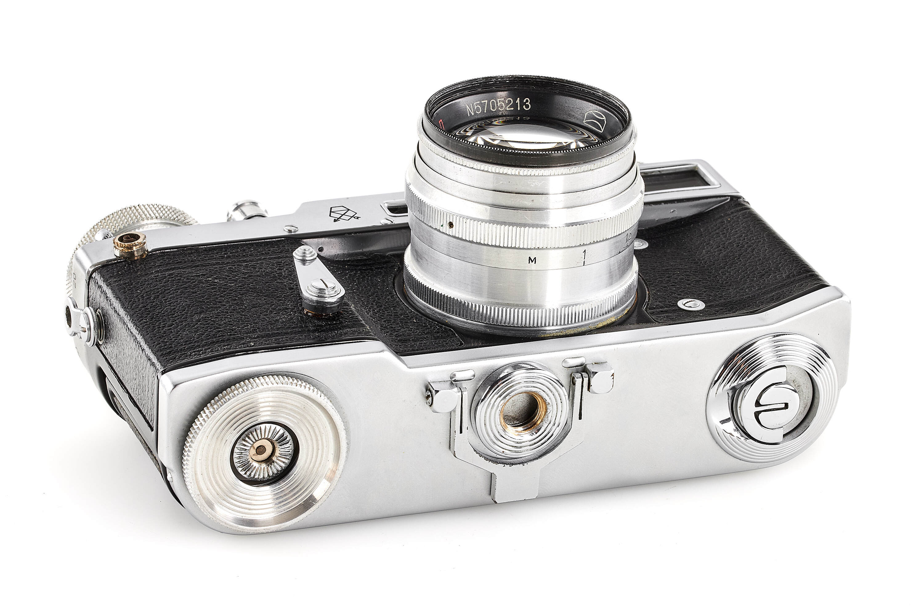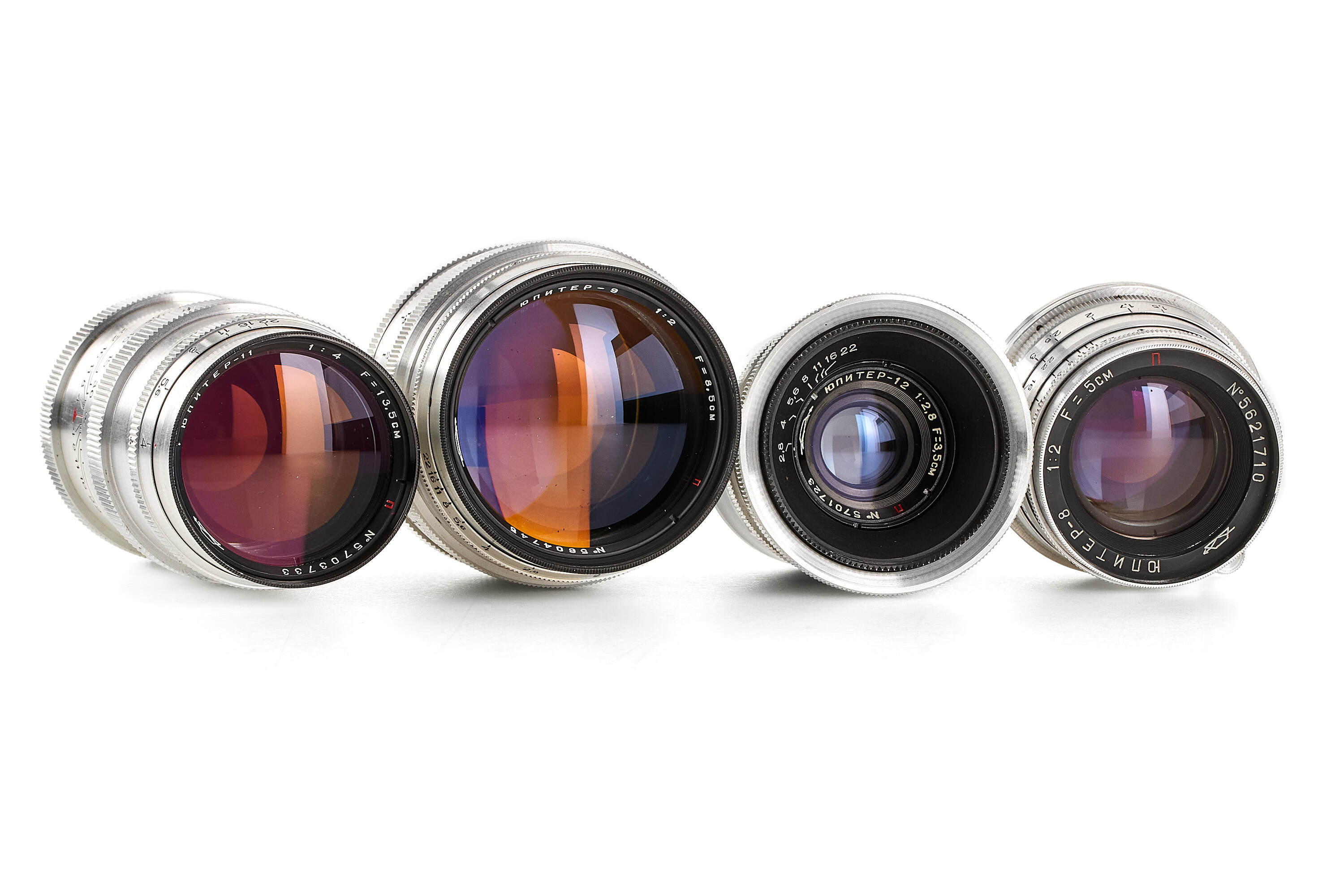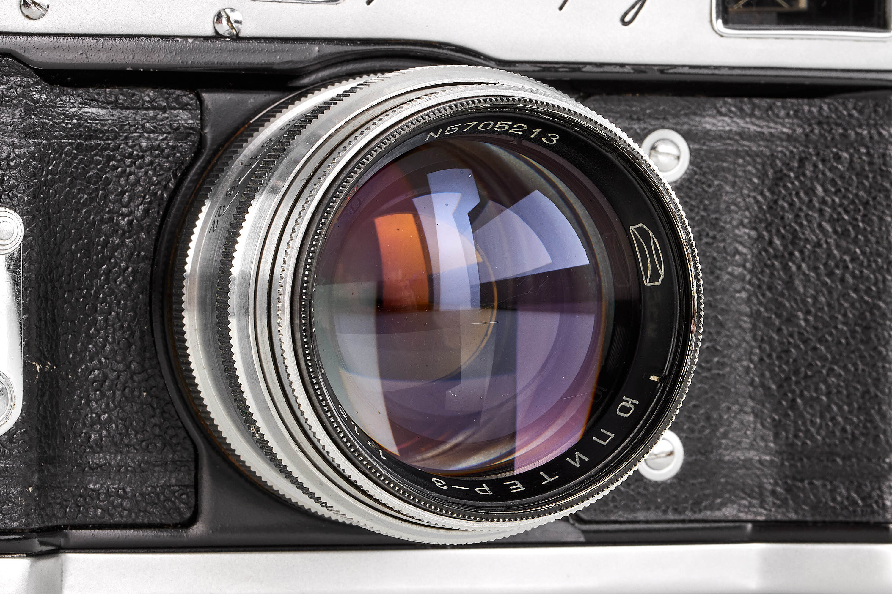 An exceptional and complete presentation set featuring a first-series Leningrad camera from 1957. Specially ordered by the government as a prestigious gift, the set is supplied in a high-quality leather case. It includes five M39 lenses: Jupiter-12 2.8/35 mm no. 5701723, Jupiter-8 2/50 mm no. 5621710, Jupiter-3 1.5/50 mm no. 5705213, Jupiter-9 2/85 mm no. 5604745, and Jupiter-11 4/135 mm no. 5703733. The ensemble is further complemented by six filters, three film cassettes, and a Leningrad exposure meter.