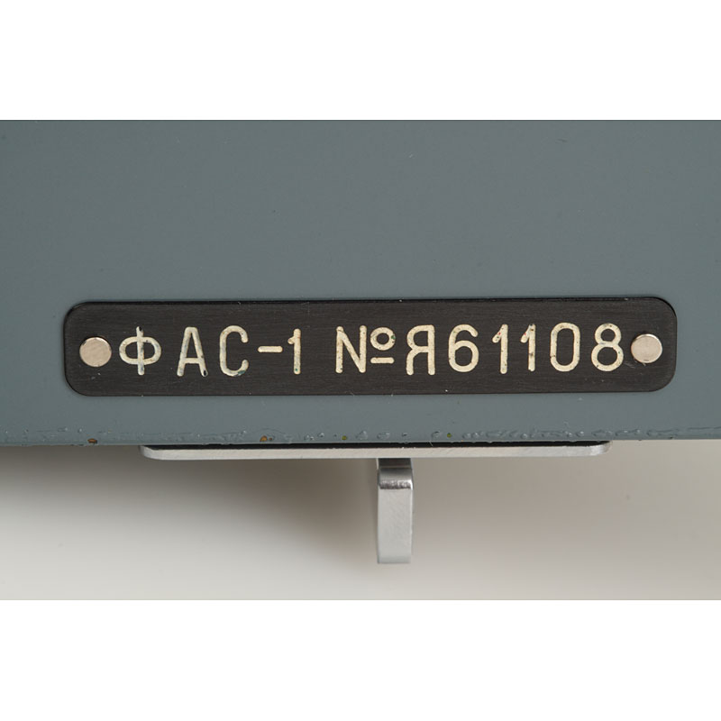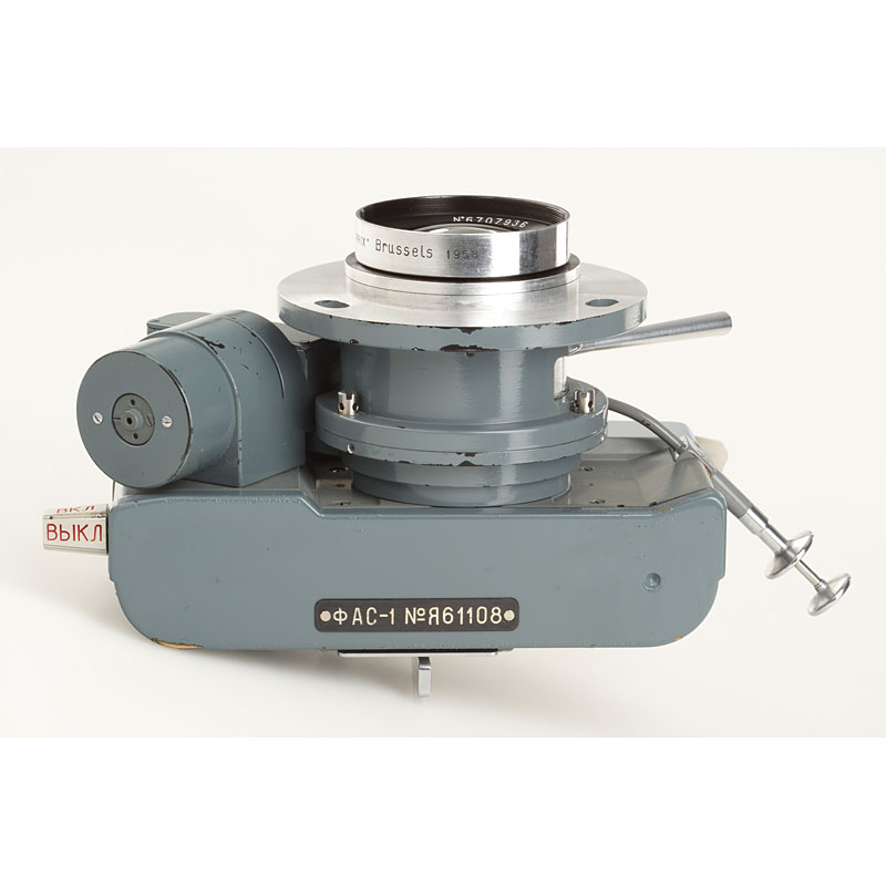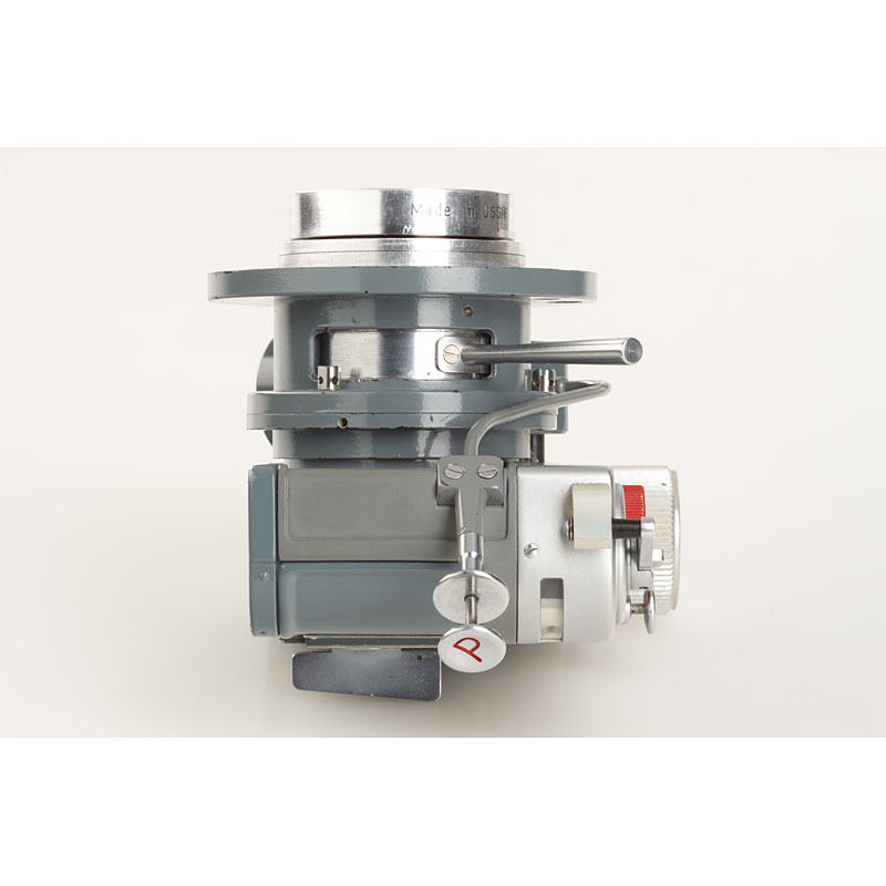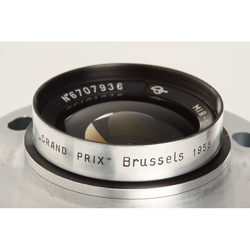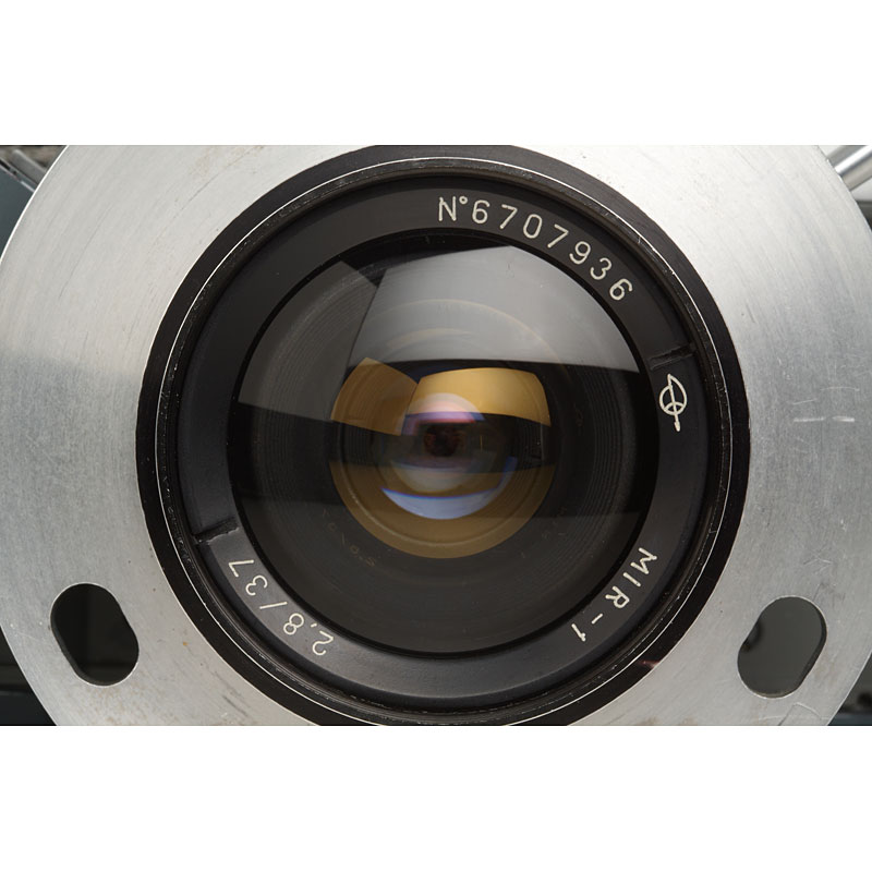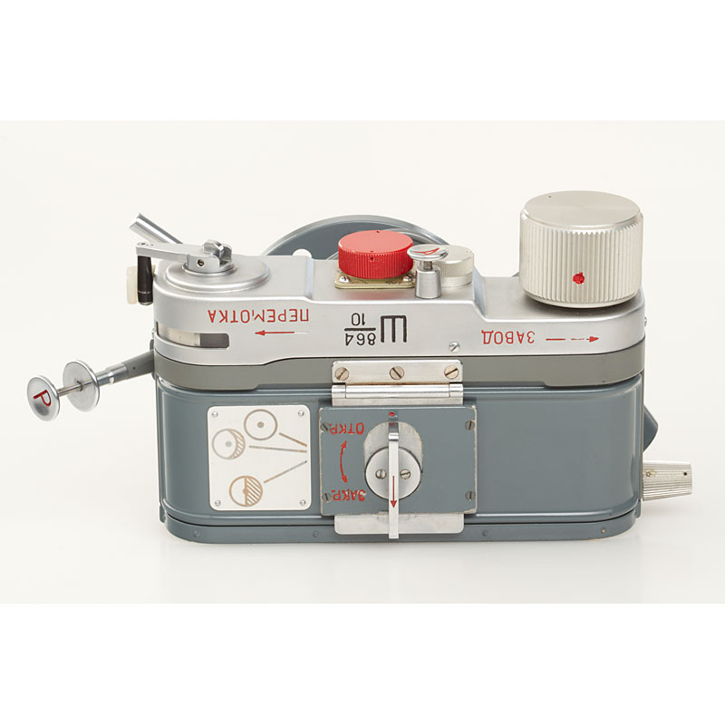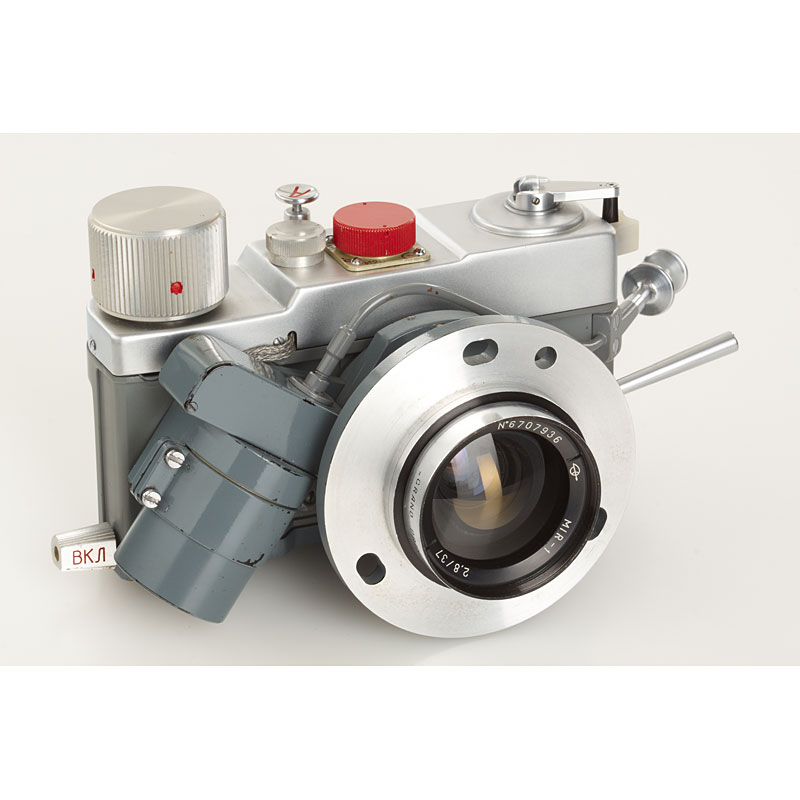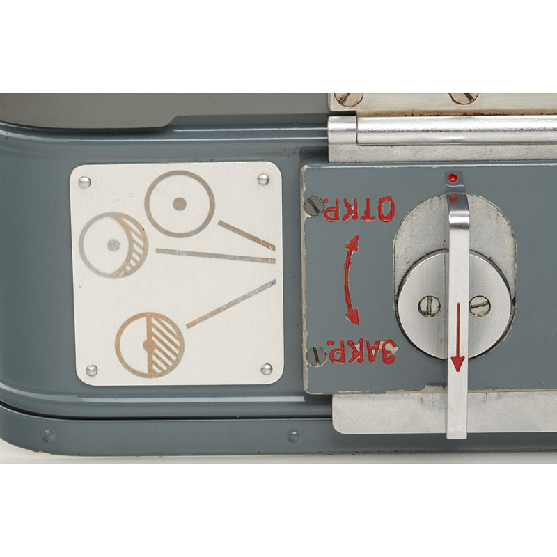 This camera was manufactured for the Soviet Lunar Space Program with MIR-1 2.8/37mm no.6707935. It is based on a heavily modified Leningrad with enforced clockwork motor drive and no viewfinder. All parts of the camera are made to the highest quality standards. Shutter 1/140 and B., negative format 20 (24) x 36 mm, the design of the negative window is uncommon and obviously was shaped to accommodate a round object (the Moon). All armatures are sturdily built for use with hand-gloves. Mechanical and electric release (direct or remote). Connection to the on-board electrics by a special 19-pole plug. The diaphragm is operated by a substantial lever on the left side of the lens that has three positions: down (fully illuminated moon – f/11), level (half ways lit moon, f/5,6) and up (light at the moon terminator, f/2,8); schematic explanation on a plate on the hinged camera back. Behind the MIR-1 wide angle lens a special flap is mounted that only moves laterally while the release is pressed. It prevents a burn of the shutter fabric if the camera points towards the sun accidentally. only very few cameras are known to exist - first time ever offered in auction !
