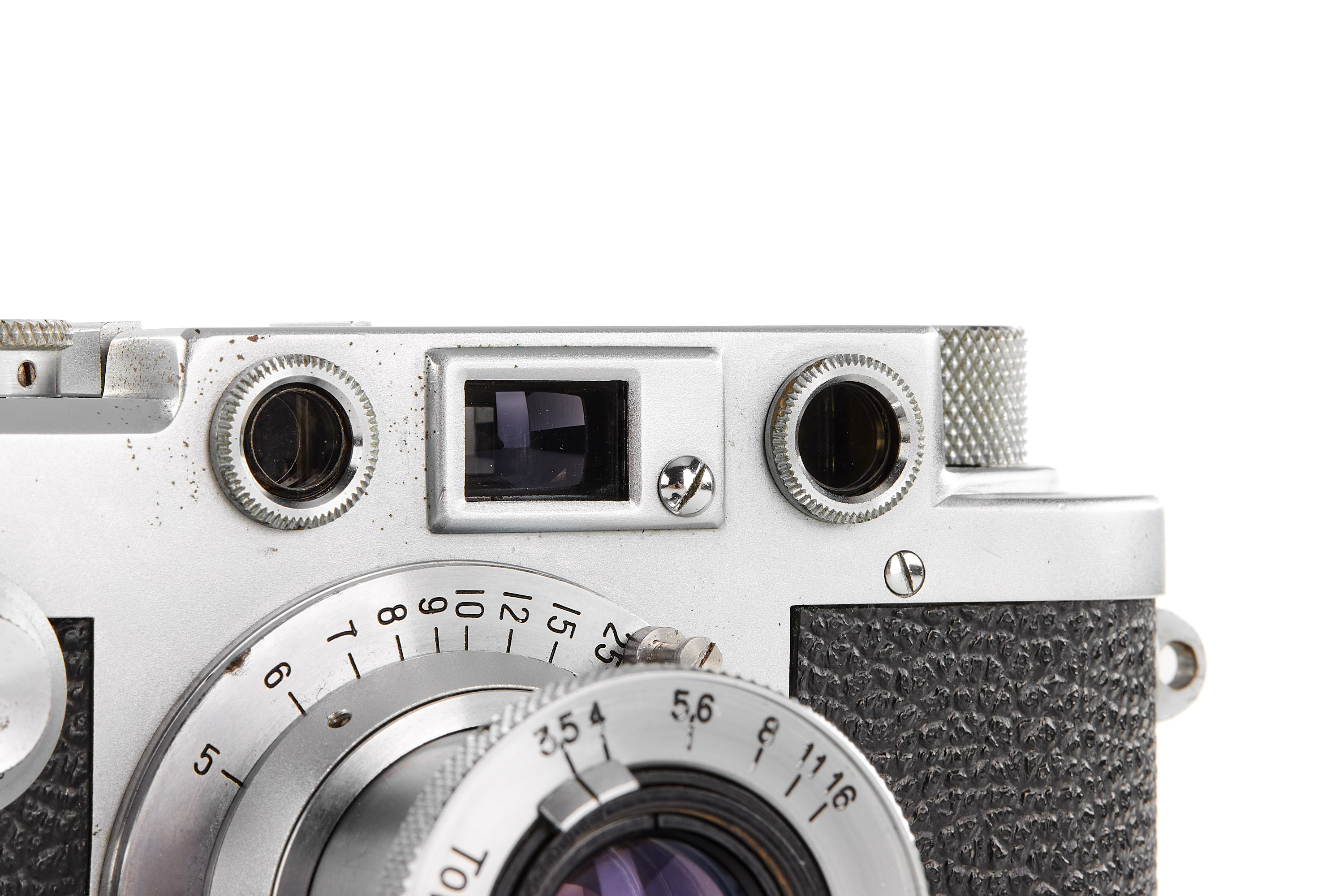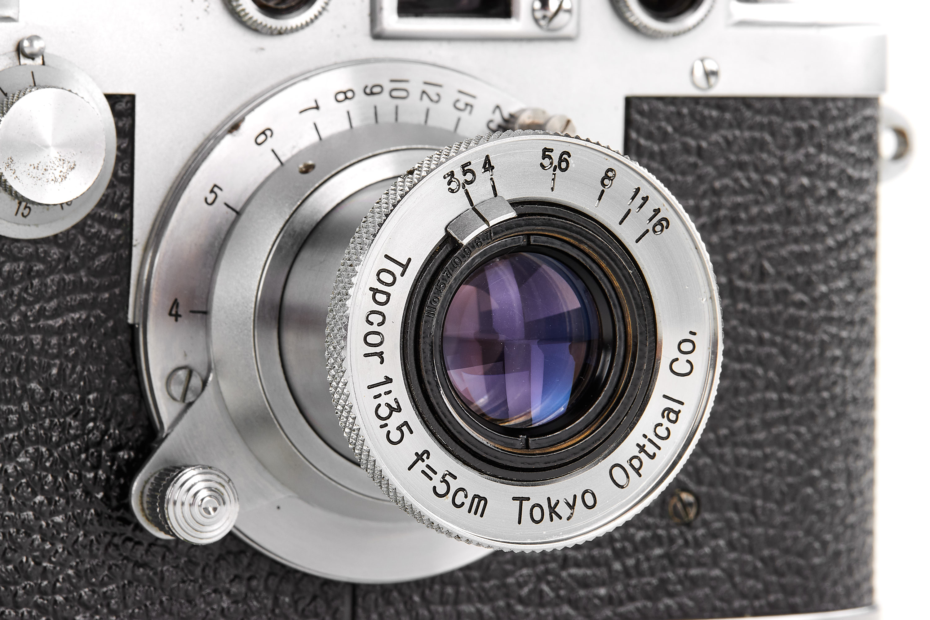 Beautiful Japanese Leica copy in almost mint condition and working order, only showing few traces of corrosion, with Topcor 3.5/5cm no.570987 with good optics only showing minimal cleaning marks, with original front lens cap.