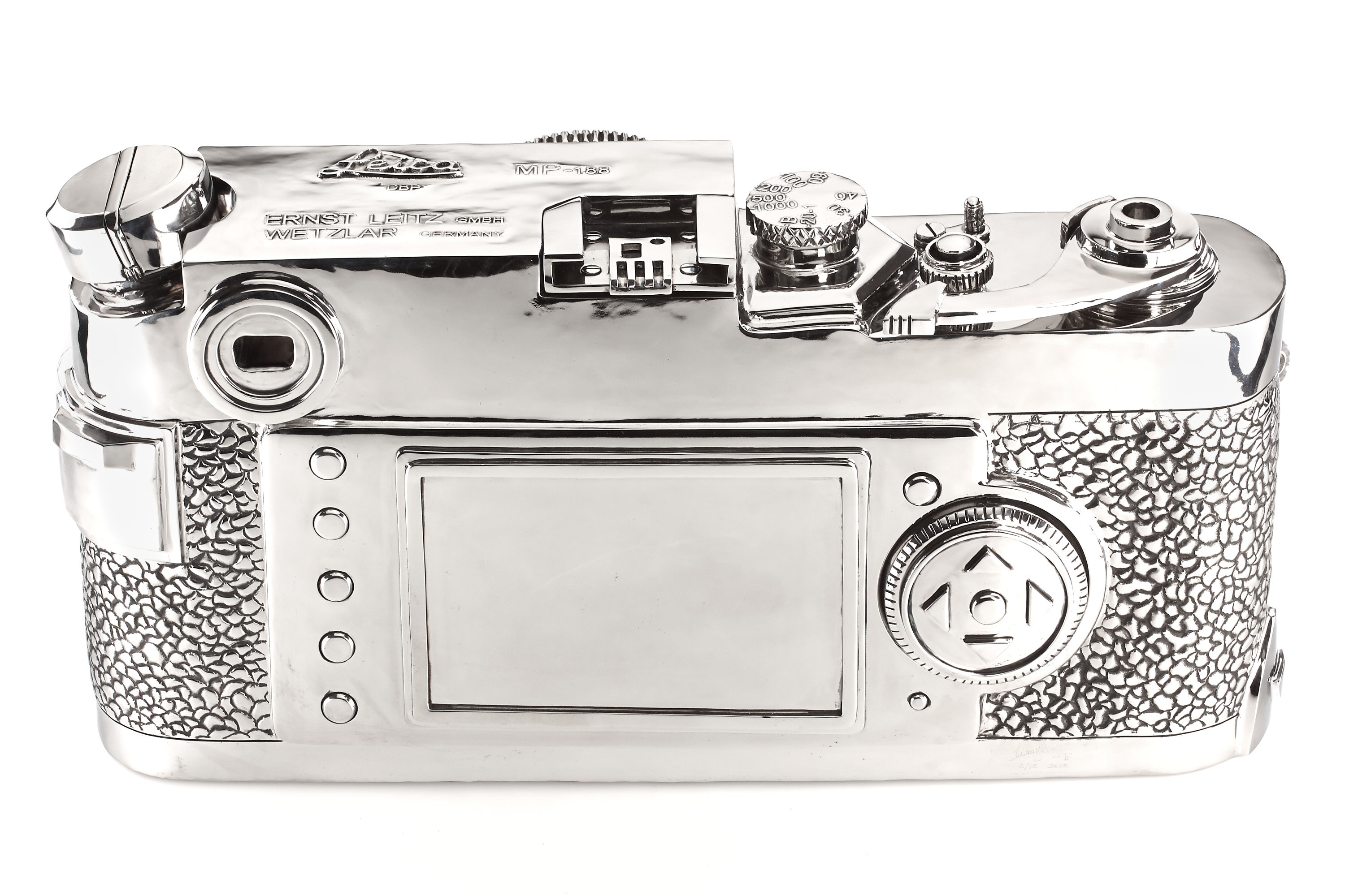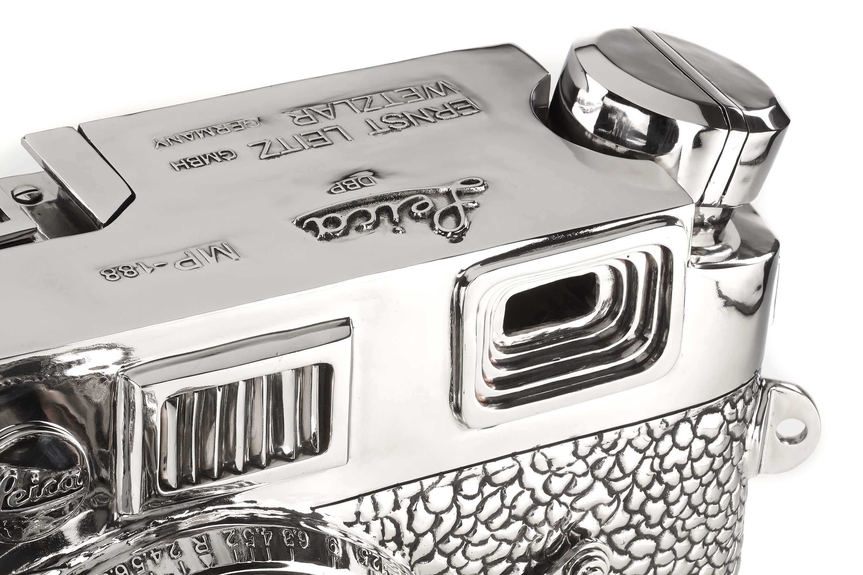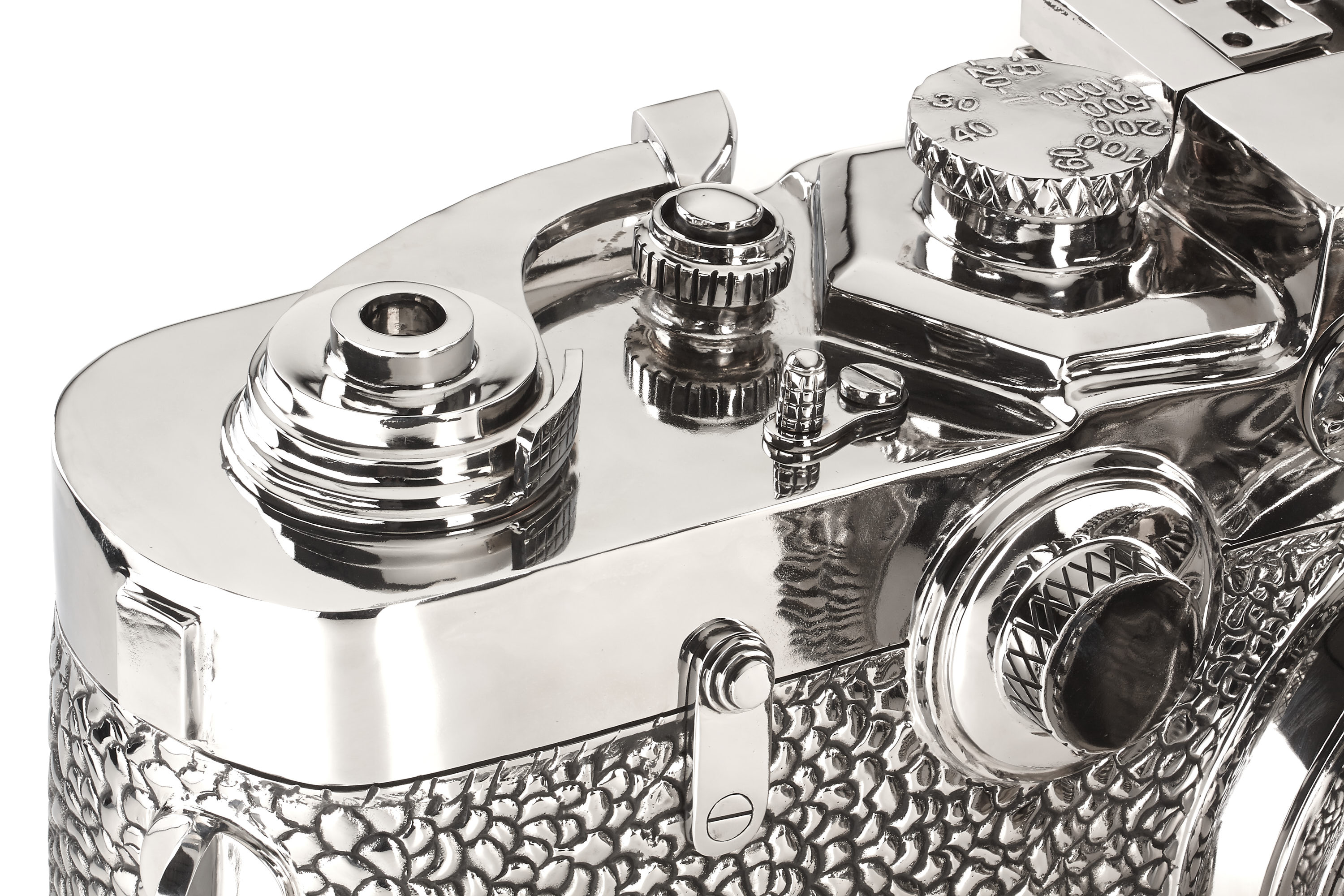 Famous sculpture of the oversized Leica camera created by the Chinese artist Liao Yibay. Only 12 of these sculptures have been made and are extremely hard to find (this particular example is the no.2). On first look the camera looks like an M6, but closer inspection reveals many interesting details borrowed from various analogue and digital Leica models, like the display on the back, slow speeds dial on front, lack of second rangefinder window, MP-188 engraving on top, electronic contacts on the flash shoe etc. The sculptured camera is equipped with ‘Summar’ 2/5cm no.247425 (in a barrel resembling a collapsible Summicron), comes with wooden transportation box and original design drawing by Liao Yibai. The artist is known for creating hand-welded stainless steel sculptures of oversized watches, bags, rings and other luxury items, his work has been acclaimed and exhibited worldwide.