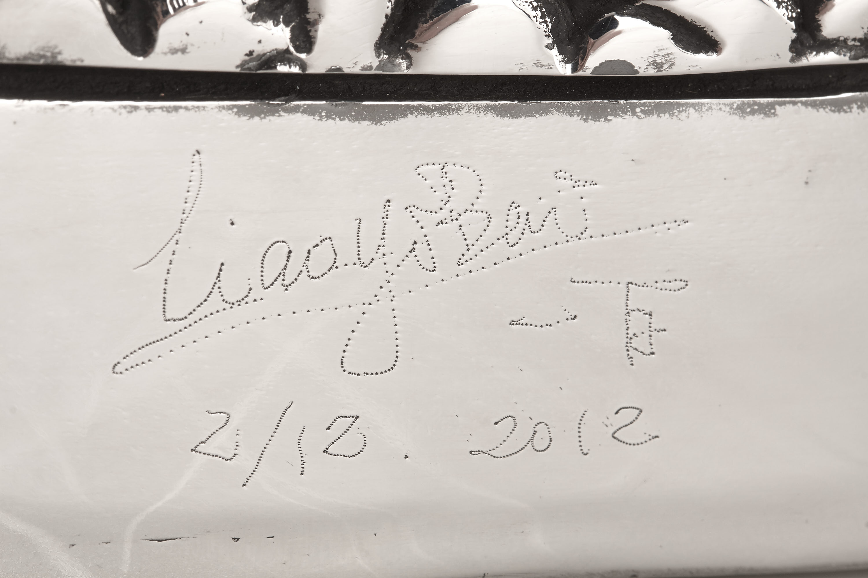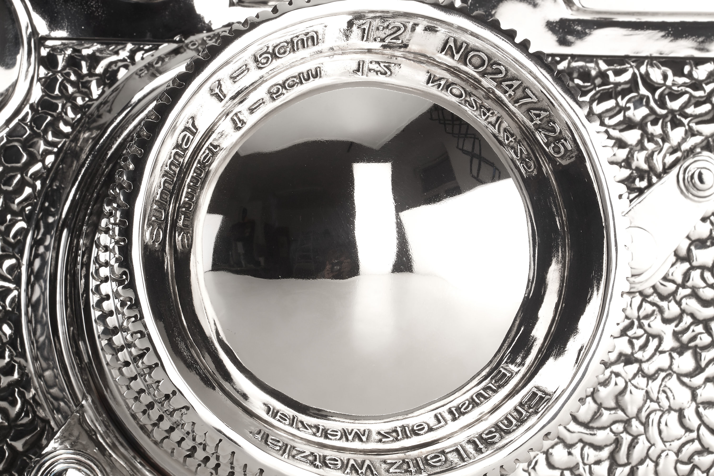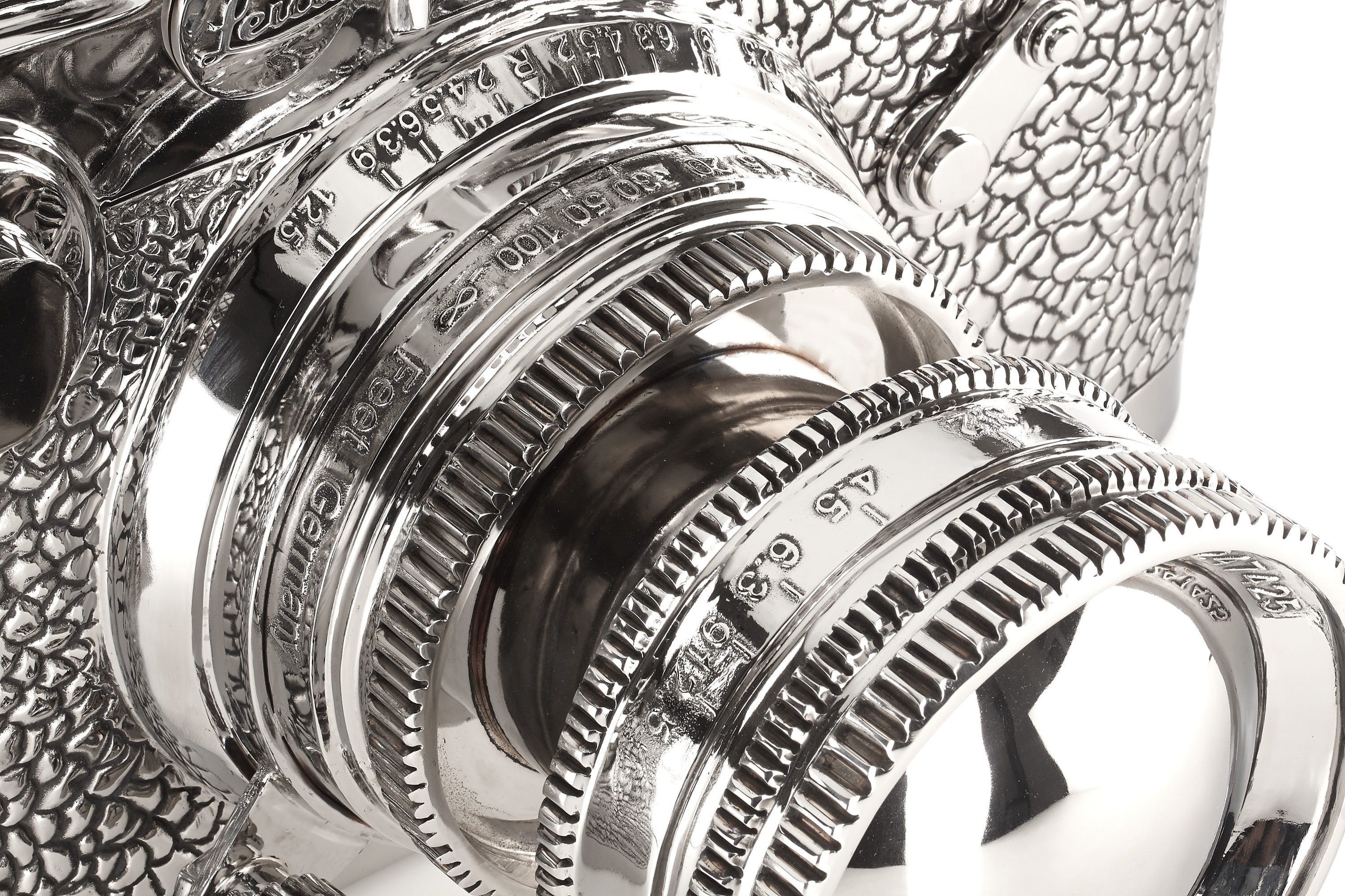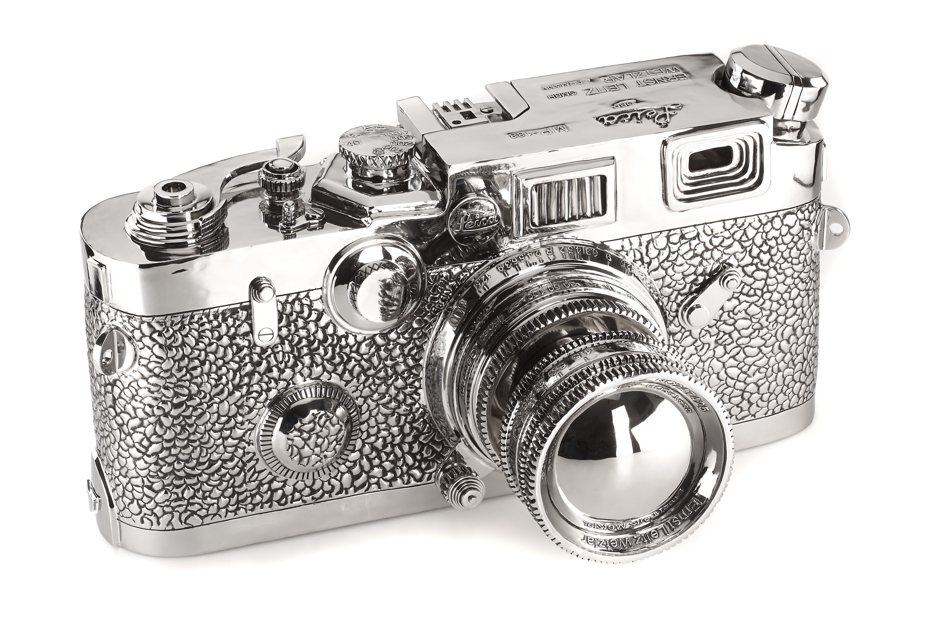 Famous sculpture of the oversized Leica camera created by the Chinese artist Liao Yibay. Only 12 of these sculptures have been made and are extremely hard to find (this particular example is the no.2). On first look the camera looks like an M6, but closer inspection reveals many interesting details borrowed from various analogue and digital Leica models, like the display on the back, slow speeds dial on front, lack of second rangefinder window, MP-188 engraving on top, electronic contacts on the flash shoe etc. The sculptured camera is equipped with ‘Summar’ 2/5cm no.247425 (in a barrel resembling a collapsible Summicron), comes with wooden transportation box and original design drawing by Liao Yibai. The artist is known for creating hand-welded stainless steel sculptures of oversized watches, bags, rings and other luxury items, his work has been acclaimed and exhibited worldwide.