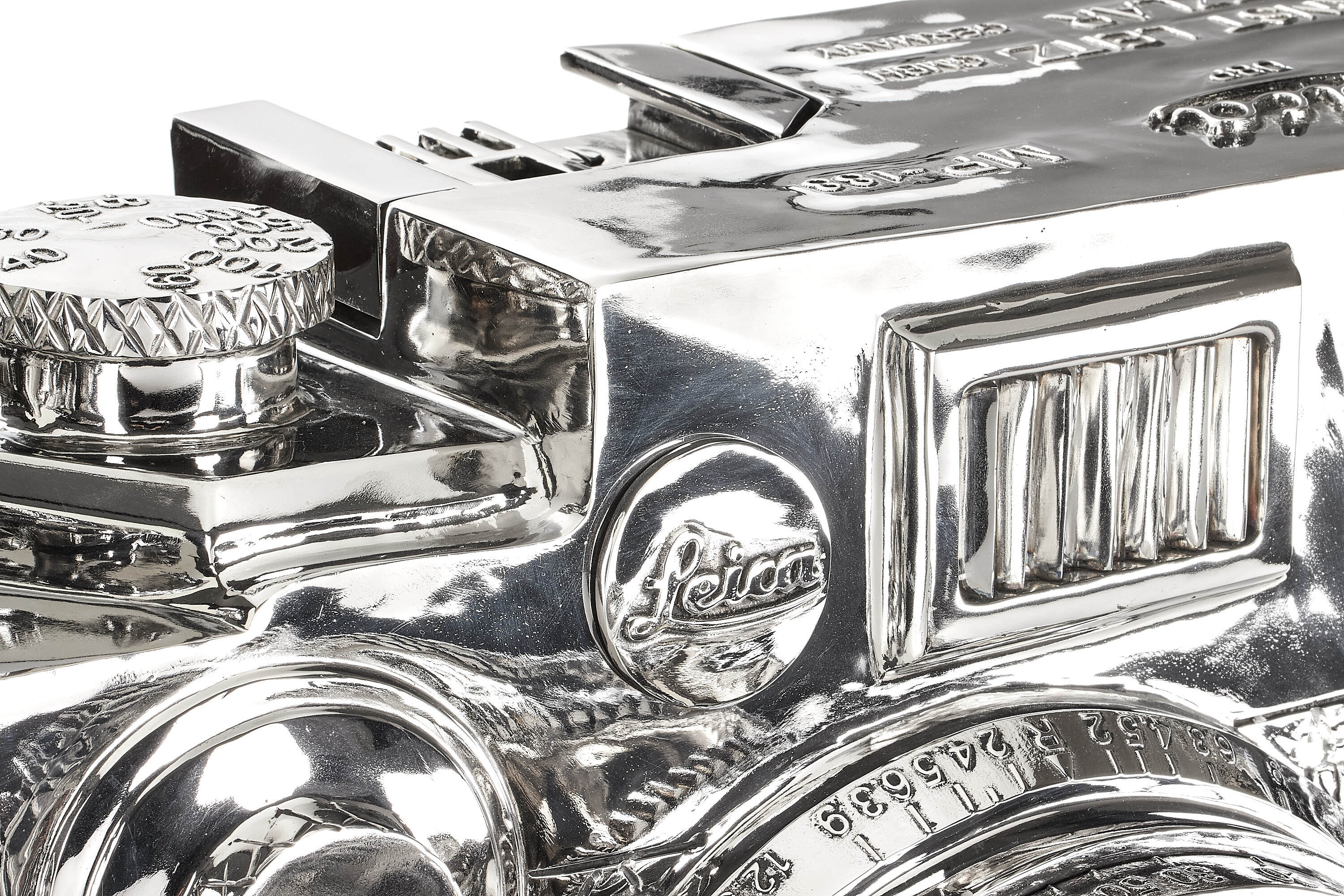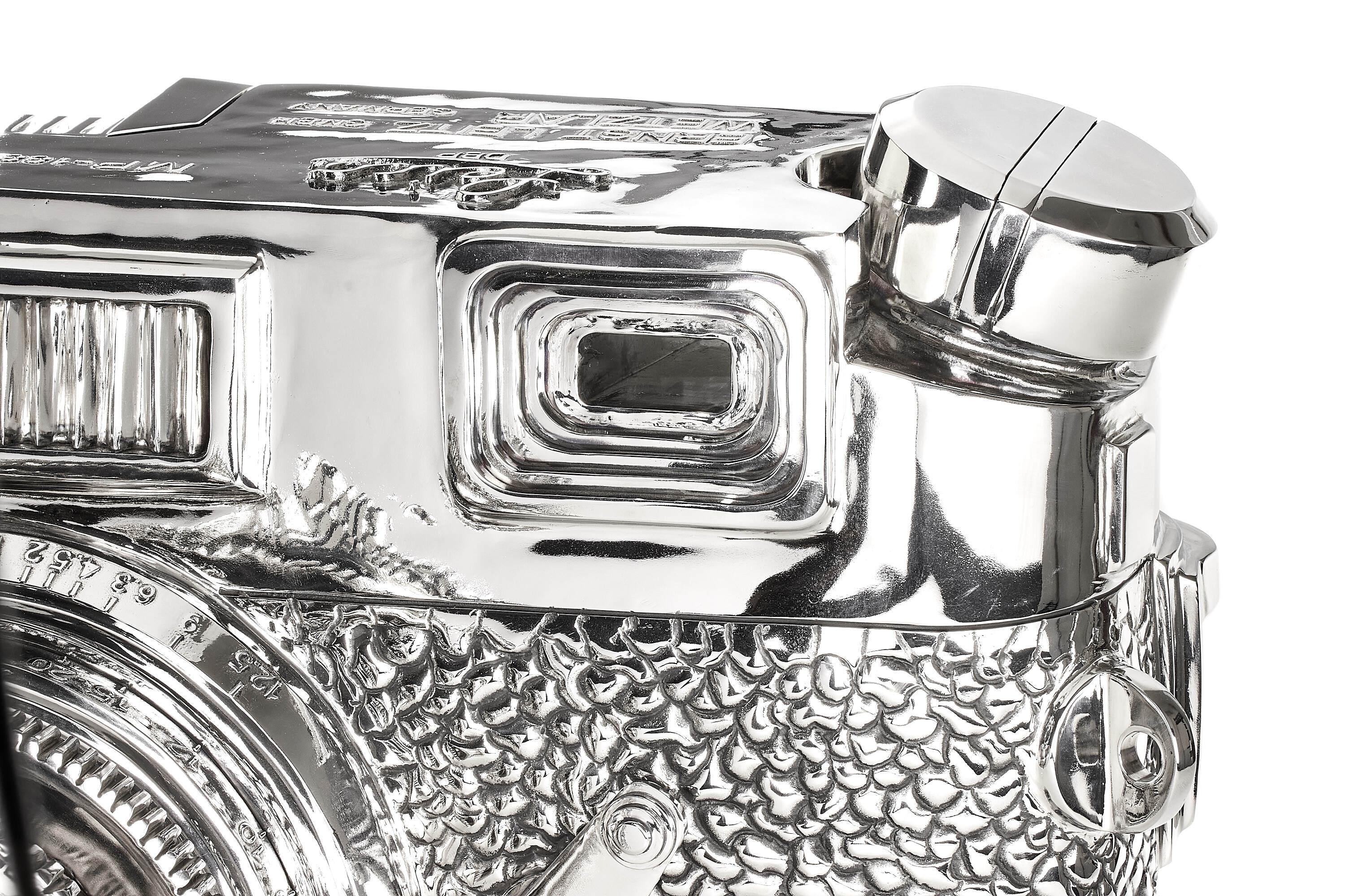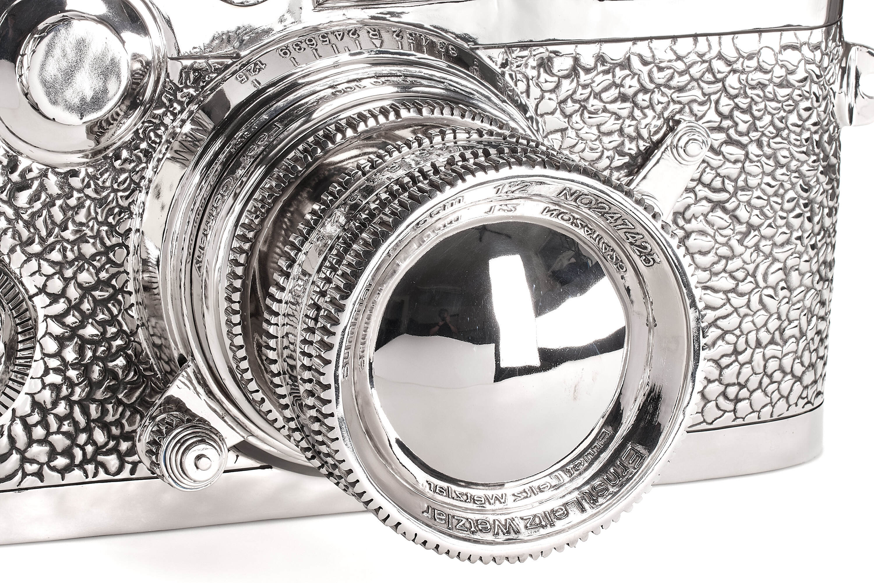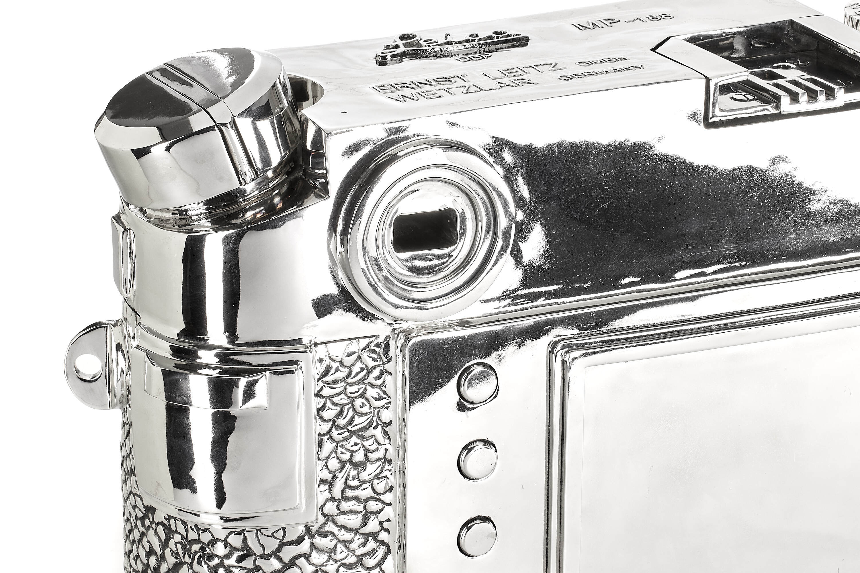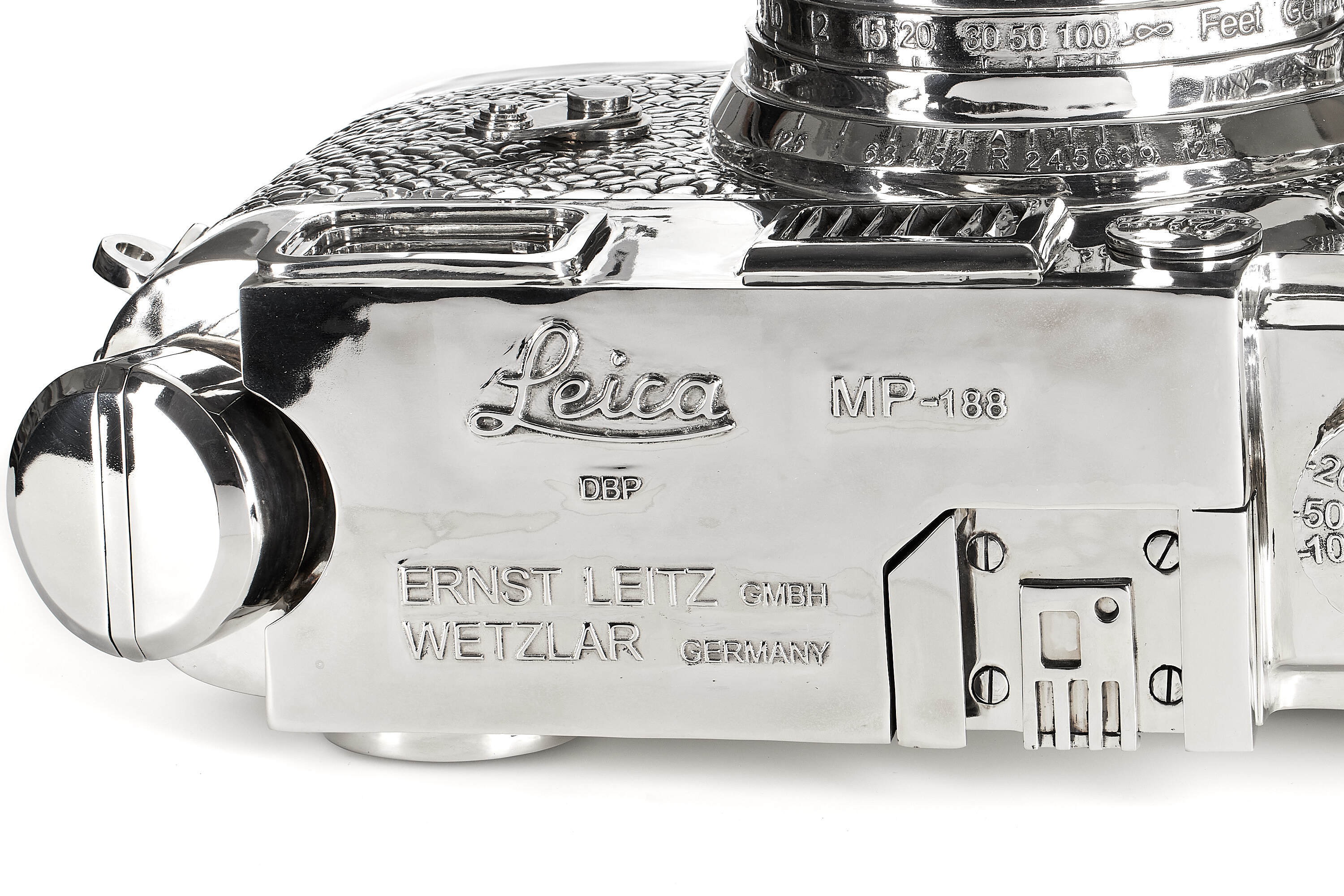 Famous sculpture of the oversized Leica camera created by the Chinese artist Liao Yibay. Only 12 of these sculptures have been made and are extremely hard to find (this particular example is the no.2). On first look the camera looks like an M6, but closer inspection reveals many interesting details borrowed from various analogue and digital Leica models, like the display on the back, slow speeds dial on front, lack of second rangefinder window, MP-188 engraving on top, electronic contacts on the flash shoe etc. The sculptured camera is equipped with ‘Summar’ 2/5cm no.247425 (in a barrel resembling a collapsible Summicron), comes with wooden transportation box and original design drawing by Liao Yibai. The artist is known for creating hand-welded stainless steel sculptures of oversized watches, bags, rings and other luxury items, his work has been acclaimed and exhibited worldwide.