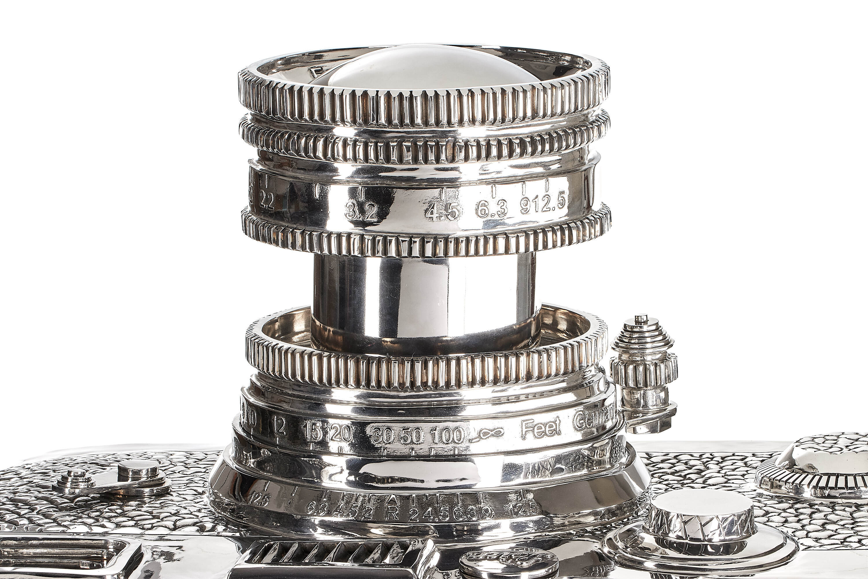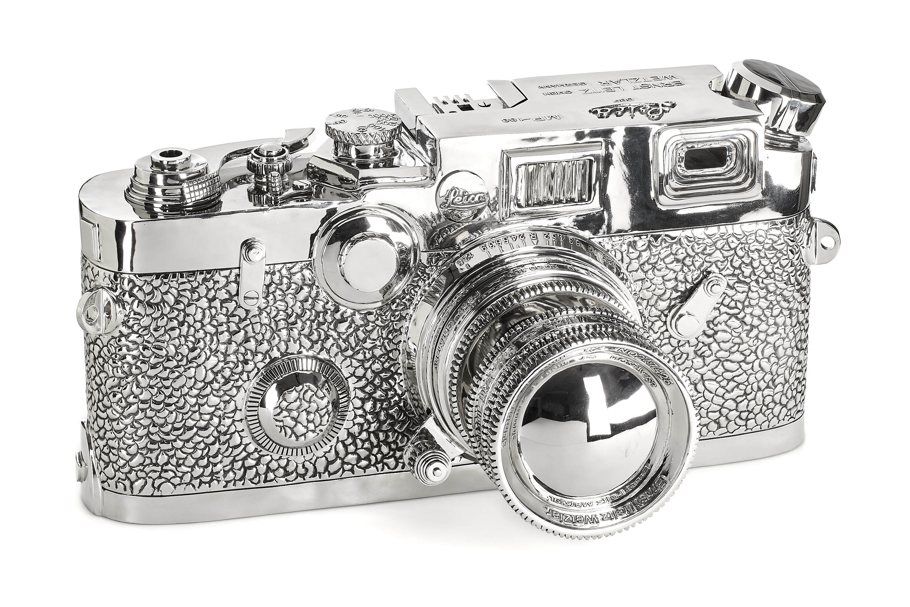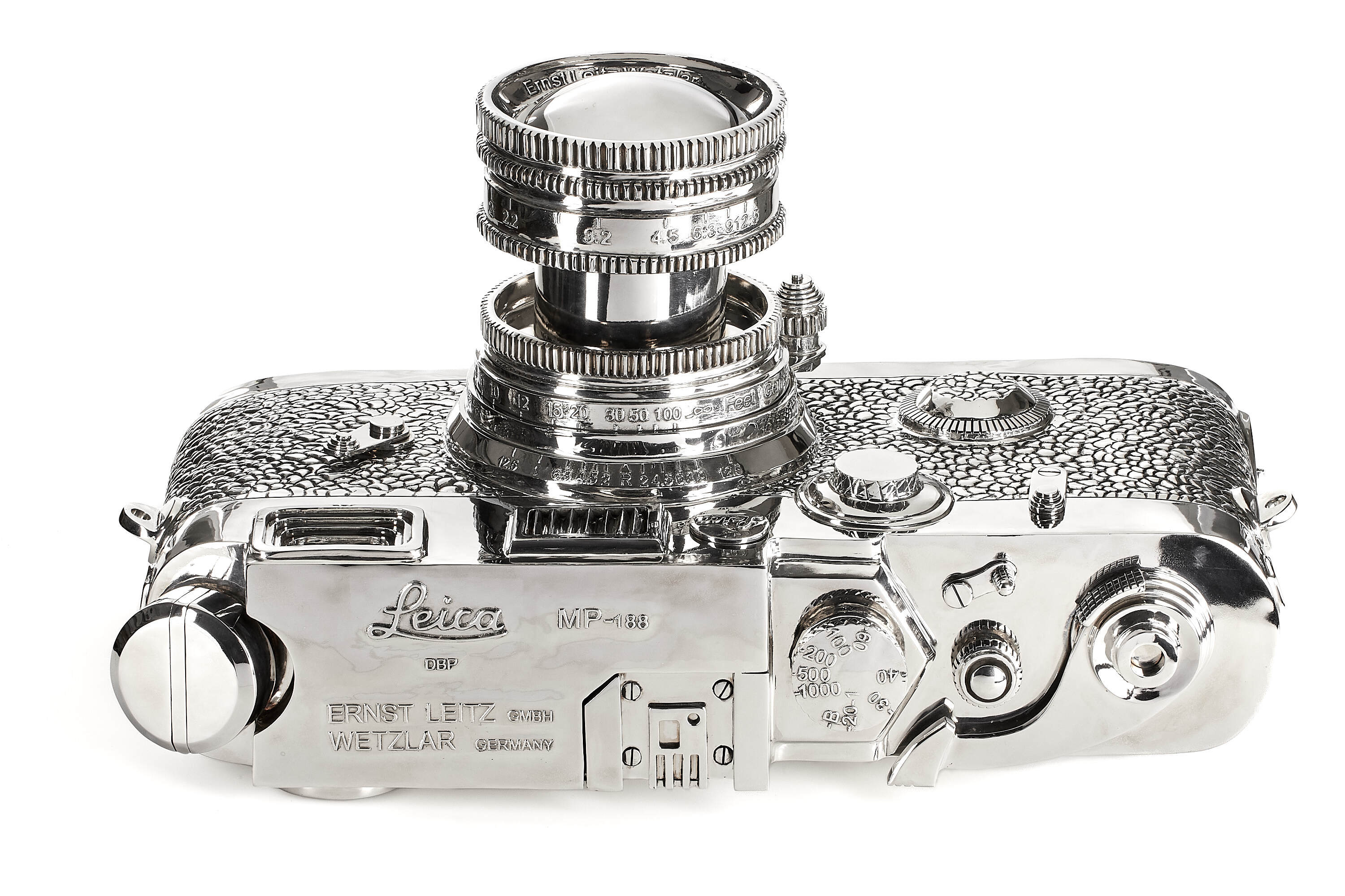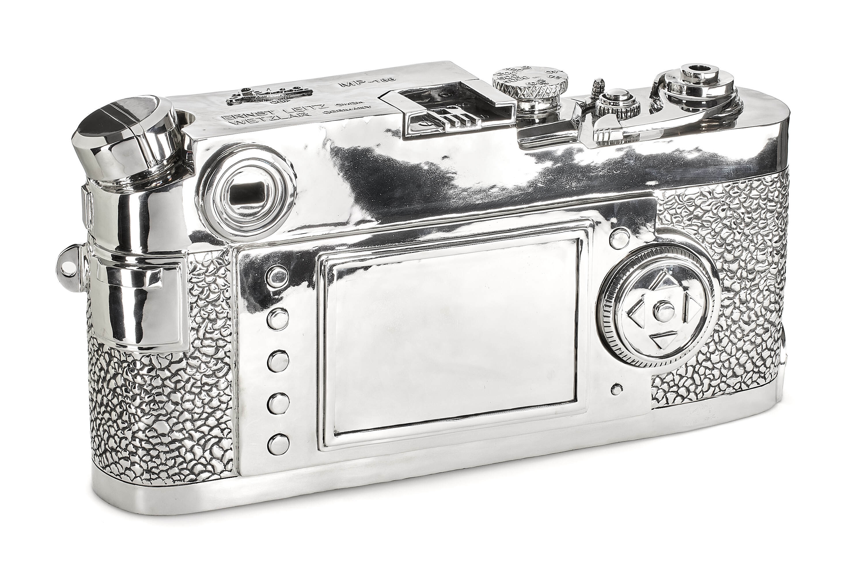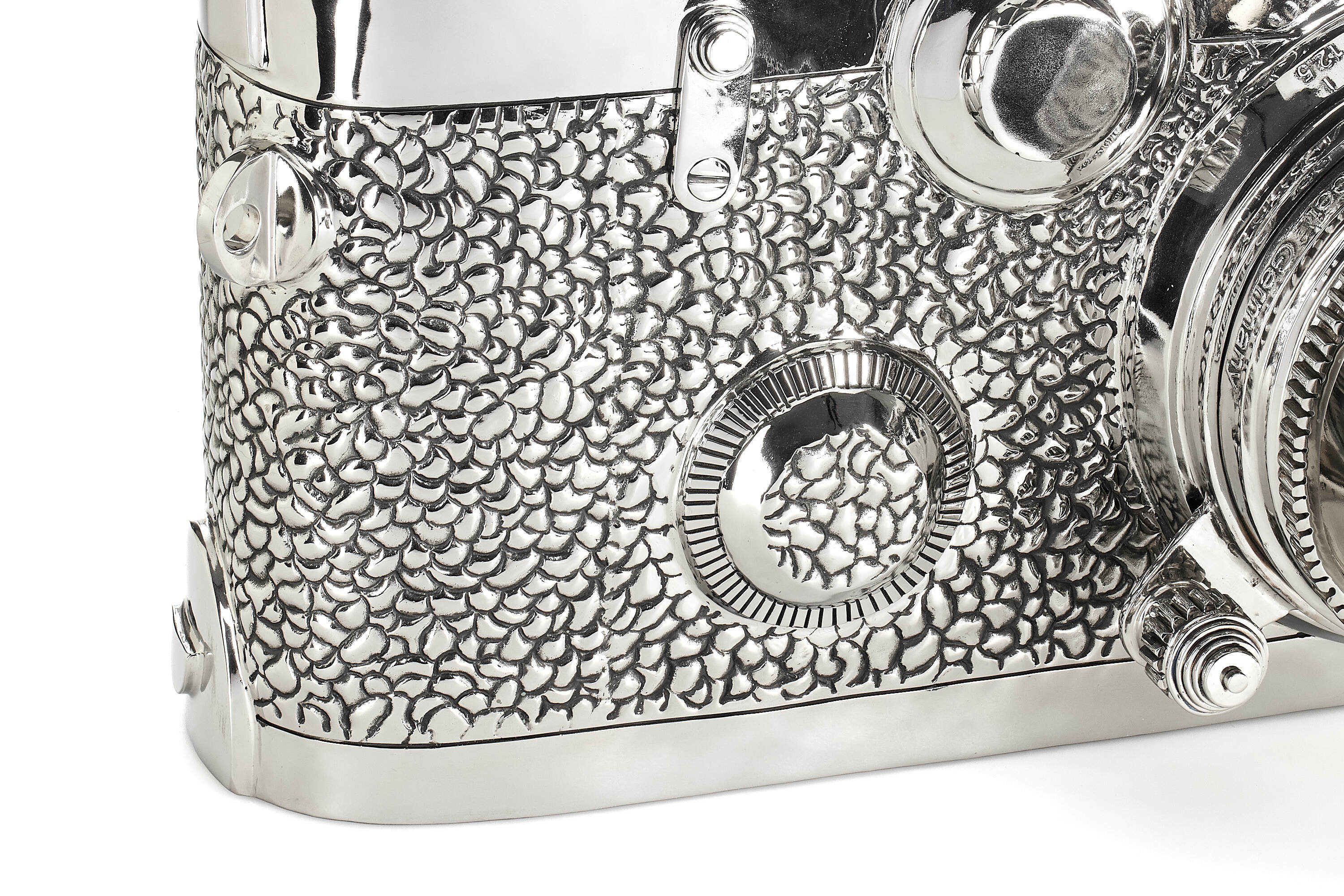 Famous sculpture of the oversized Leica camera created by the Chinese artist Liao Yibay. Only 12 of these sculptures have been made and are extremely hard to find (this particular example is the no.2). On first look the camera looks like an M6, but closer inspection reveals many interesting details borrowed from various analogue and digital Leica models, like the display on the back, slow speeds dial on front, lack of second rangefinder window, MP-188 engraving on top, electronic contacts on the flash shoe etc. The sculptured camera is equipped with ‘Summar’ 2/5cm no.247425 (in a barrel resembling a collapsible Summicron), comes with wooden transportation box and original design drawing by Liao Yibai. The artist is known for creating hand-welded stainless steel sculptures of oversized watches, bags, rings and other luxury items, his work has been acclaimed and exhibited worldwide.