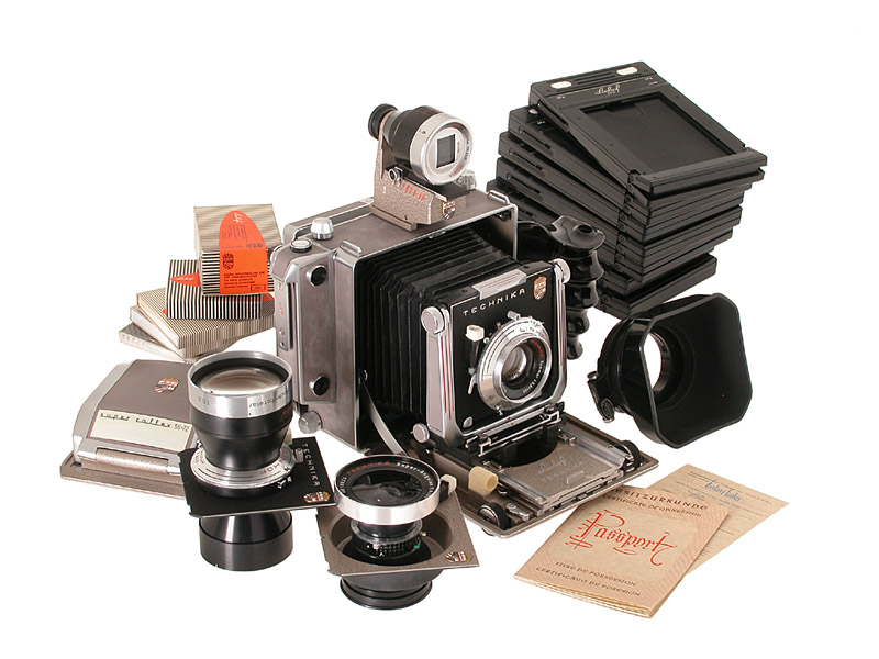 9x12cm, gepflegte Ausrüstung mit sehr schöner Super Technika IV, Mattscheibenrückteil, Griff, Universalsucher, Super Rollex 56x72mm, Technika Symmar 5,6/150 Nr. 6543424, Technika Super-Angulon 8/90 Nr. 6618824, Rodenstock-Rotelar 5,6/270mm Nr.4296514, 10 Doppelkassetten und weiteres Zubehör, Papiere inkl. Besitzurkunde, Wechselsack, Metallkoffer