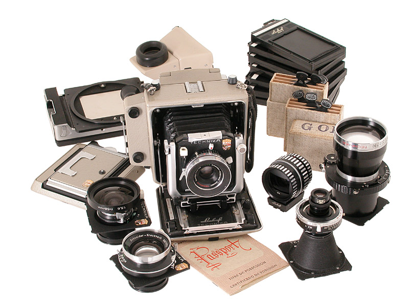 Sehr komplette und gepflegte Ausrüstung bestehend aus : Super Technika V 6x9cm, Super Rollex 56x72mm, Universalrückteil, Polaroidrückteil, Lichtschachtaufsatz mit Umkehrspiegel, Technika Symmar 5,6/100 Nr.9890001, Linhof Technikon 5,6/58mm Nr.6153954, Technika Symmar 5,6/180 Nr.9971771, Technika Tele-Xenar 5,6/360mm Nr.10223790, Carl Zeiss Luminar 63mm/0,1 Nr. 4879667 in Linhof Synchro-Compur, Carl Zeiss Luminar 3,5/25mm Nr.4431770, Linhof Zoomsucher 53-240mm, Sonnenblende, 12 Doppelkassetten, diverse Filter und weiteres Zubehör, Anleitung, Besitzerurkunde - die aus Erstbesitz stammende Ausrüstung wird dem neuen Besitzer viel Freude bereiten !
