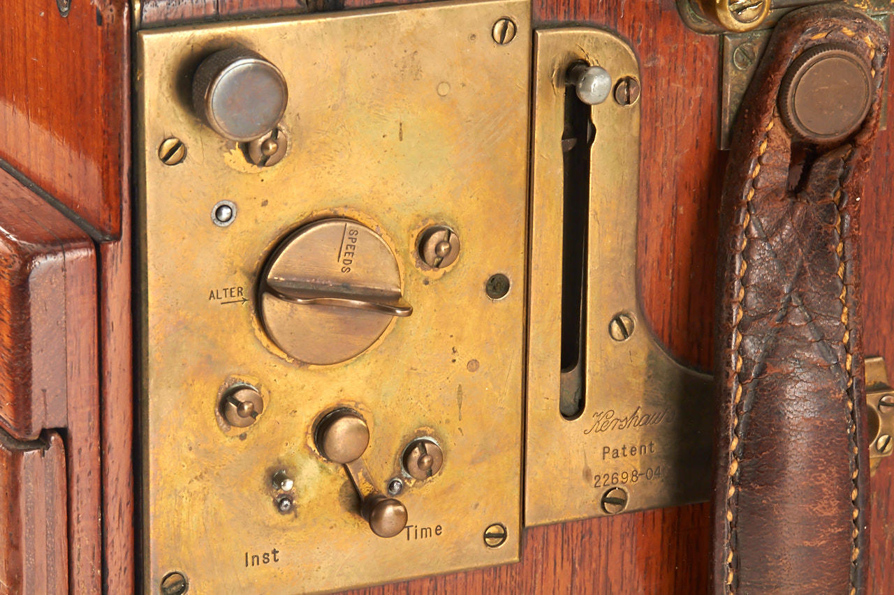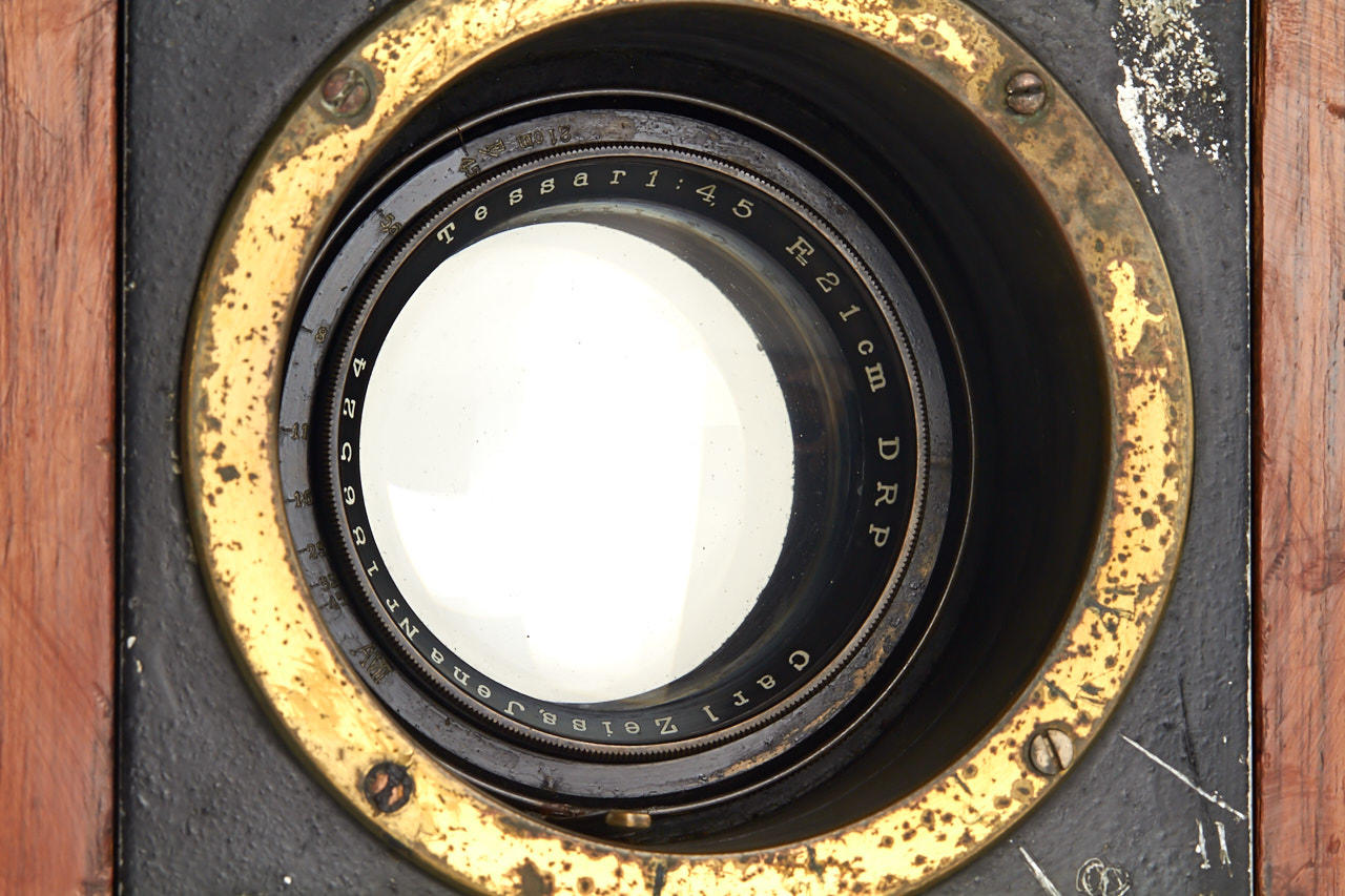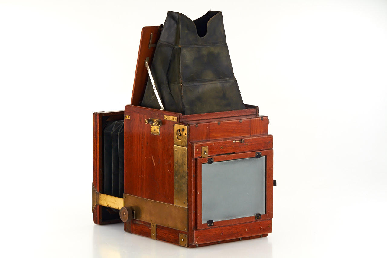 rare half plate tropical SLR camera in good shape with normal signs of use, Carl Zeiss Jena Tessar 4,5/21cm DRP no.186524, in fully original condition with green leather hood and bellows