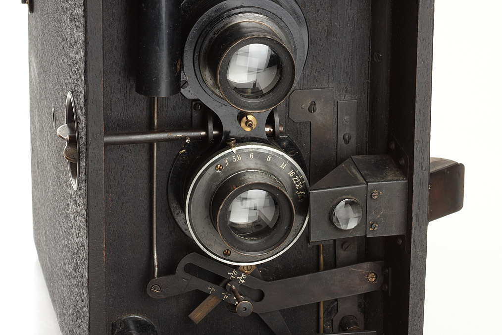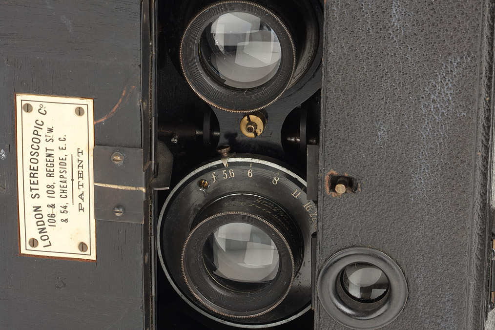 quarter-plate TLR, internal drop-plate magazine, with viewing lens no.19799, taking lens London Stereoscopic Co 5x4 Twin Lens "Carlton" Camera no.197994 in shutter, in original condition, case