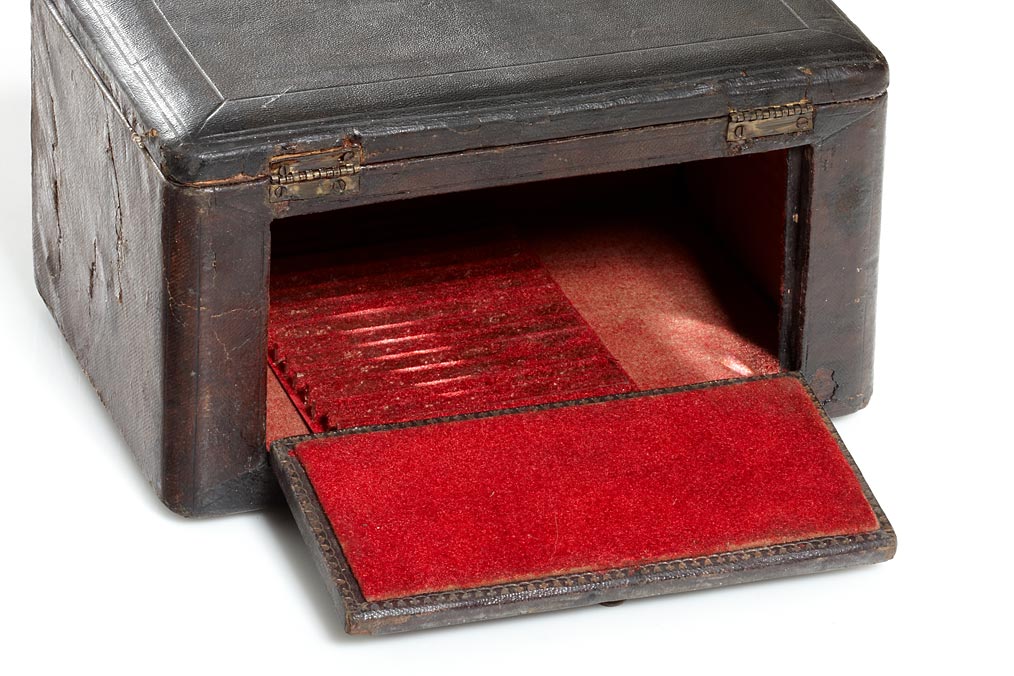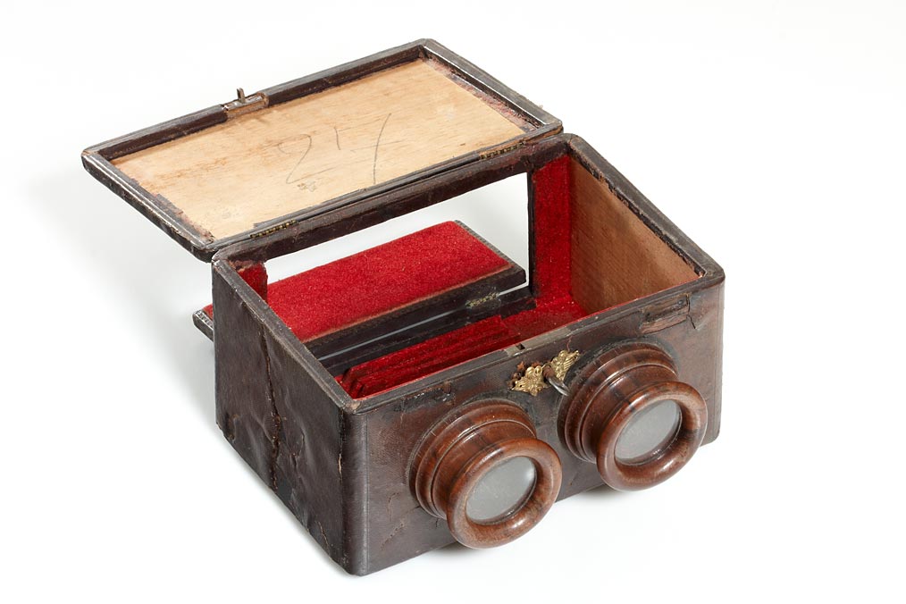 patented on April 15 1856, the Lyod's Stereoscope is one of the first viewers produced in the United States, different designs are known to exist, this later and unusual model has a rear hinged lid and reveals velvet lined slots for twelve glass stereo slide views. The slides can be placed at various distances from the lens to achieve optimum focus and the slots can also be used to store the views. Externally covered in brown leather, on the rear closing flap a small impressed makers label, large turned eyepieces and a decorative keyhole cover, the velvet has been replaced and the leather unfortunately has seen some unskilful restoration, but still an significant and important viewer.