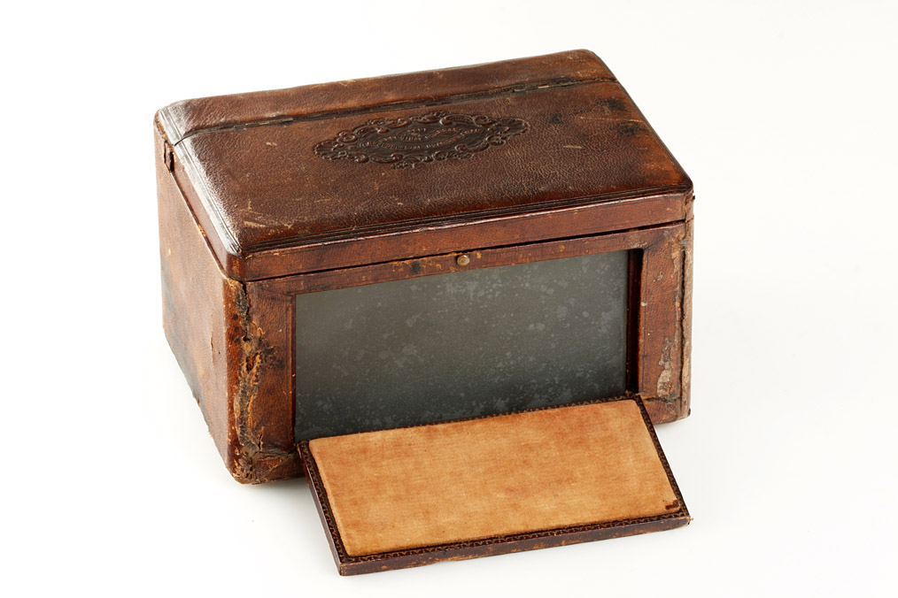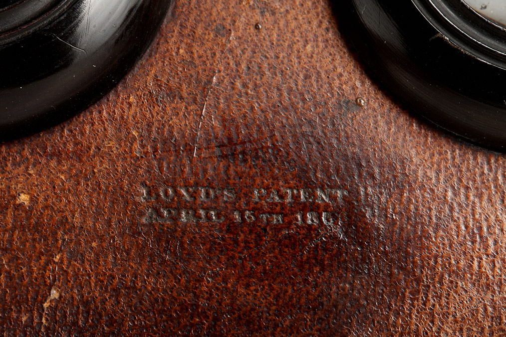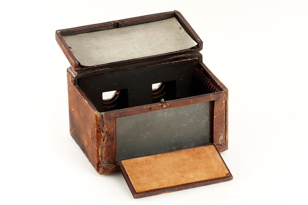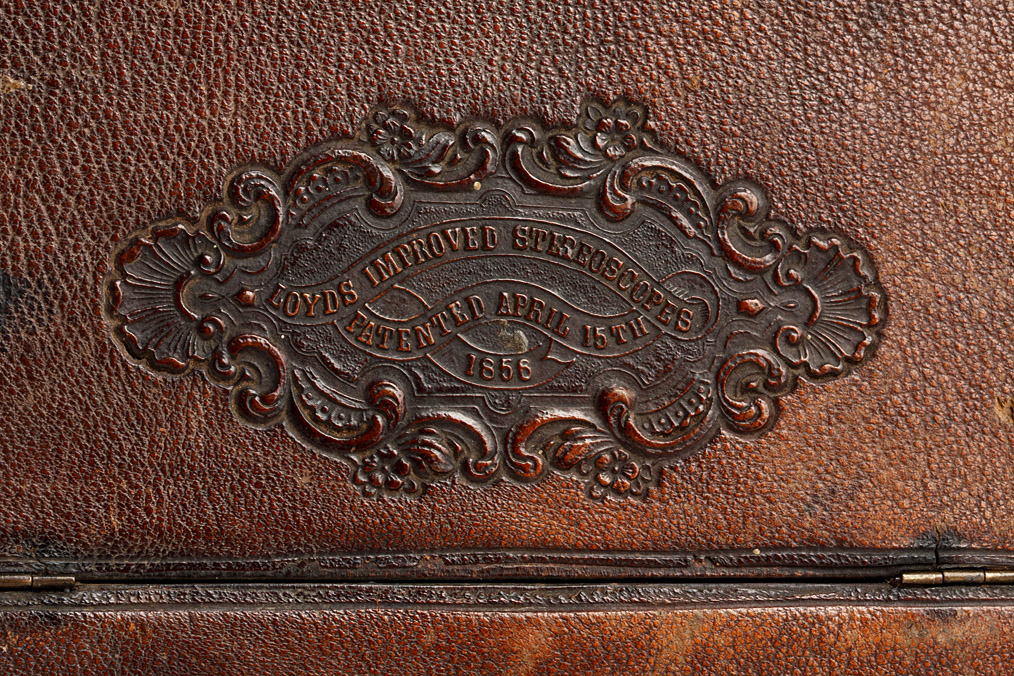 patented on April 15 1856, the Loyd's Stereoscope is one of the first viewers produced in the United States, different designs are known to exist, this later and unusual model has a rear hinged lid and reveals slots for twelve glass stereo slide views. The slides can be placed at various distances from the lens to achieve optimum focus and the slots can also be used to store the views. Externally covered in brown leather, on the hinged top lid impressed makers label, large turned eyepieces, comes with the extremely rare original diffusion screen made of etched glass. The leather lining is original and intact, although due to old age torn on several spots, the right eyepiece is cracked otherwise the viewer is in good original condition. A significant and important piece. Ex-Naylor collection.