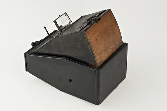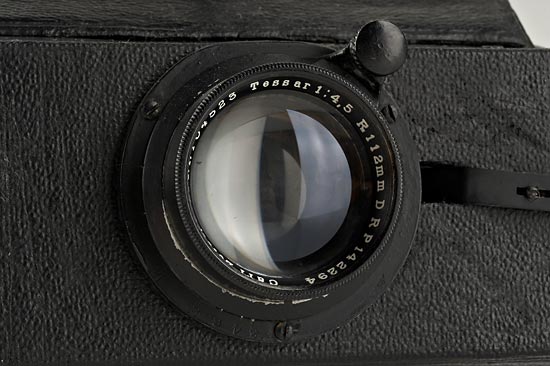 6.5 x 9cm, with Tessar 4.5/112mm no.104523 lens, the top of the camera is hinged and pivots to change plates. Ex Spira Collection.