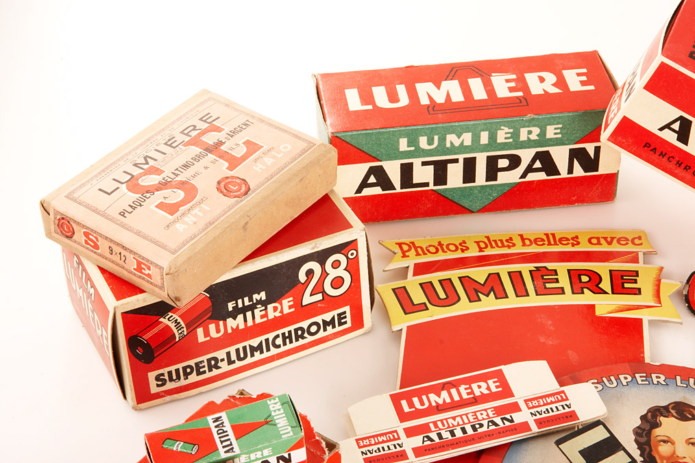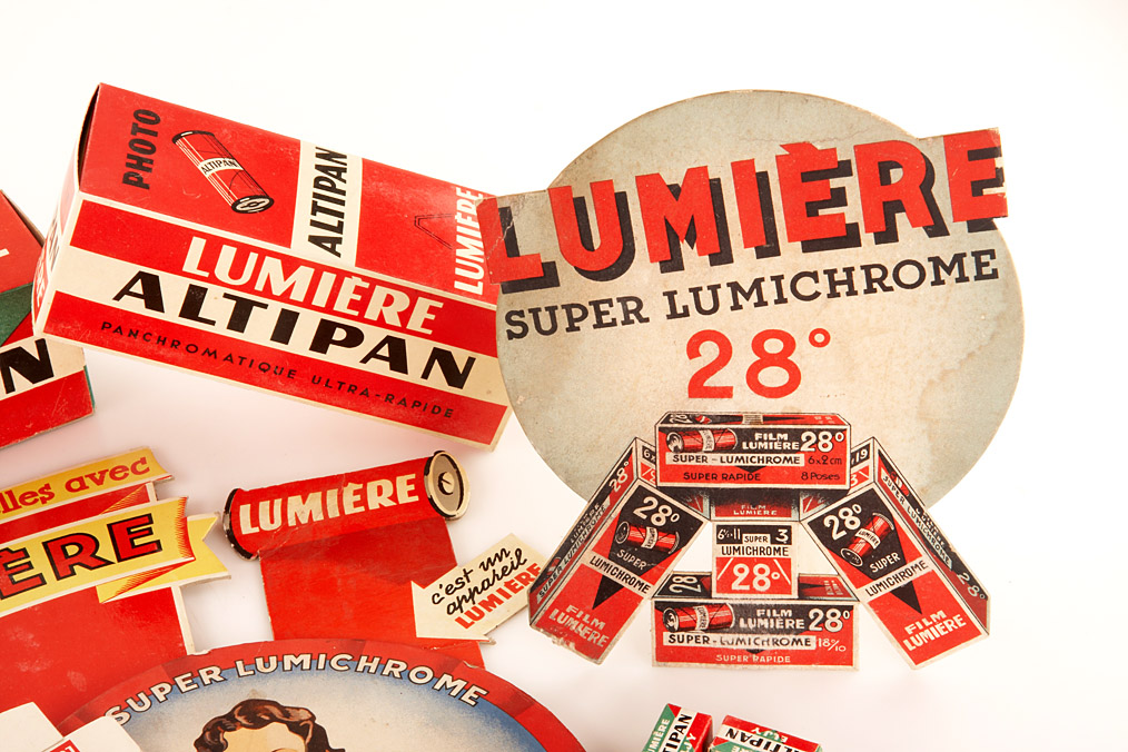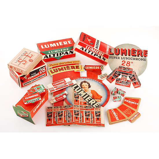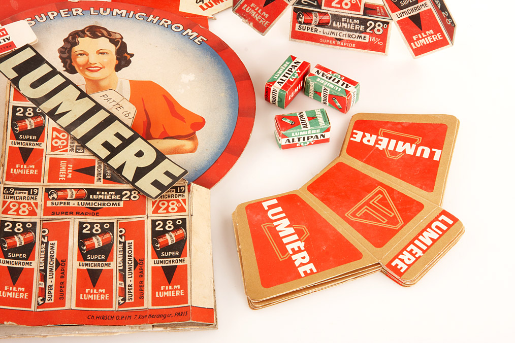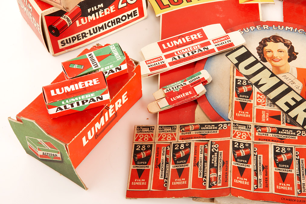 extensive collection of adverting material for the Lumiere Altipan and Lumichrome film, among the 30 pieces in various condition: 4 decorative cardboard stands, 3 oversized cardboard film boxes, unused paper stands and unused boxes for Altipan and orthochromatic negative glass plates. A great find! (30)
