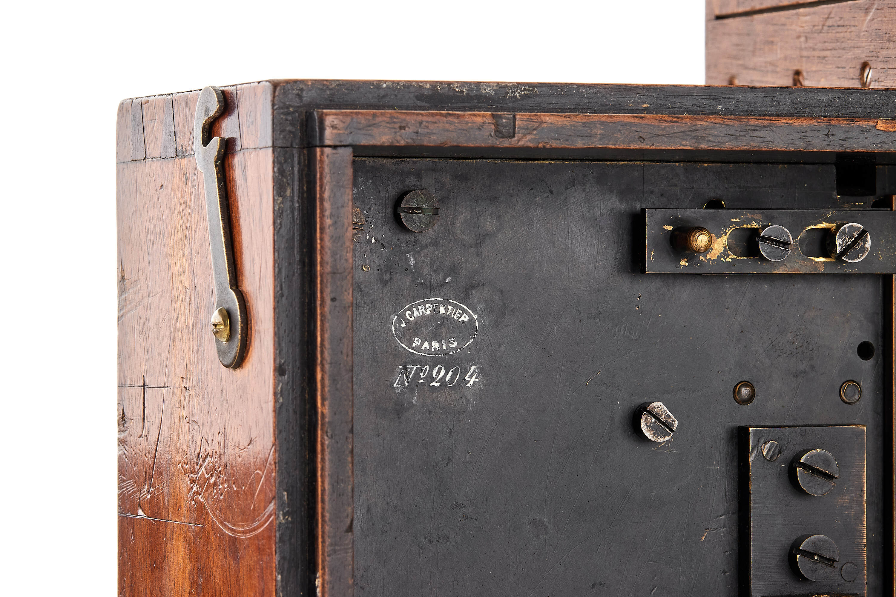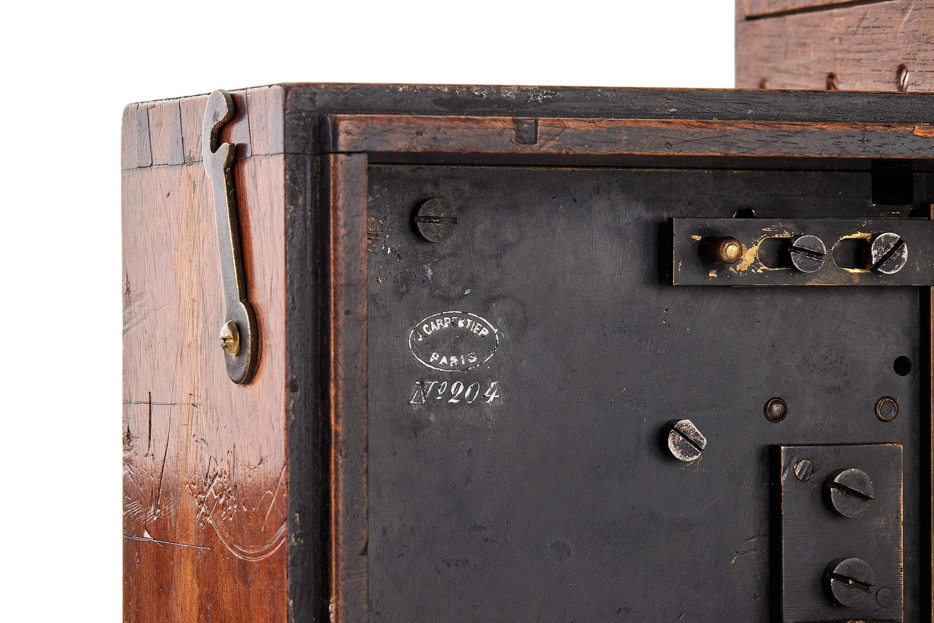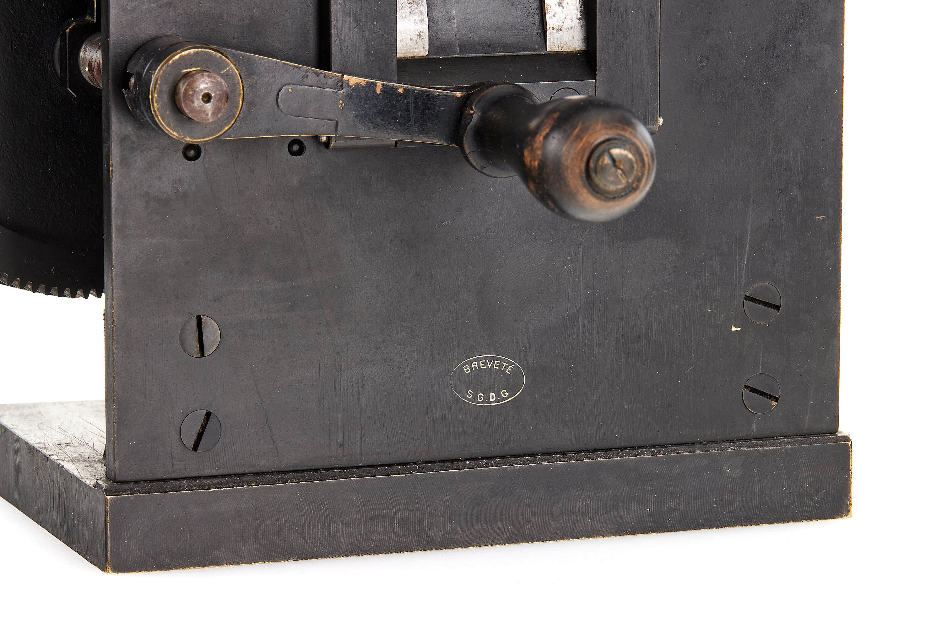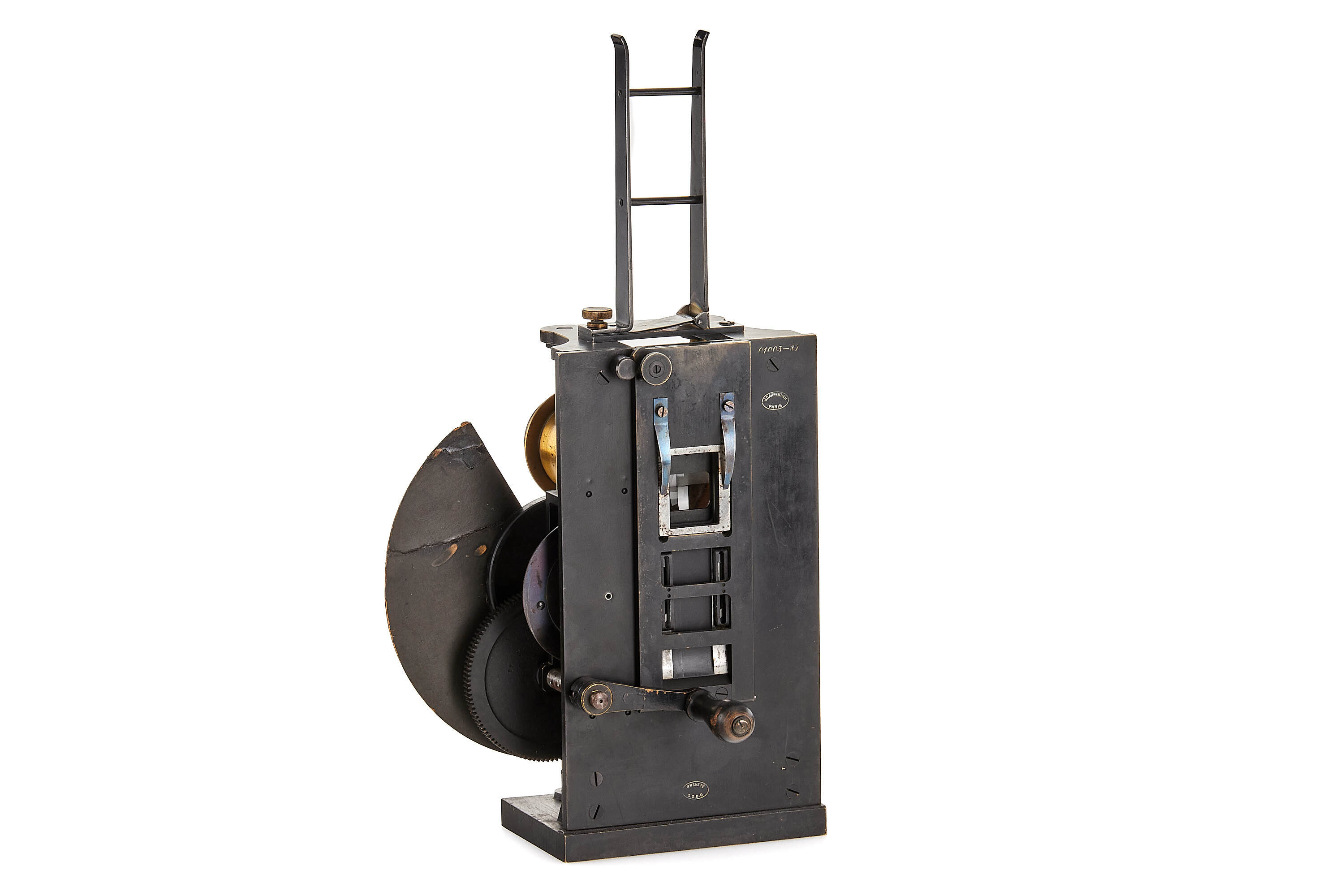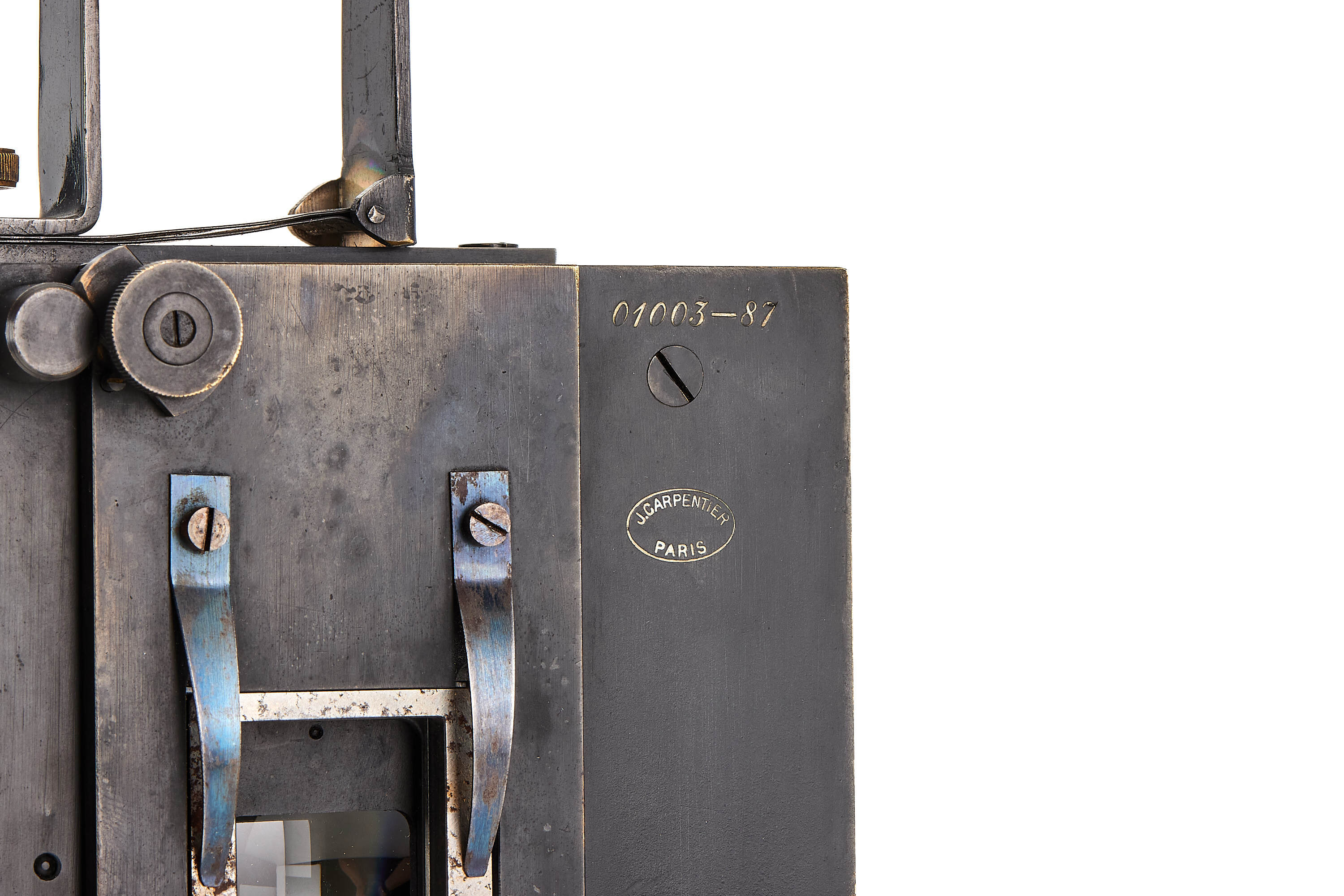 Additionally included is a separate Carpentier projector from 1897, no.1003-87, also preserved in excellent condition and in working order; the shutter wheel is glued. This dedicated projection device illustrates the rapid technical evolution of cinema during its formative years.