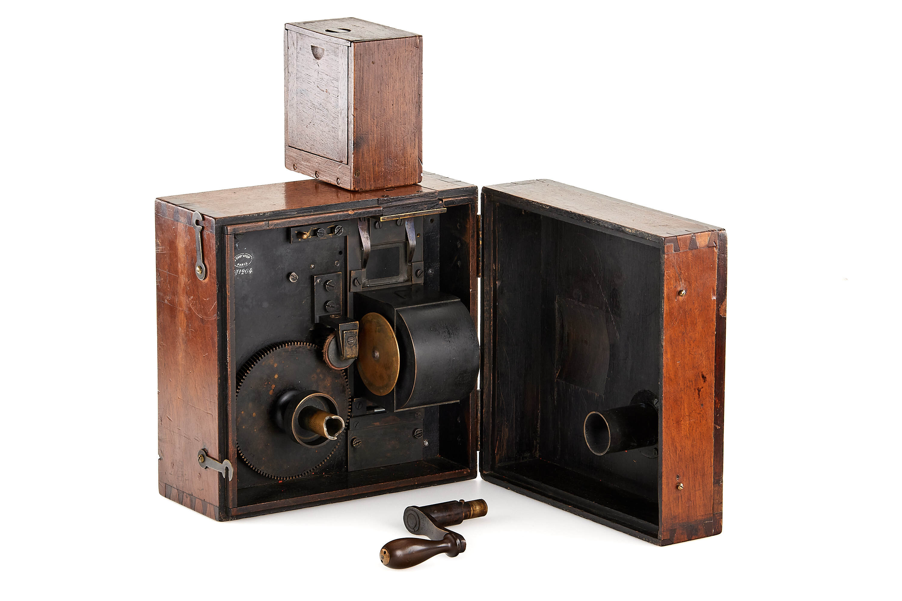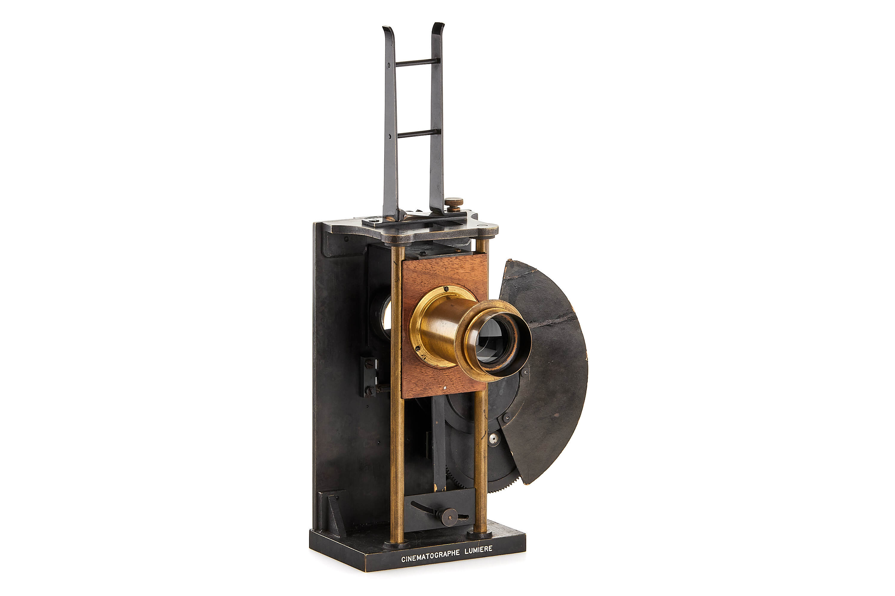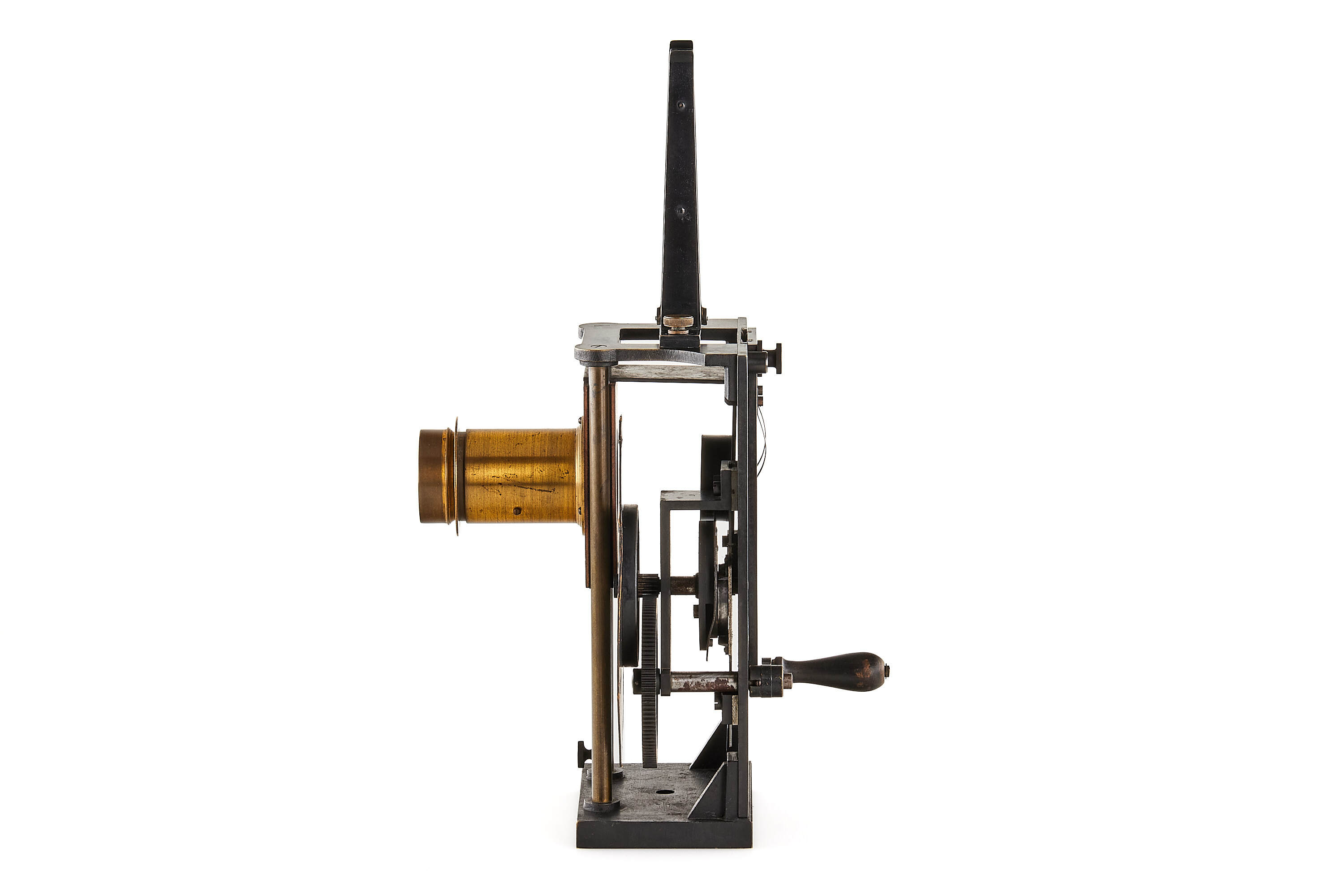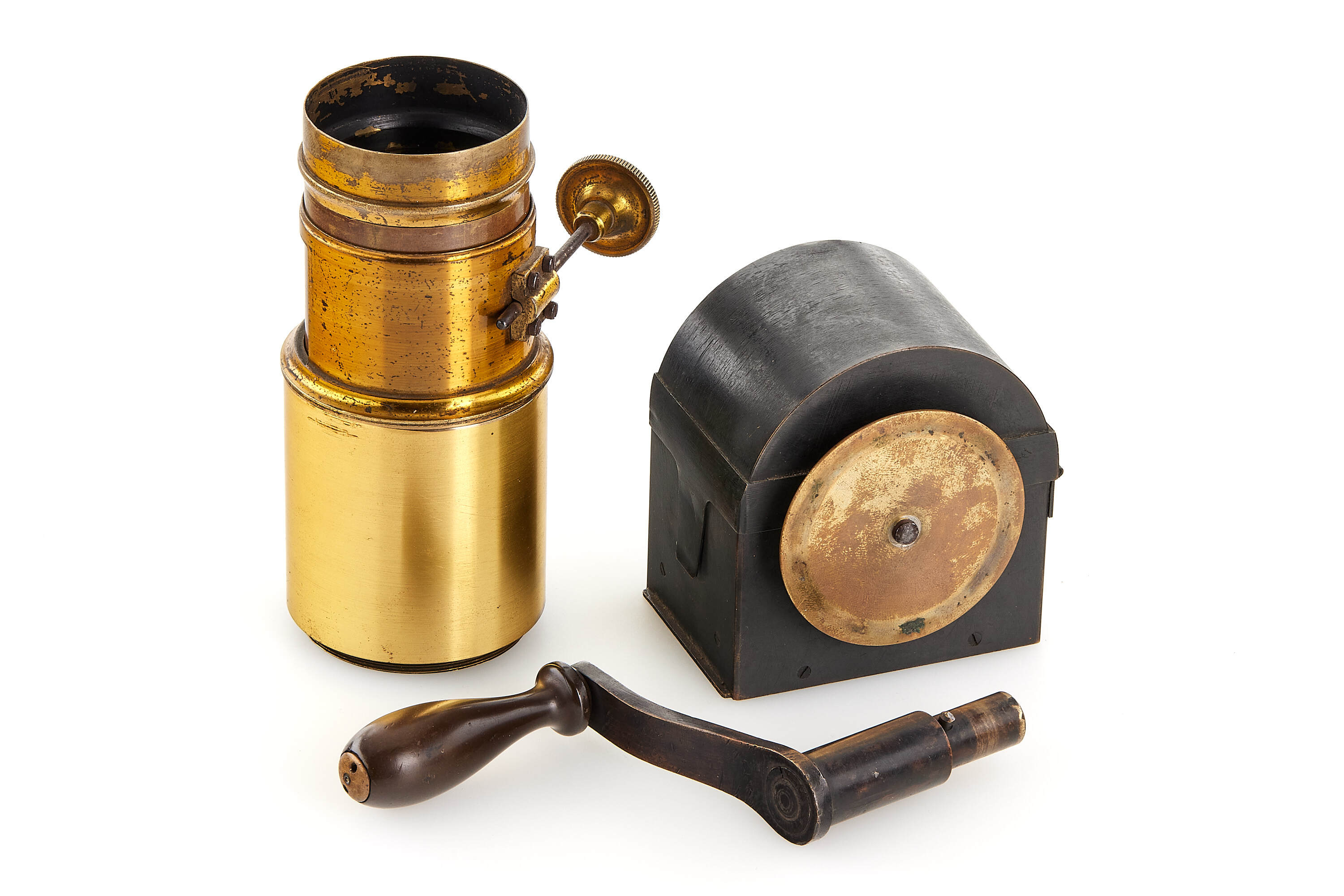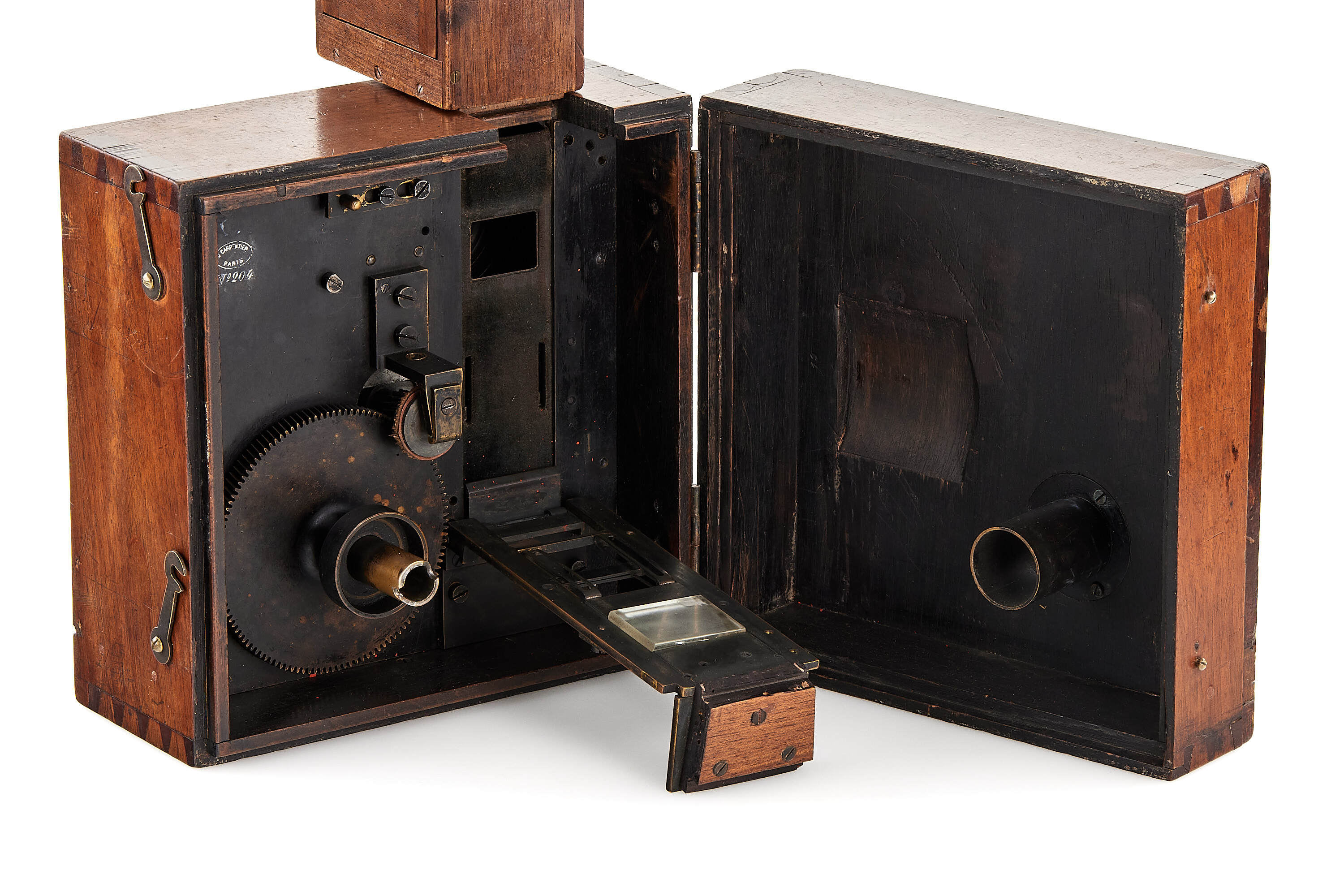 The offered ensemble comprises an original Lumière Cinématographe no.207, complete with its taking lens and matching projection lens, preserved together with its original wooden film cassette and the original wooden tripod featuring the characteristic slot for film. The apparatus is in excellent, well-preserved condition and remains in working order, with smooth mechanical operation. As an early production example of this foundational device, it represents a highly important survival from the very beginnings of cinematography.
