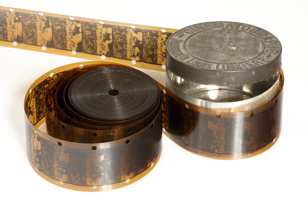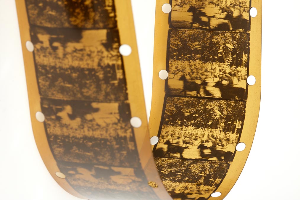 one reel of 35mm Lumiére film in a rare original tin film canister with the makers label stamped into the lid, the filmstrip is perforated concerning to the Lumière standard with one circular on either side of the frame, it is very well preserved and shows no mechanical damage or signs of chemical disintegration. This film is one of three Lumiére films being sold at this auction featuring shots from the Military riding school in Saumur in the west of France, the original title is: ‘Ecole de cavalerie de Saumur, le carrousel militaire: doublements dans la largeur.’