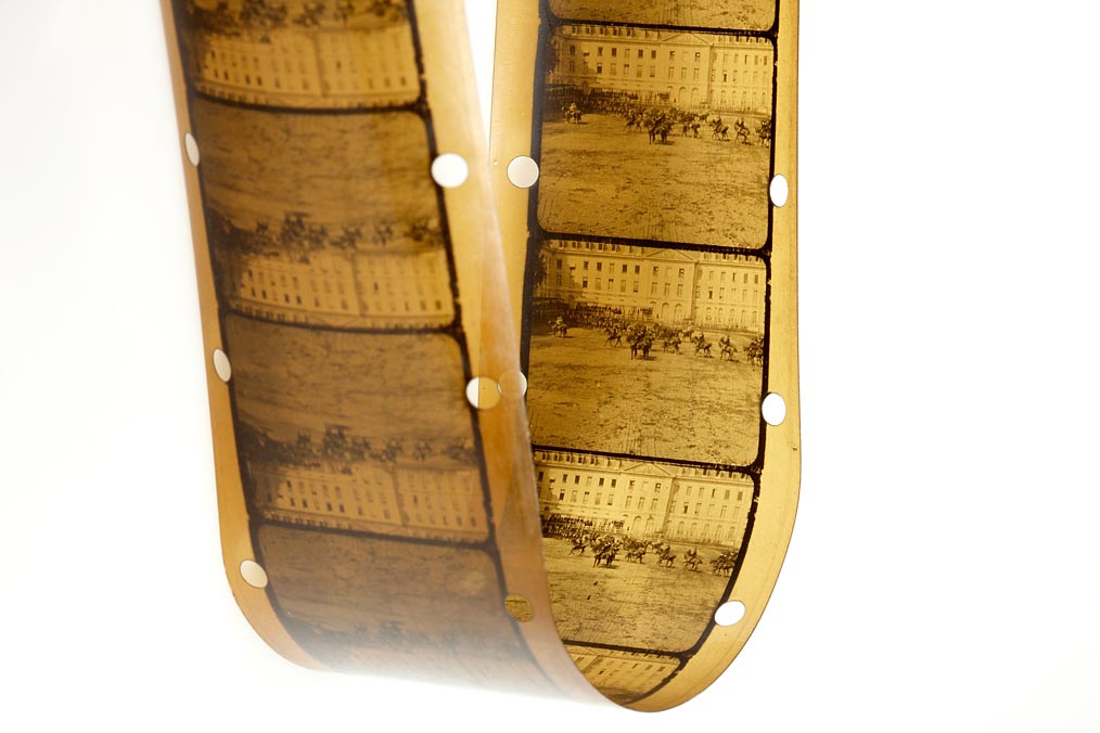 one reel of 35mm Lumiére film in a rare original tin film canister with the makers label stamped into the lid, the filmstrip is perforated complying to the Lumière standard with one circular hole on either side of the frame, it is very well preserved and shows no mechanical damage or signs of chemical disintegration. One of four original Lumiere films being sold at this auction featuring shots form the Military riding school in Saumur in west of France, with the title: ‘Ecole de cavalerie de Saumur, le carrousel militaire: le quatre grands circles.’