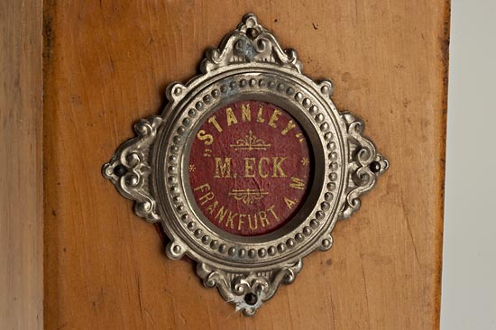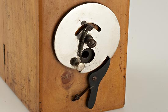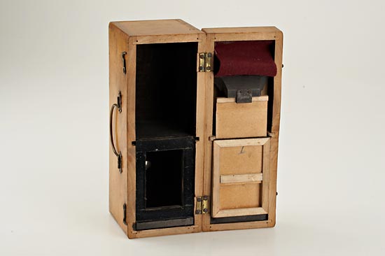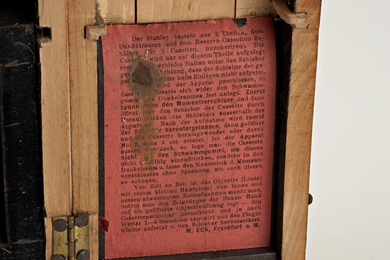 unknown detective camera in form of a wooden box with metal handle, simple nickel single speed shutter, for plates 4.5x6cm, the original instructions are attached inside the camera