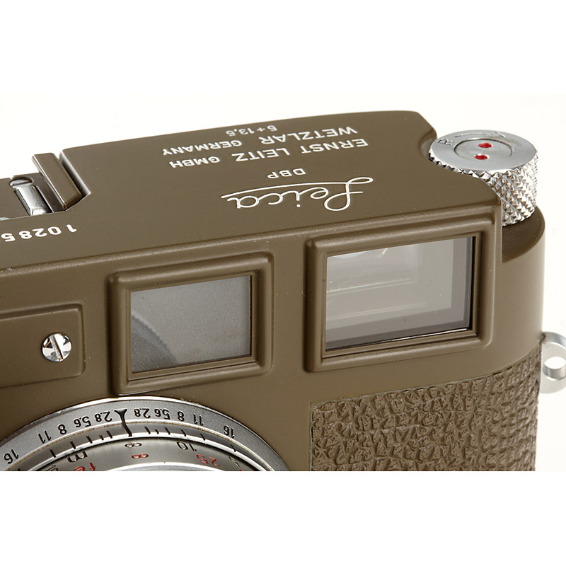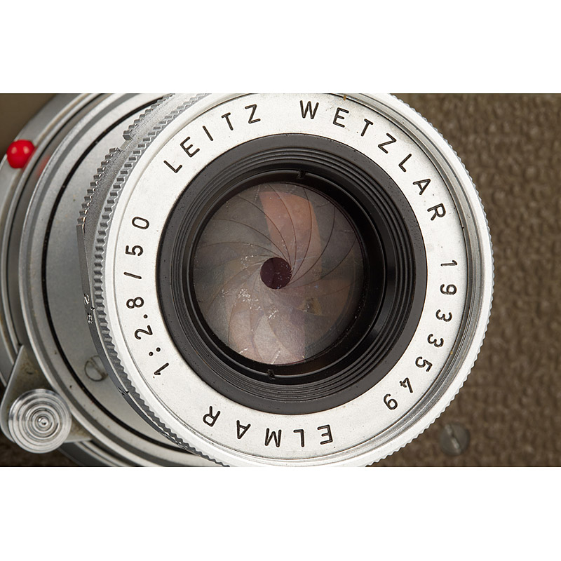 M1 green engraved 'Bundeseigentum 12-129-7739', rare type with 5+13,5cm engravings near eyepiece, M3(MP) type top-plate, only 75 of these cameras were produced and delivered to Wilhelmshaven, fully restored by Leitz around 1970 with original parts (expertise Ottmar Michaely), chrome Elmar 2.8/50mm no.1933549, cap, olive everready case marked 'Bundeseigentum'