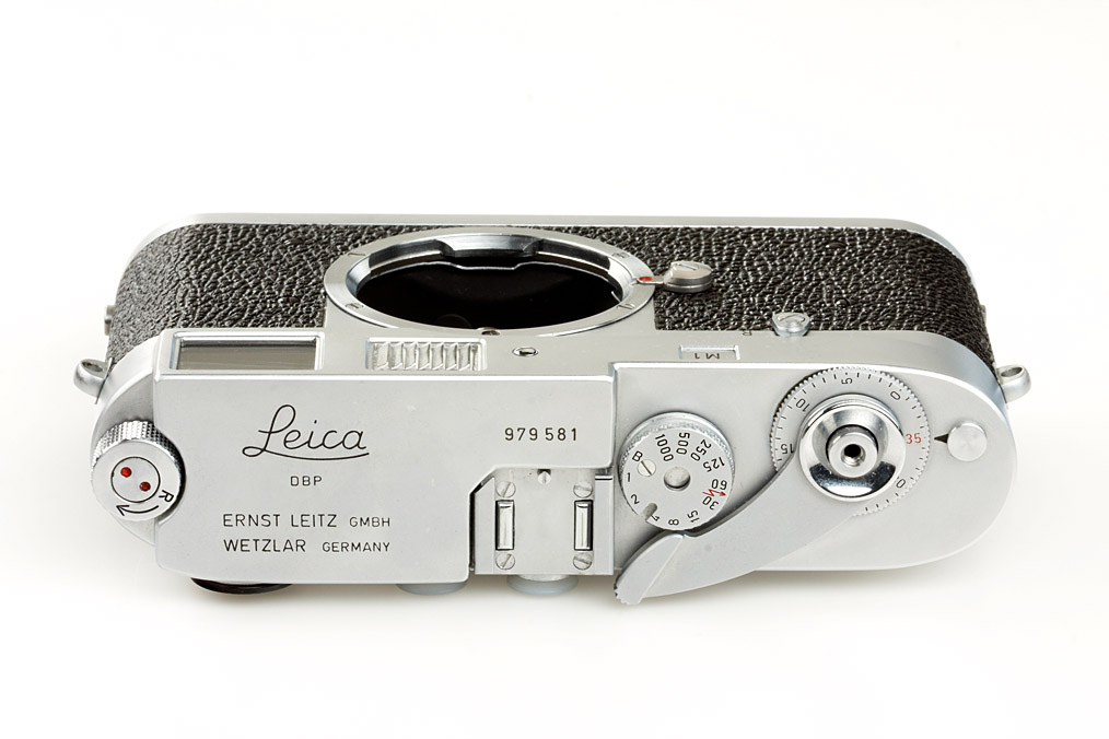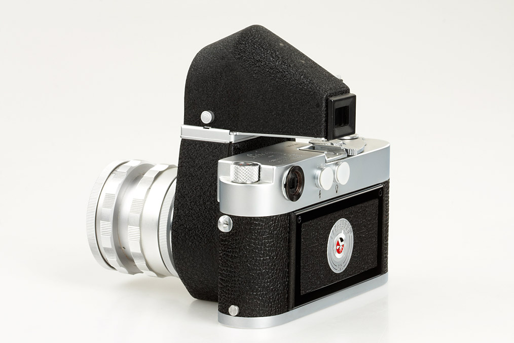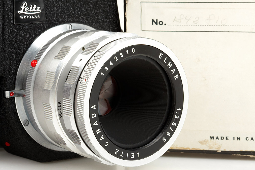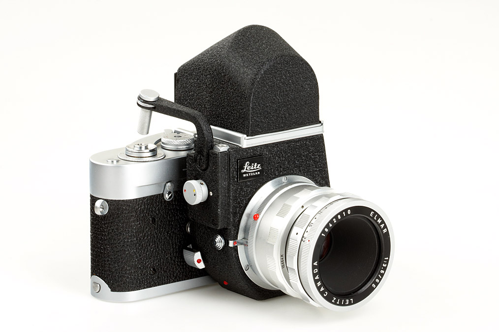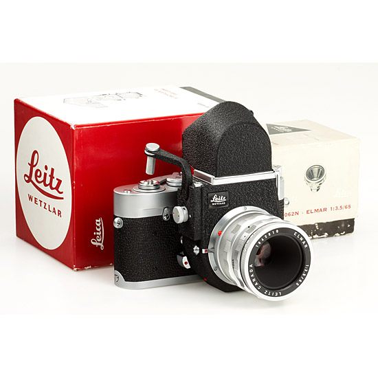 body in good working condition (cond.B+) with mint Visoflex III wit black logo and 16499 90° 4x magnifier (maker's box) and near mint chrome Elmar 3.5/65mm no.1842810 with 16464K focusing mount (maker's box for Elmar with matching serial number)
