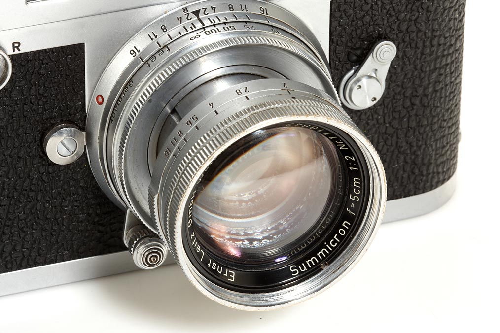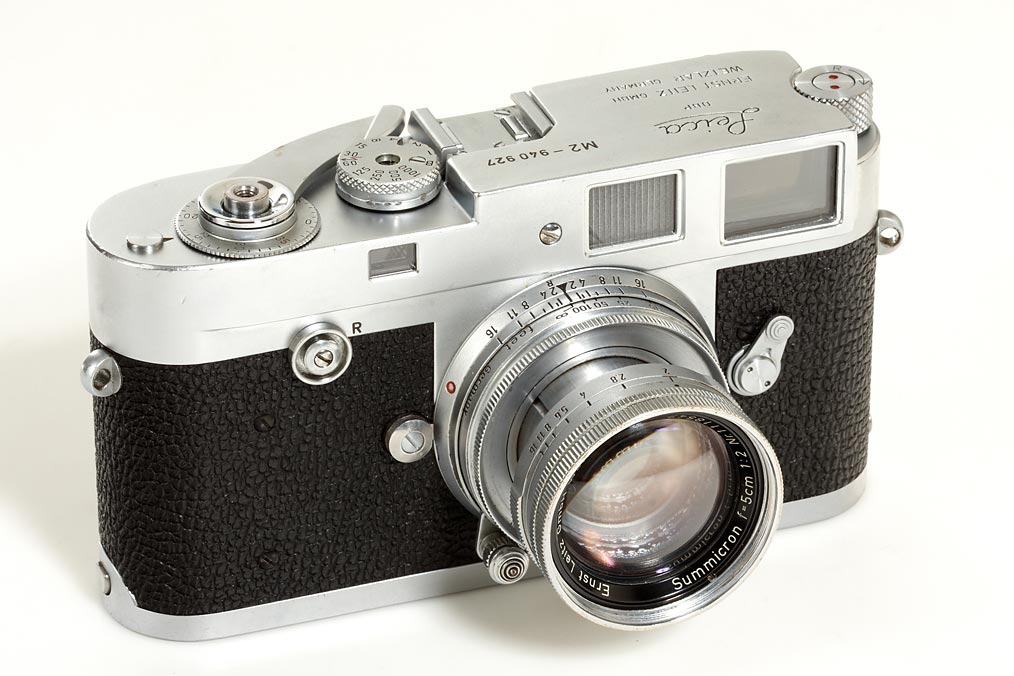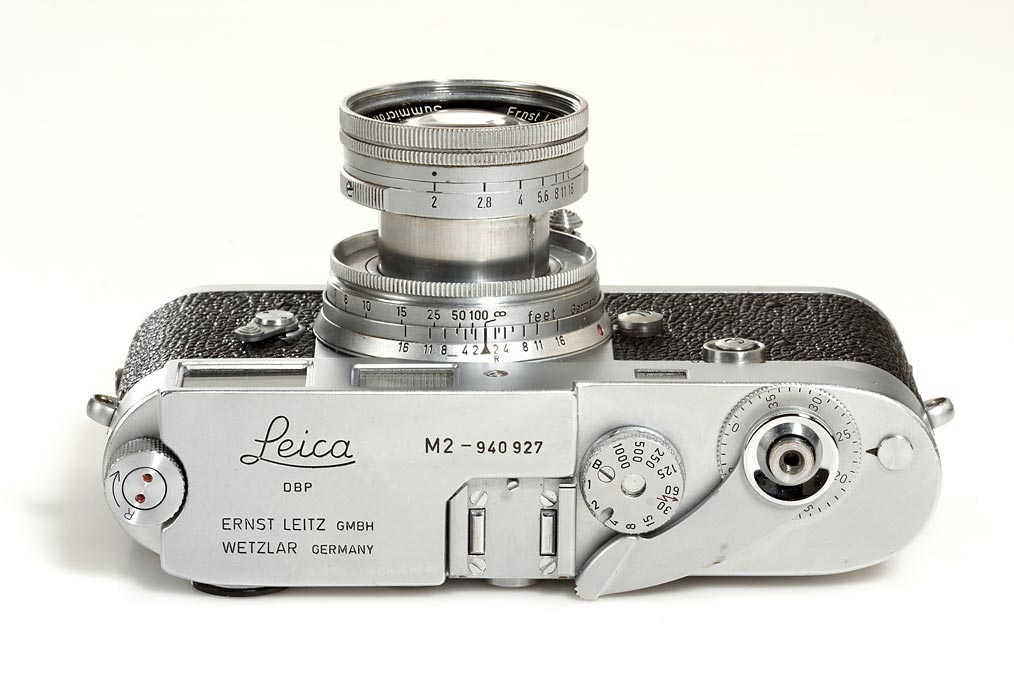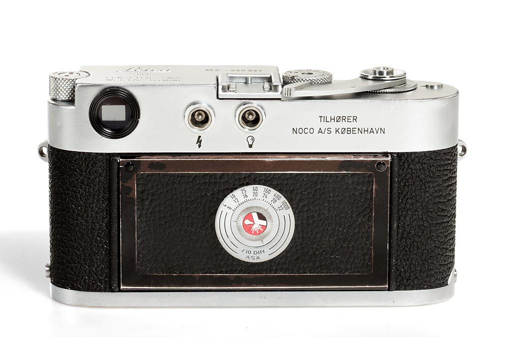 very rare Leica salesman leather case with blue velvet inlet including a Leica M-outfit: M2 body no.940927 specially engraved for the Danish Leica agent: TILHORER NOCO A/S KOBENHAVN, collapsible Summicron 2/5cm no.1118547 (with cleaning marks), Summaron 2.8/35mm no.1903971 (cond. B/A), Elmarit 2.8/90mm no.1807392, IROOA hood with cap, 12575N hood, Visoflex II with 4x prism, 16464K ring, 16469Y ring, 16471J ring, Leicameter MC, booster, FOOMI,table-tripod, two E39mm filters, strap, flash cord, paperwork regarding this outfit owned by the Leitz agency in Denmark