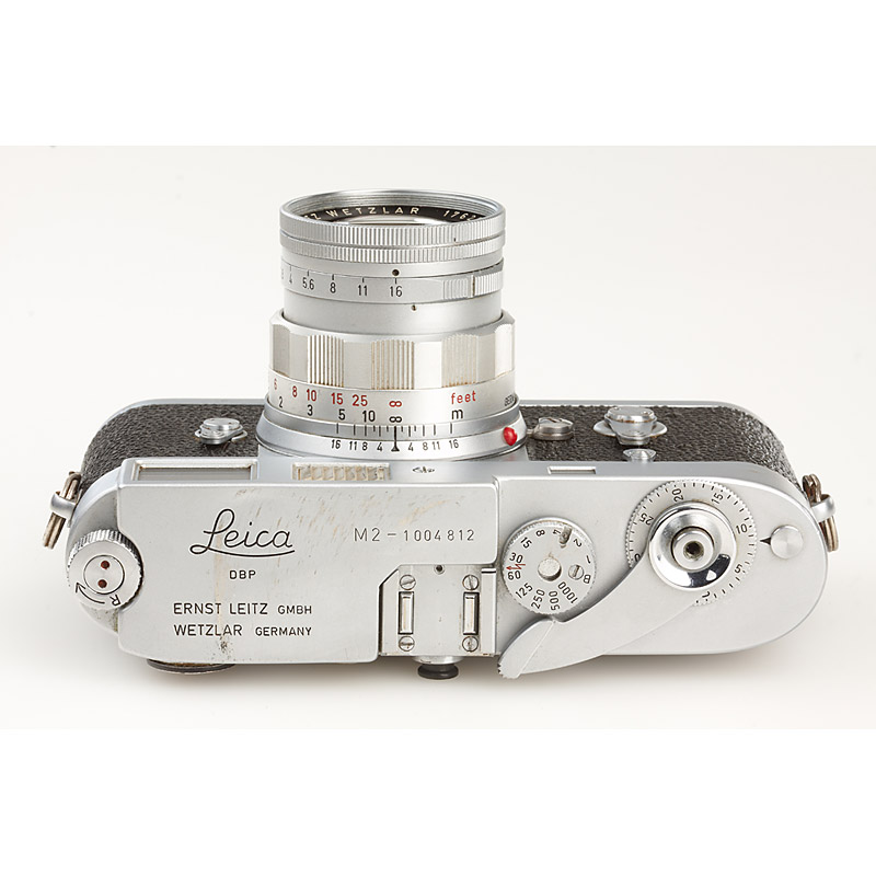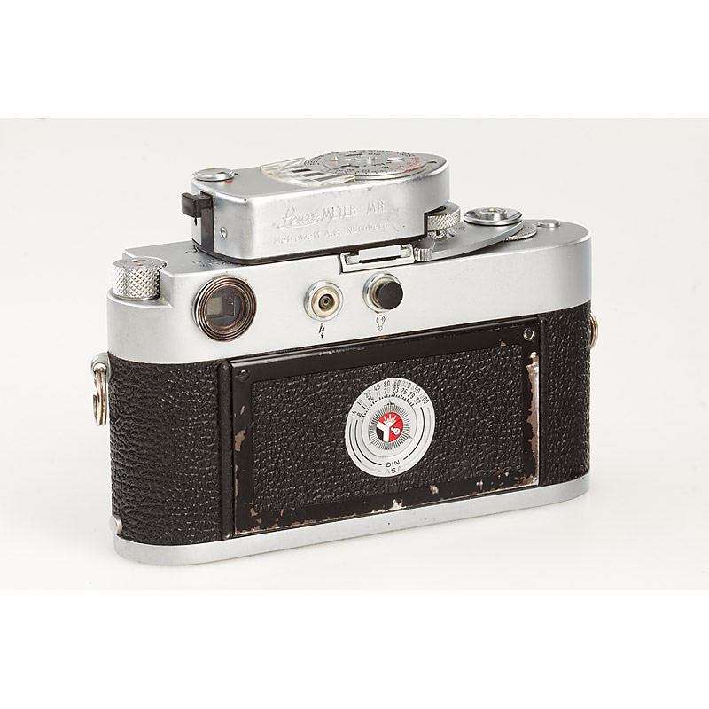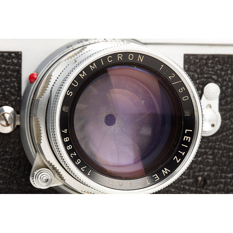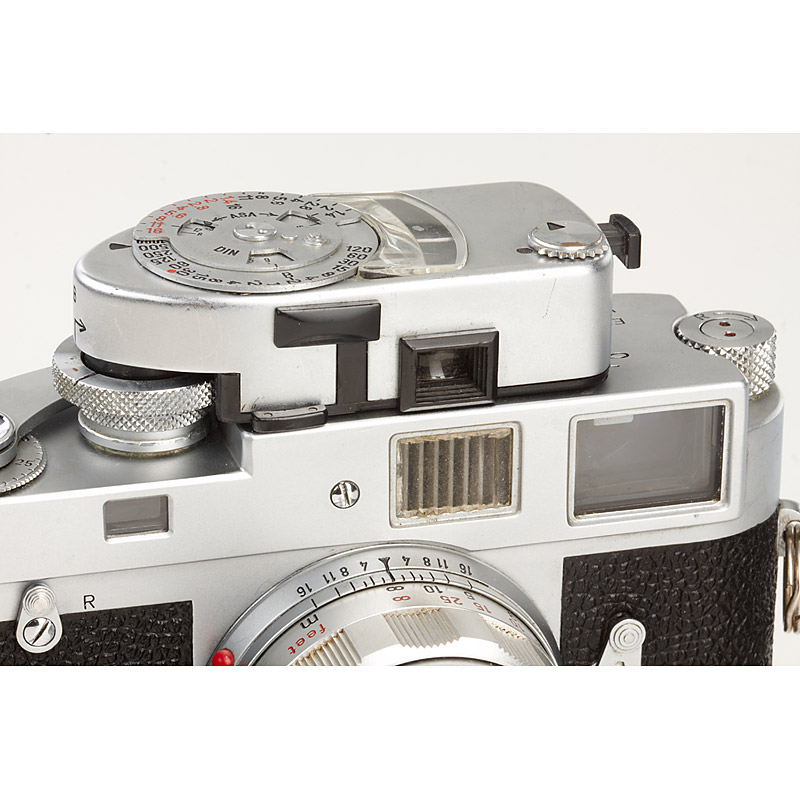 user body in working order (part of vulcanite missing), with rigid Summicron 2/50mm no.1762884 (cleaning marks), cap, Leicameter MR no.31303, everready case