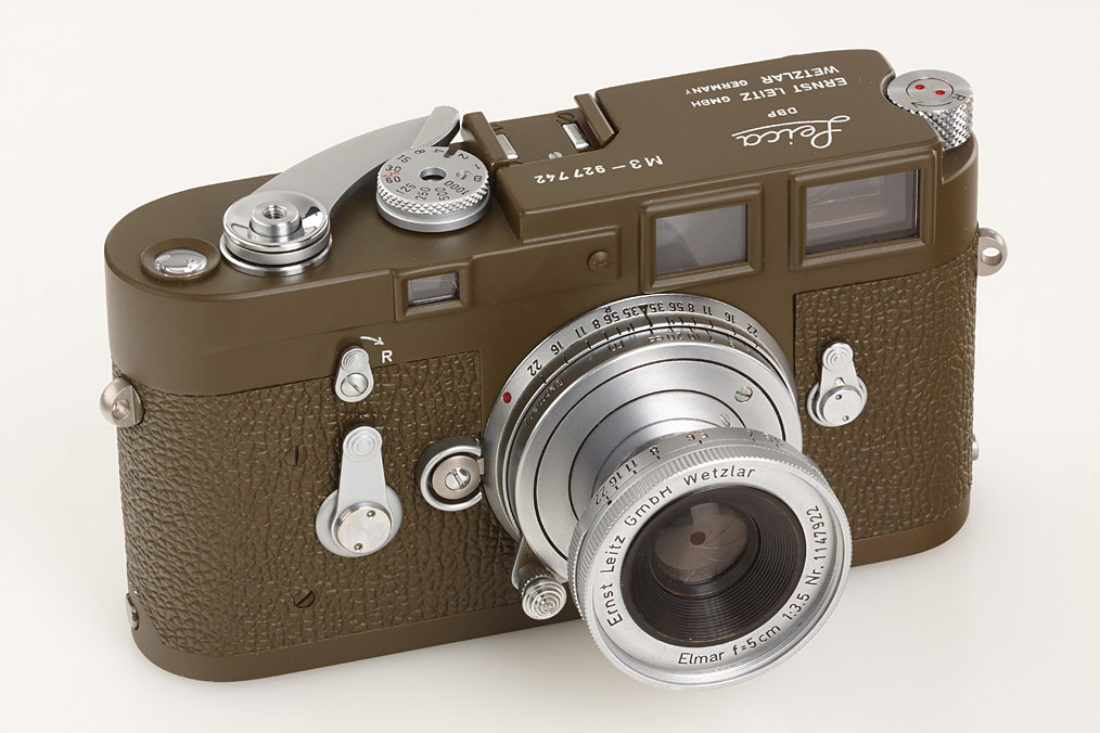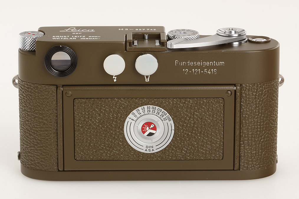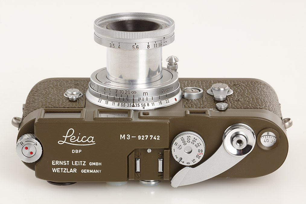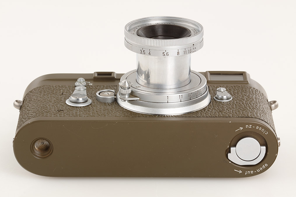 early type M3 green in restored condition, 'Bundeseigentum 12-121-5418' engraved on back of top plate, Elmar 3.5/5cm no.1147922 (cap), ITOOY hood, the original green top plate before the camera was send for restoration is also included