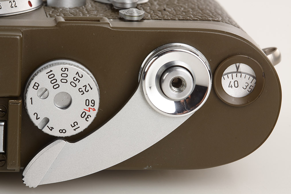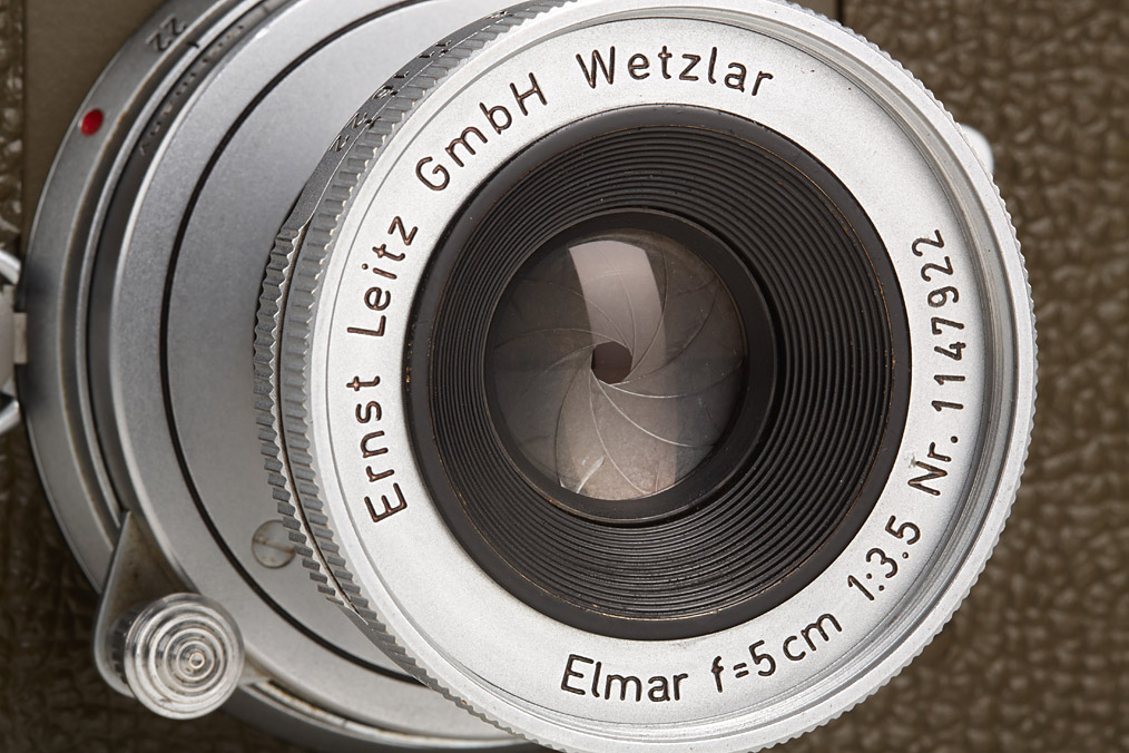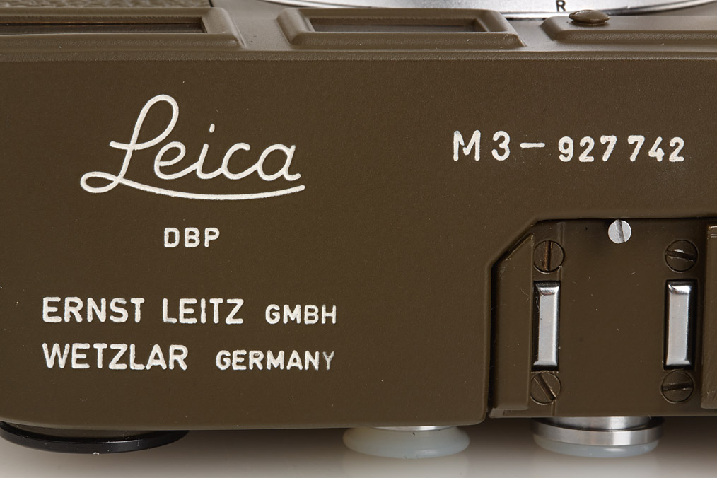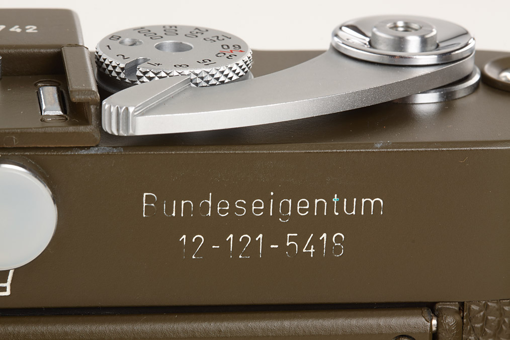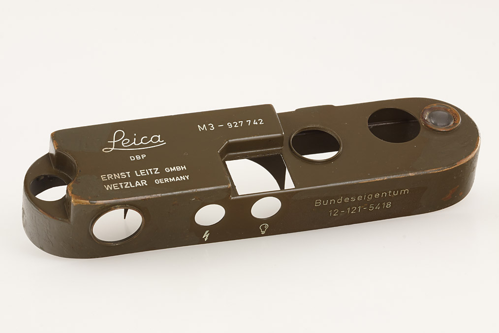 early type M3 green in restored condition, 'Bundeseigentum 12-121-5418' engraved on back of top plate, Elmar 3.5/5cm no.1147922 (cap), ITOOY hood, the original green top plate before the camera was send for restoration is also included