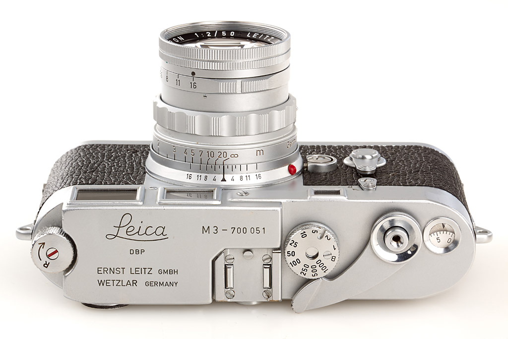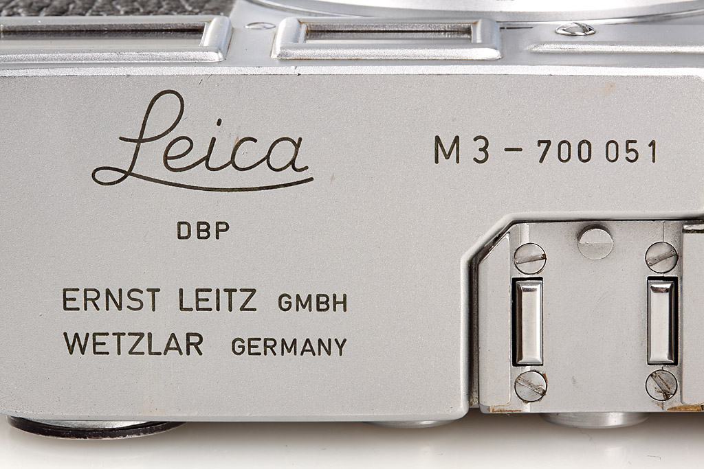 fantastic outfit including very early M3 body no.700051 in beautiful, original condition, all early features including corner on top plate, engraved 'Leica Technik 53' on rear of top plate, with 3 prototype lenses: rigid Summicron 2/50 no.000345, M3 Summicron 2/35 no.000263, Elmarit 2.8/90 no.000270 (all prototype lenses in fine condition with caps) - this was the personal camera outfit of Theo Kisselbach, directly purchased by the current owner in 1966, including the original Leitz factory invoices for M3, Summicron 2/35mm and Elmarit 2.8/90mm !