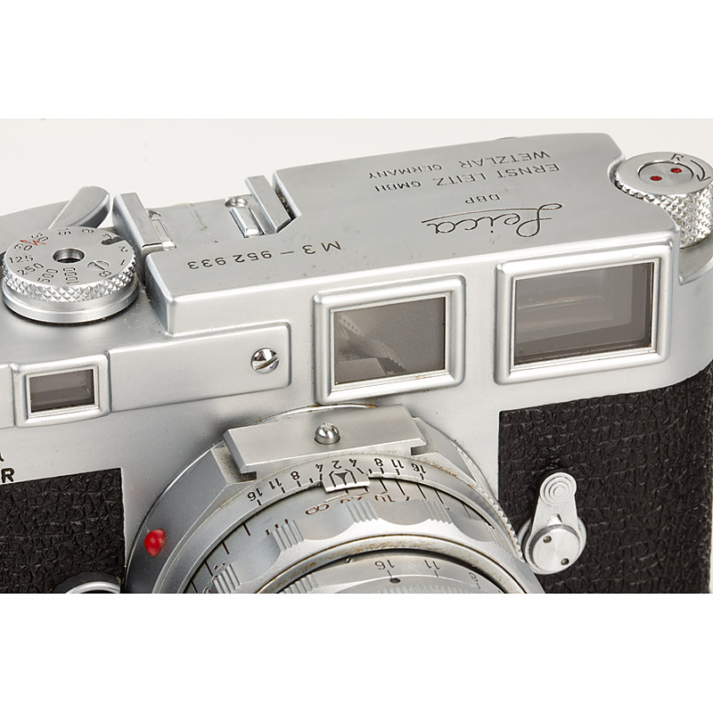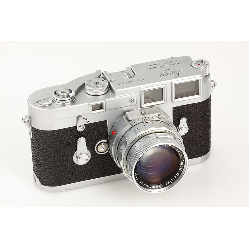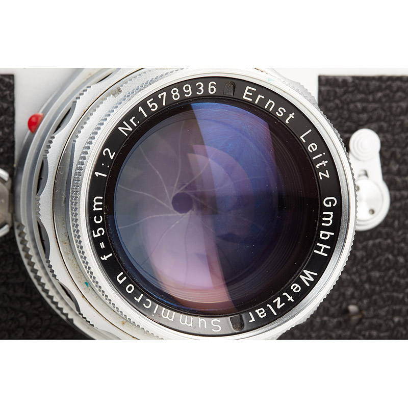 user body in good working order with CF Summicron 2/5cm no.1578936 (no spectacles, cap), everready case, chrome Elmarit 2.8/90mm no.1649101 with IUFOO hood, keeper