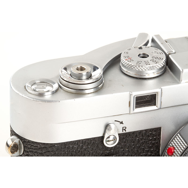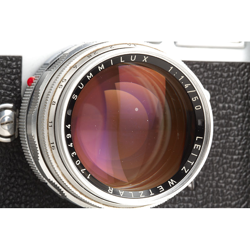 heavy used outfit including camera in working order, Summilux 1.4/50mm no.1703494 (cap, UV filter, yellow filter, XOOIM hood), Summaron 2.8/35mm no.1679150 (caps, filter, IROOA hood), Elmar 4/135mm no.1774683 (filter, caps, IUFOO hood) and Leicameter MC no.92521 (operable)
