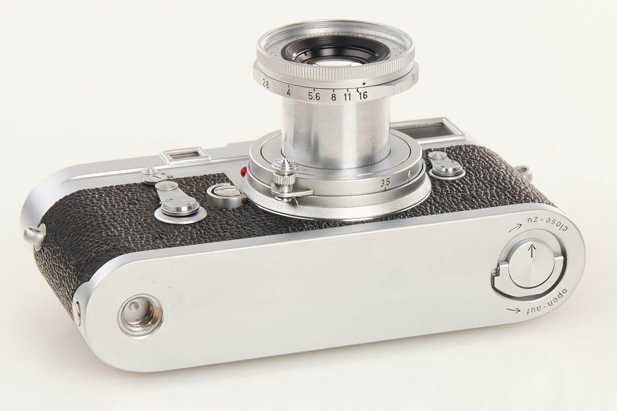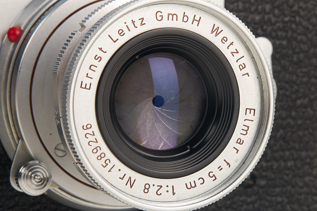 body in good working order with restored top plate, finder hazy, Elmar 2.8/5cm no.1589226 (cap)