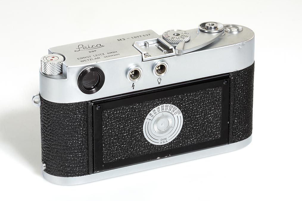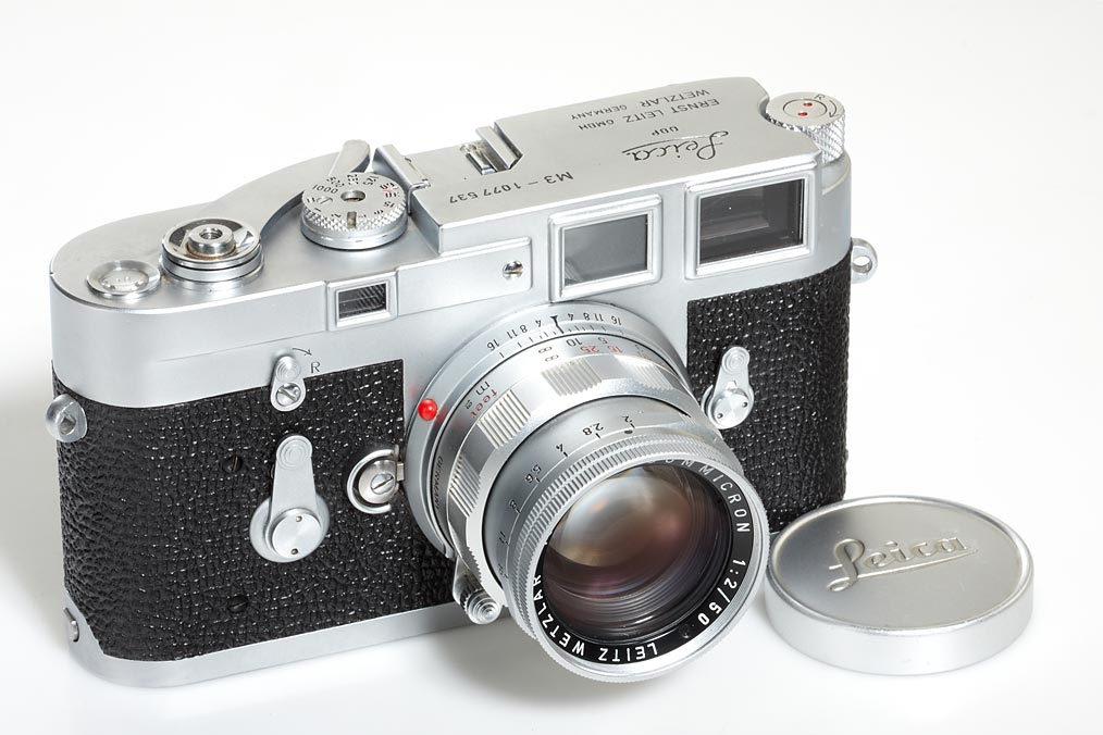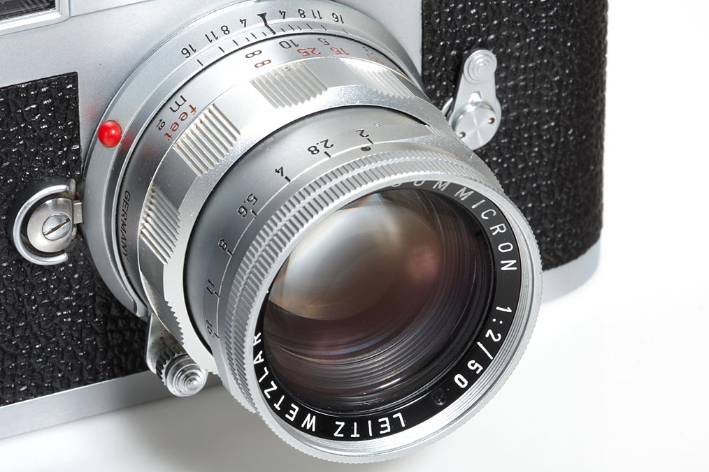 single stroke body in fine and perfect working order with rigid Summicron 2/50mm no.1924625 (clean lenses), M3 Summaron 2.8/35mm no.1815272 (cond. A-, clean lenses, caps), Elmarit 2.8/90mm no.1805153 (cond. B-, clean lenses, caps), Hektor 4.5/13.5cm no.1719298 (cond. A/B, clean lenses, caps, hood IUFOO), all in matching green leather outfit case