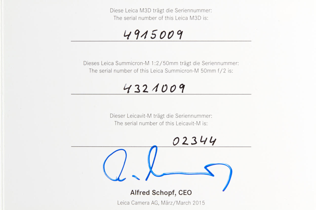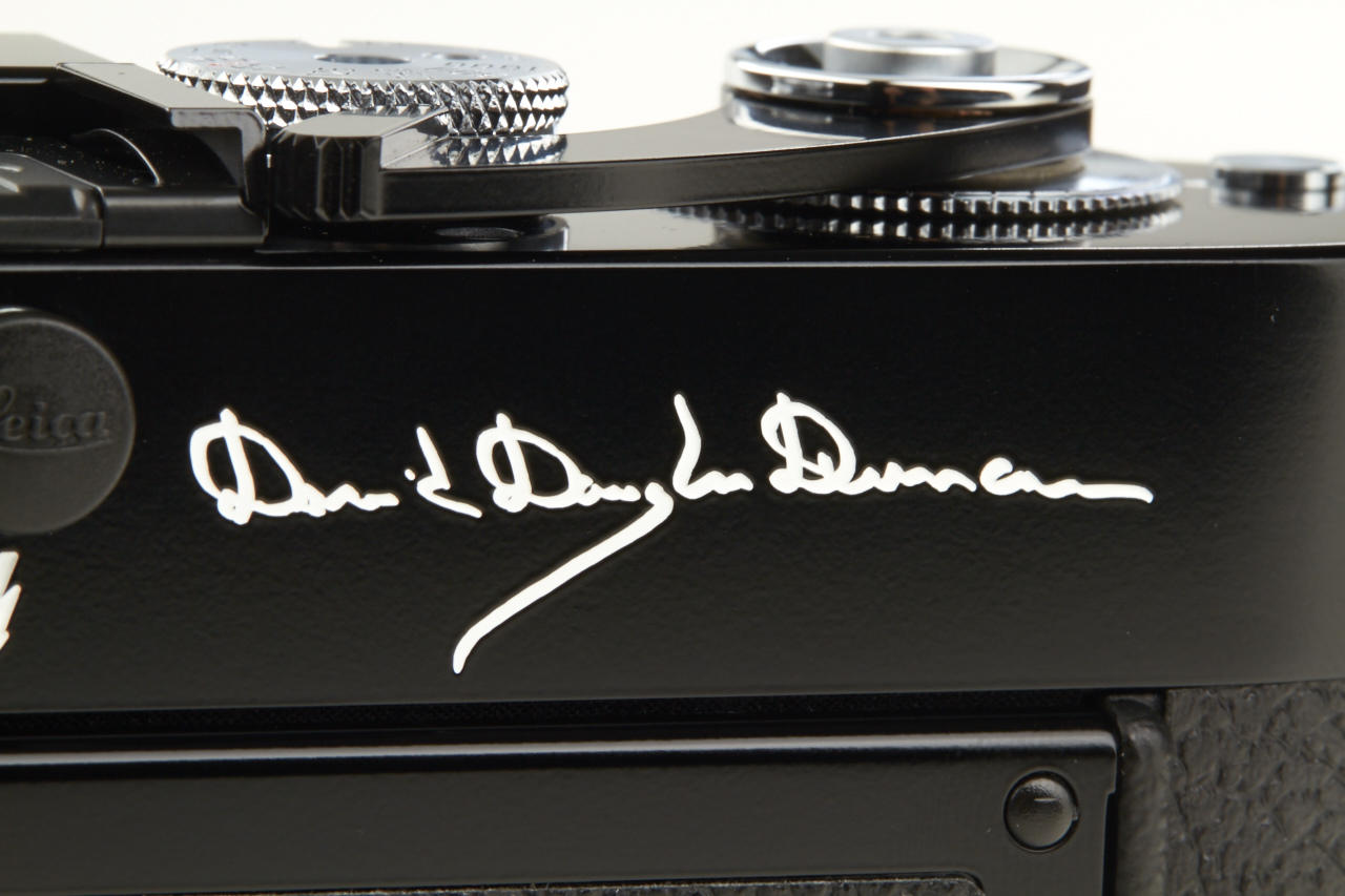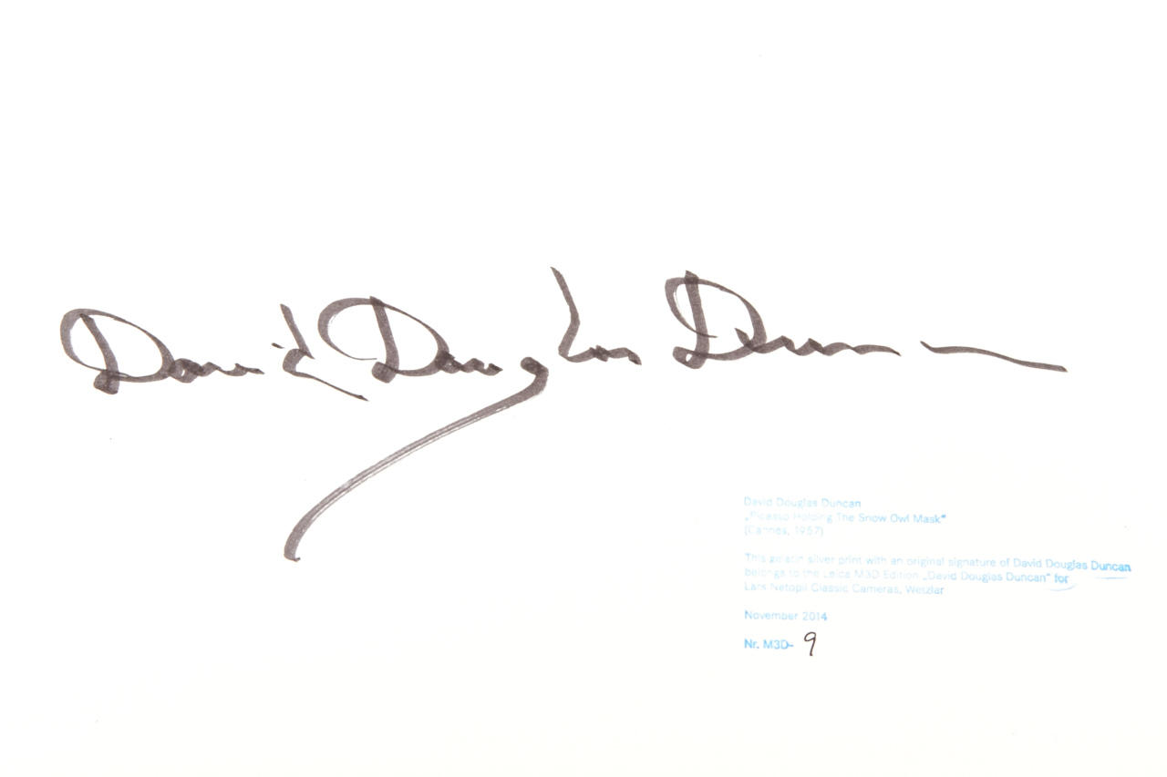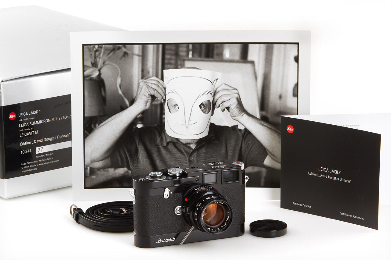 Edition of 16 cameras of an analog black paint M camera with chrome fittings (M3D-9) with Leicavit rapid wind, special black paint Summicron 2/50mm no.4321009 with focusing lever. The edition is a homage to the famous Leica M3D produced by Leitz in 1955 for the American photographer David Douglas Duncan (born 1916 in Kansas City), it comes with an Gelatine Silver Print 'Picasso holding the Snow Owl mask' (18x27cm), signed by Duncan and a photograph by Uli Koch showing DDD with the camera at the presentation in Wetzlar.